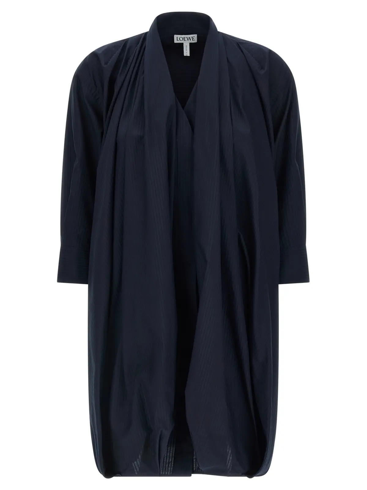 Сукня з легкого текстурованого котонового попліну вишукано драпірується, створюючи повітряний силует зі спущеними плечима та об’ємними рукавами довжиною три чверті, доповненими манжетами. Вишукана вишивка тон у тон на спині, прихована застібка на ґудзики і практичні кишені підкреслюють функціональність та бездоганну якість. Цей елегантний виріб поєднує інноваційний дизайн і універсальність, надаючи неповторний стиль і статус сучасній жінці.