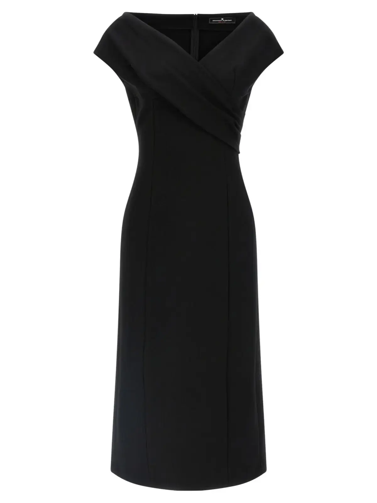 Елегантна чорна сукня Ermanno Scervino середньої довжини виконана з преміального віскозного матеріалу з додаванням поліаміду та еластану, що забезпечує ідеальну посадку та легкість рухів. Витончений дизайн із глибоким V-подібним вирізом, переднім драпіруванням та розрізом на спині підкреслює жіночність і створює вишуканий образ, який гармонійно поєднує стиль і функціональність.
