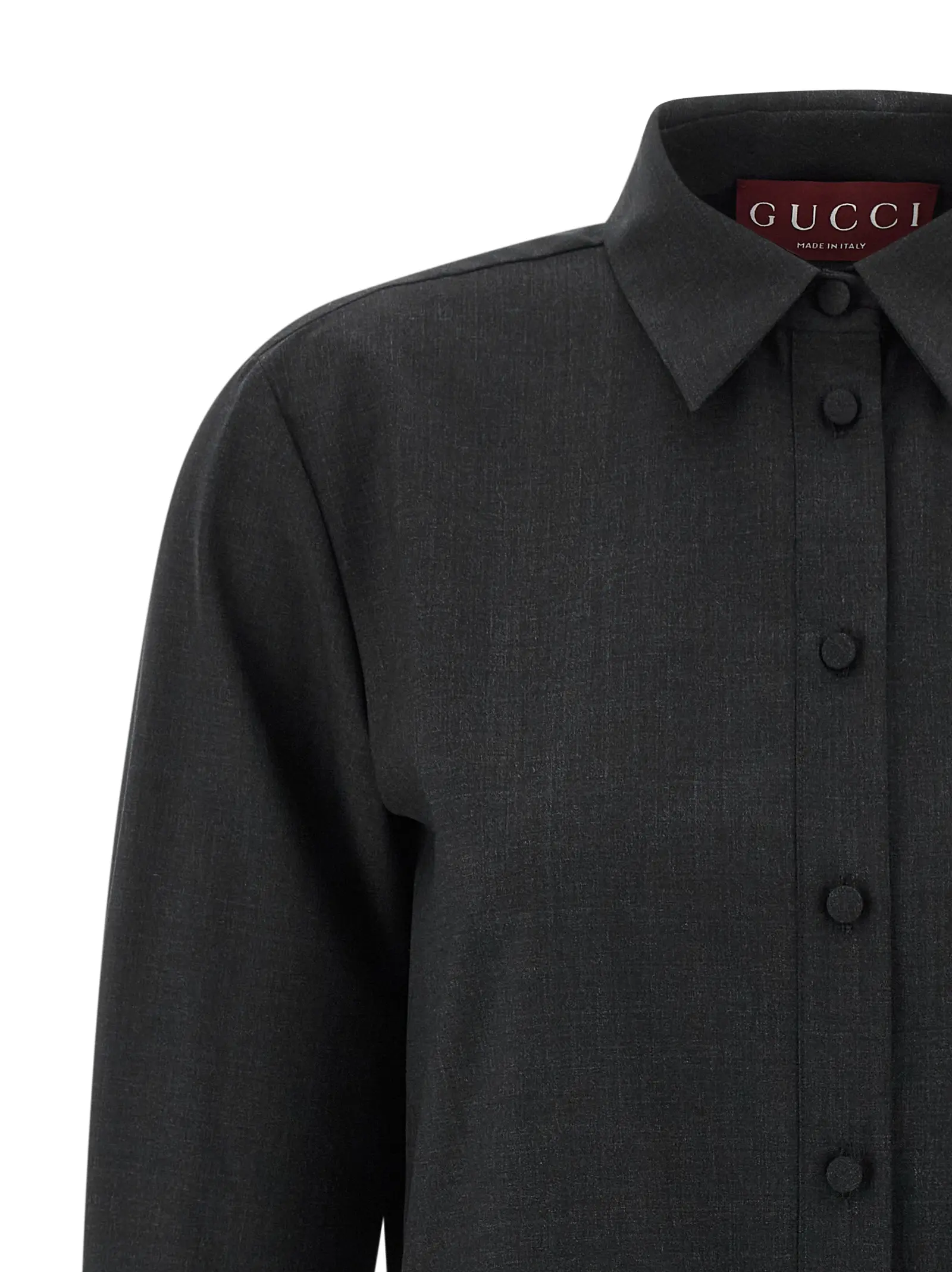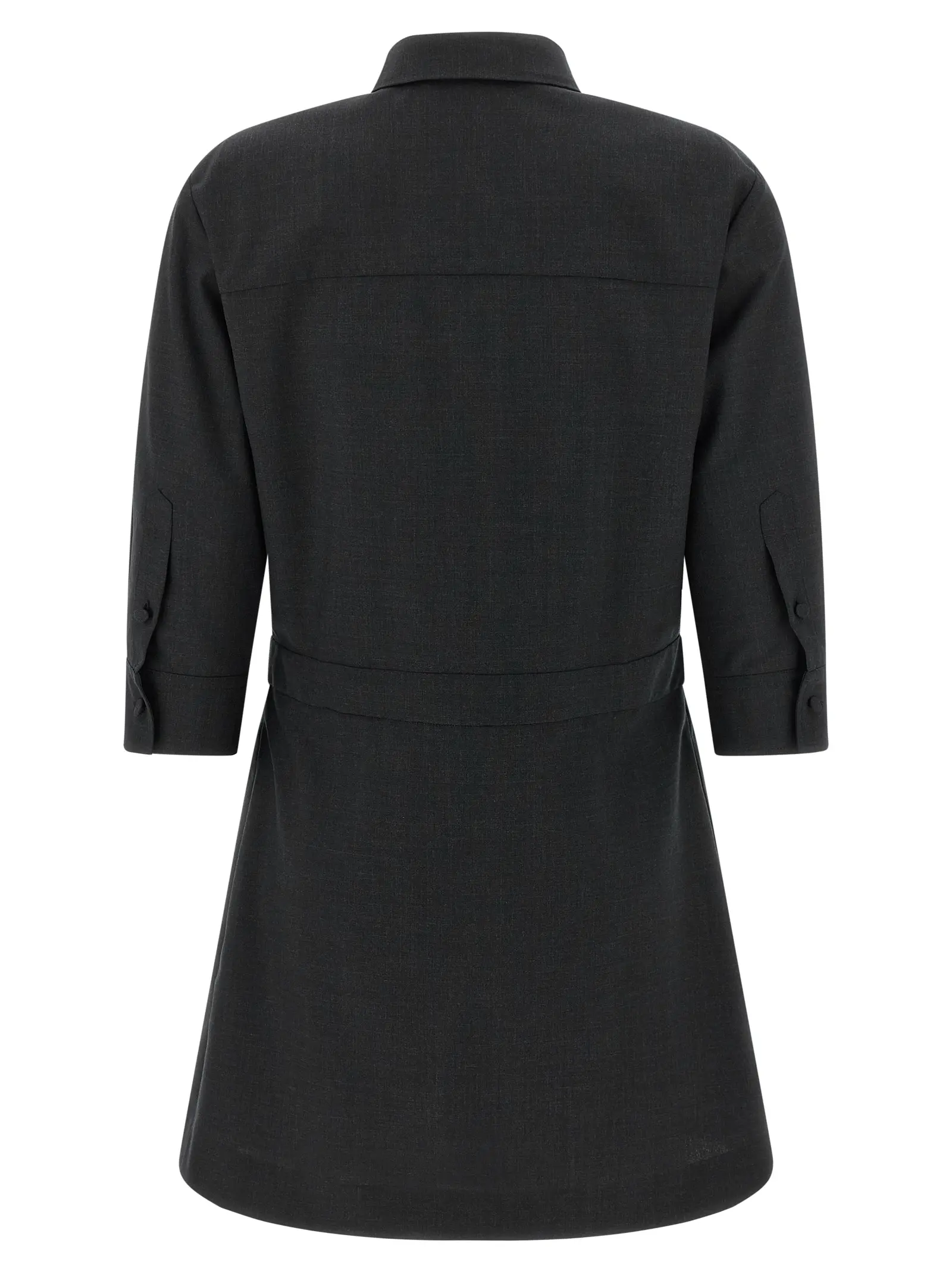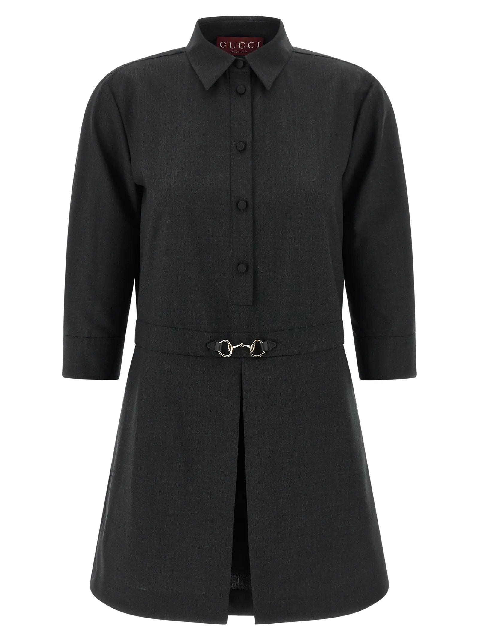 Сіра мінісукня з 100% вовни вишуканого крою сорочкового стилю з металевою деталлю Morsetto спереду, застібкою на ґудзики та спідницею з зустрічною складкою. Три чверті рукава з манжетами підкреслюють елегантність і статус, поєднуючи інноваційний дизайн із бездоганною якістю та універсальністю.