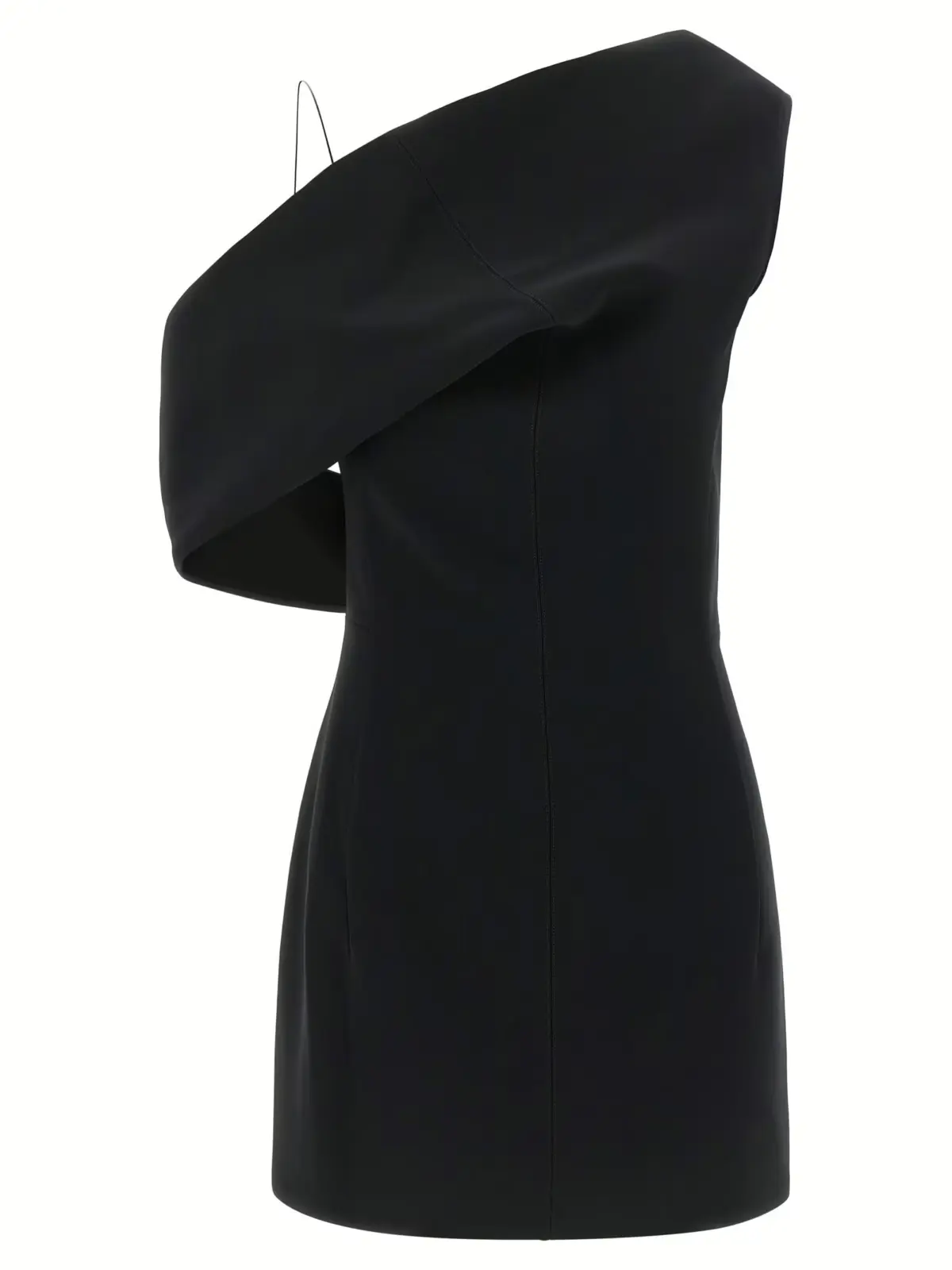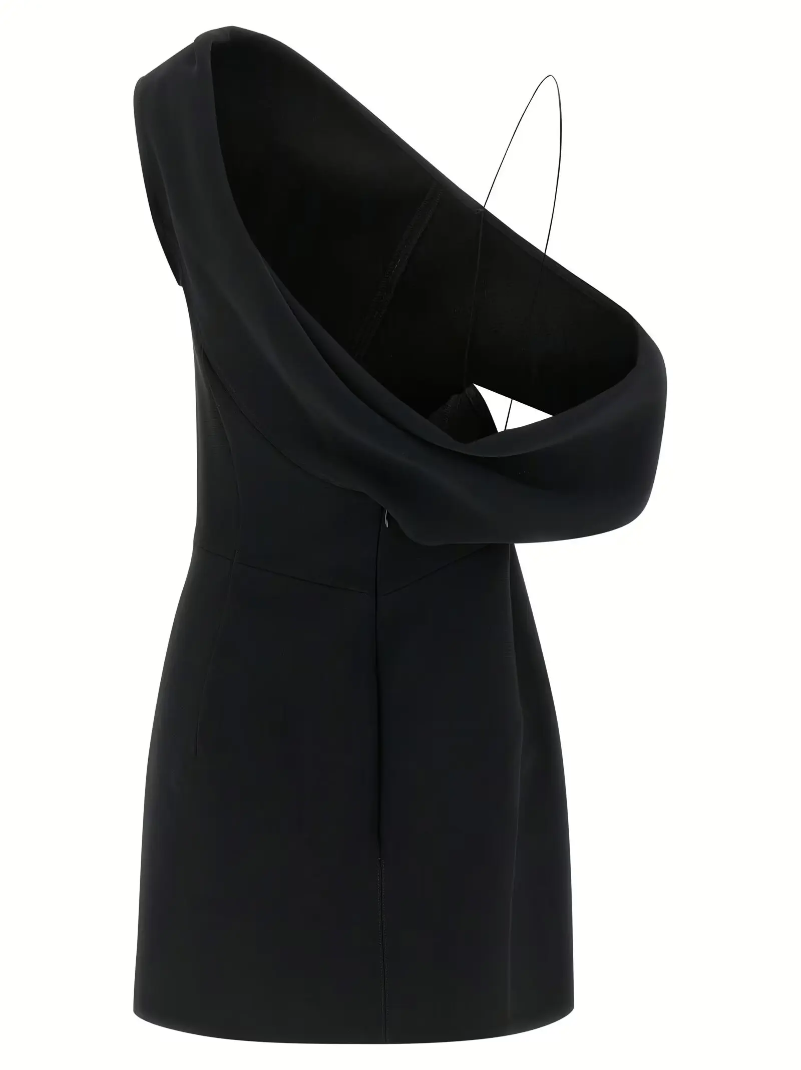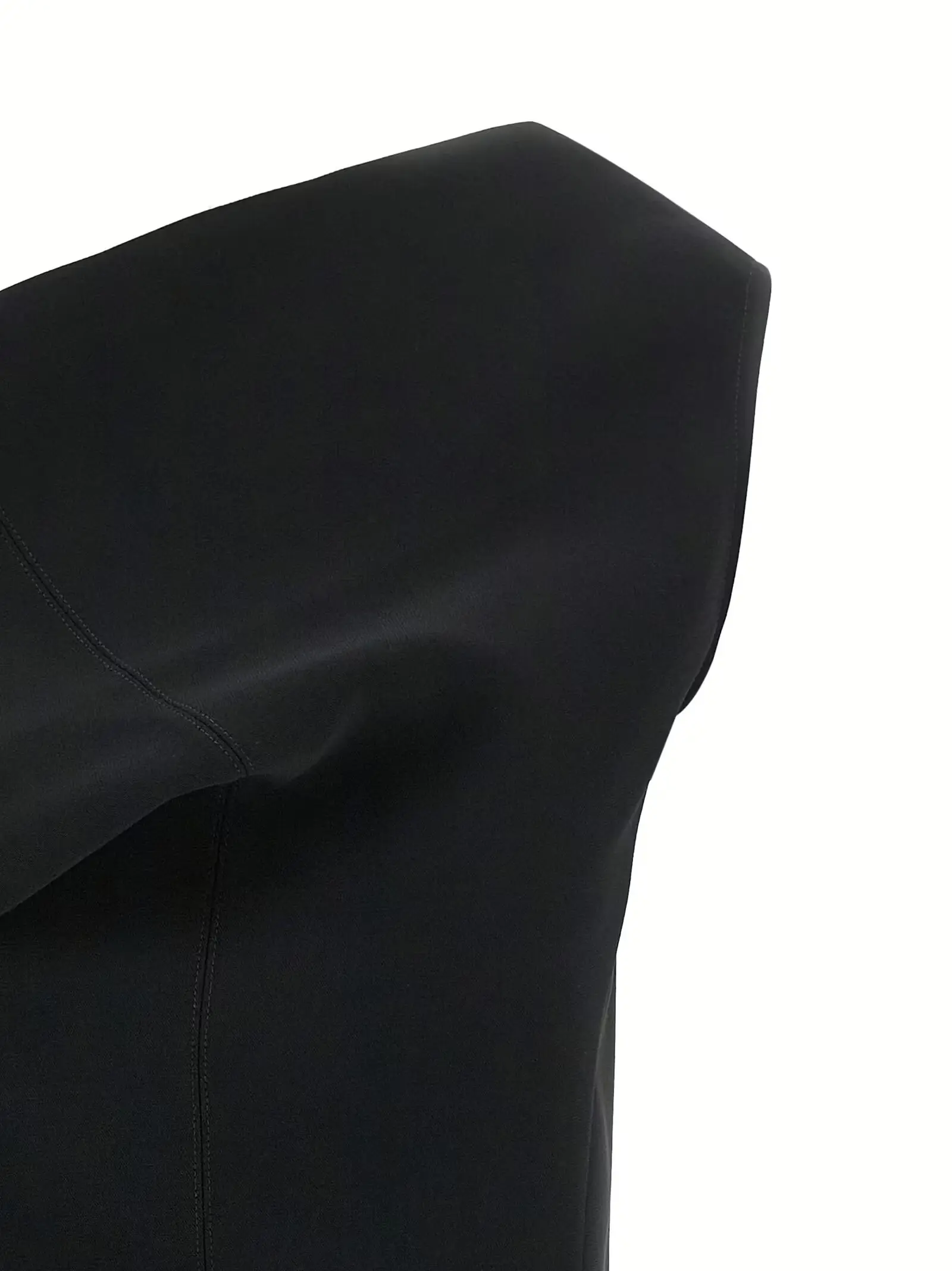 Вишукана чорна сукня із колекції La robe Pesce Courte виготовлена з високоякісної суміші поліестеру та віскози, що забезпечує комфорт і легкість. Асиметричний безрукавний крій із драпірованим вирізом та прихованою бічною застібкою підкреслює інноваційний дизайн і надає образу елегантної вишуканості й статусності, ідеально поєднуючись із різними стилями для особливих випадків.
