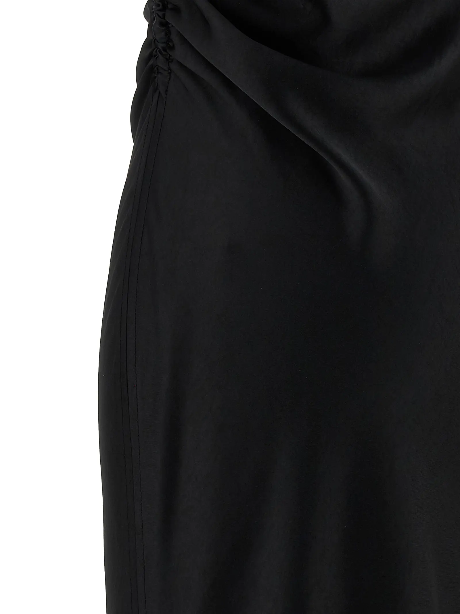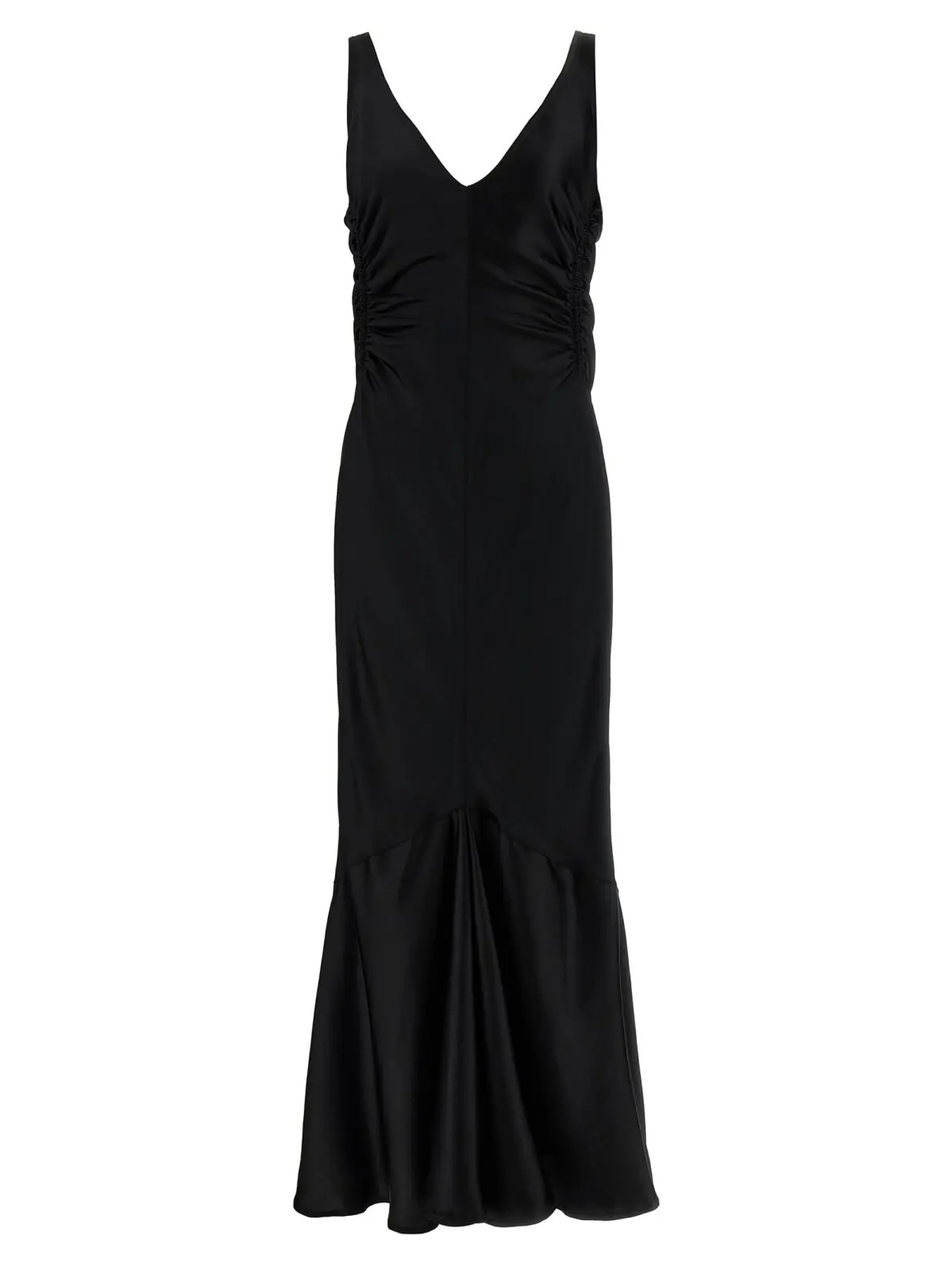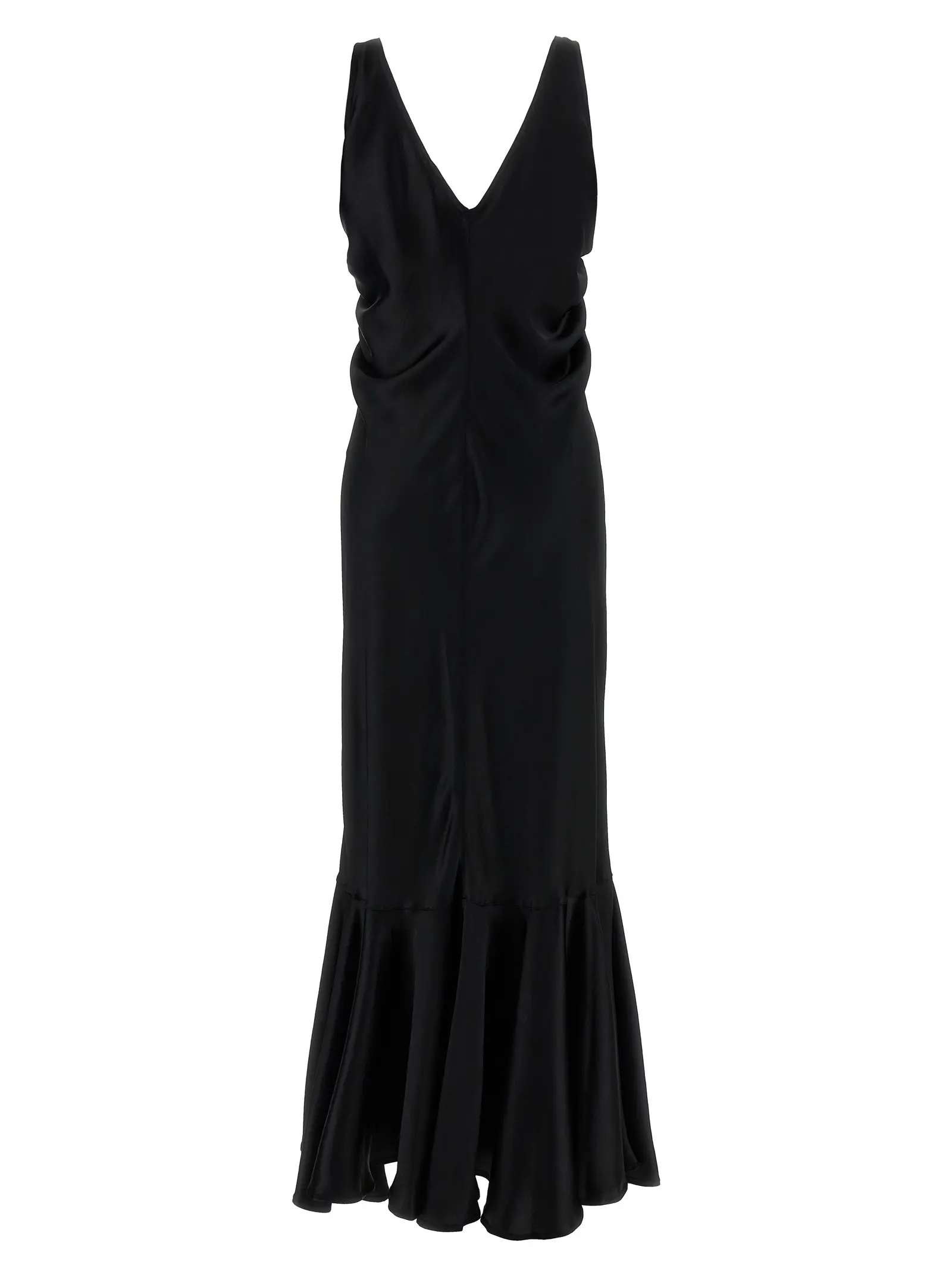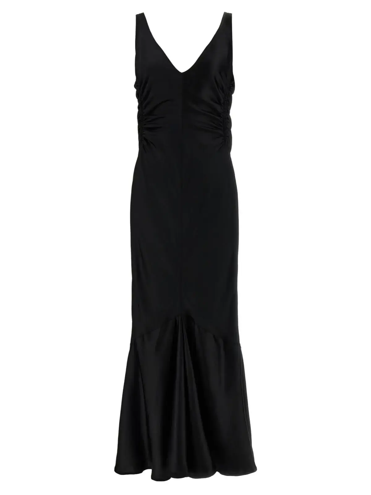 Ця довга чорна сукня зі сатину втілює витончену елегантність і сучасний стиль, поєднуючи глибокий V-подібний виріз спереду та ззаду з ефектом збірки на стегнах, що підкреслює силует. Виготовлена з високоякісного поліестеру, вона забезпечує комфорт і легкість, а кльошова спідниця з косим зрізом додає витонченості та універсальності для будь-якого статусного образу.
