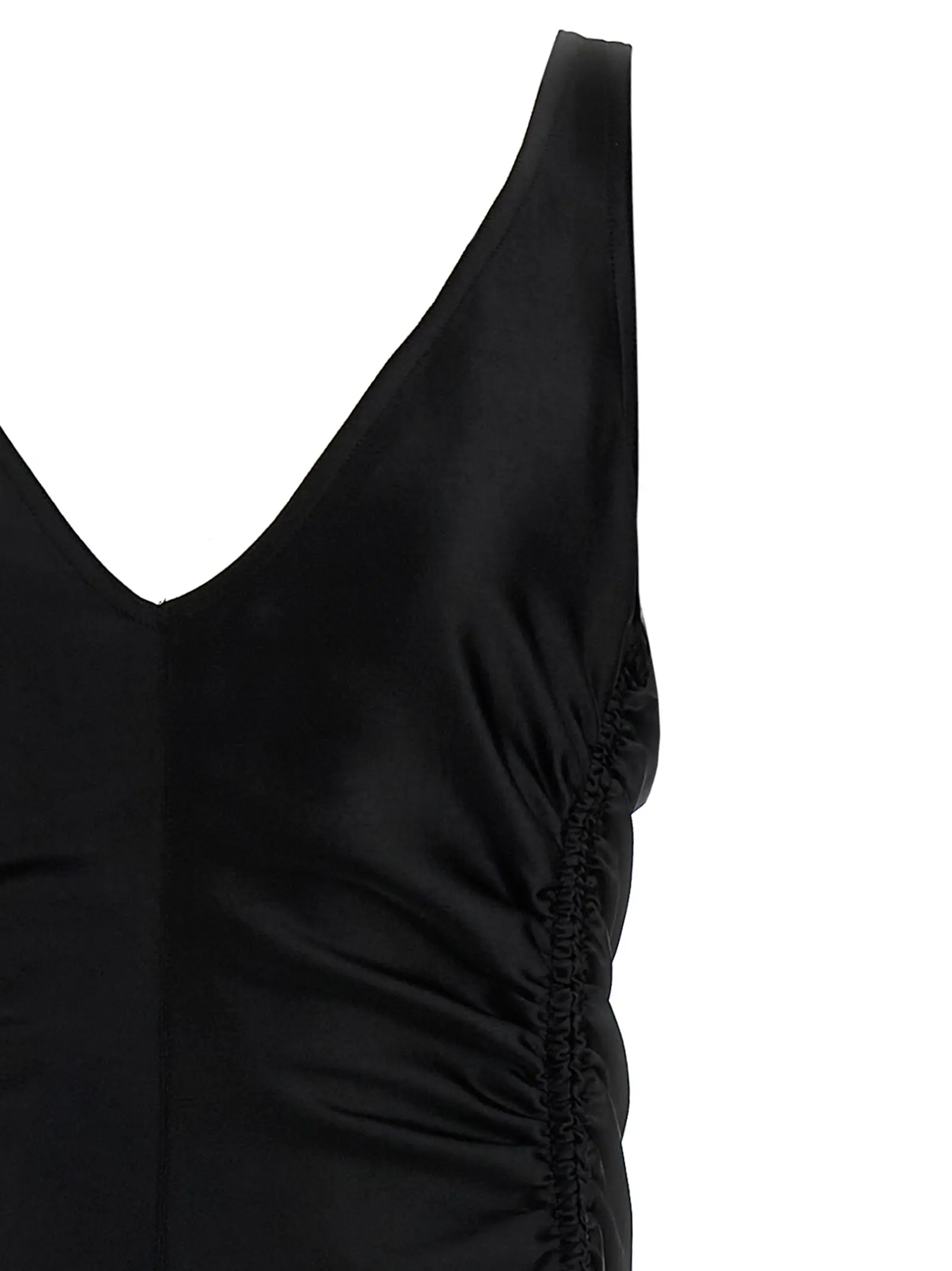 Сукня довга зі сатину. Глибокий V-подібний виріз спереду та ззаду. Стегна з ефектом збірки на резинці. Без рукавів. Спідниця кльош з косим зрізом. Матеріал 100% поліестер.