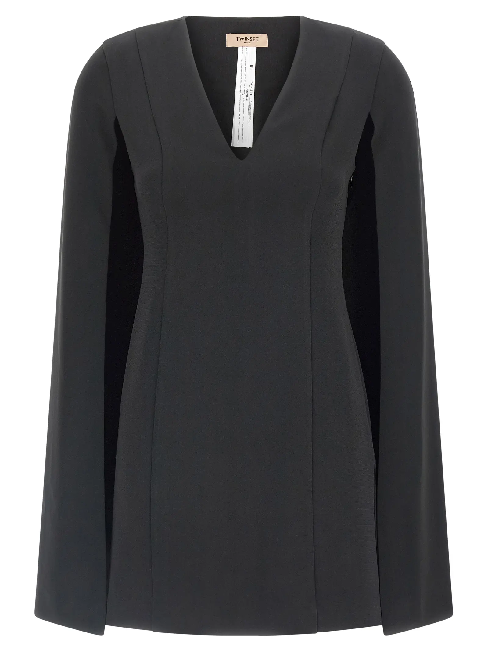 Ця чорна міні-сукня з V-подібним вирізом поєднує в собі вишуканість та сучасний стиль завдяки унікальній деталі кейпу на плечах. Виготовлена з високоякісного поєднання ацетату та поліестеру, вона забезпечує комфорт і витончену посадку, а металева емблема на спинці підкреслює її преміальний статус. Застібка-блискавка збоку додає практичності, роблячи цю модель ідеальним вибором для впевнених у собі модниць.