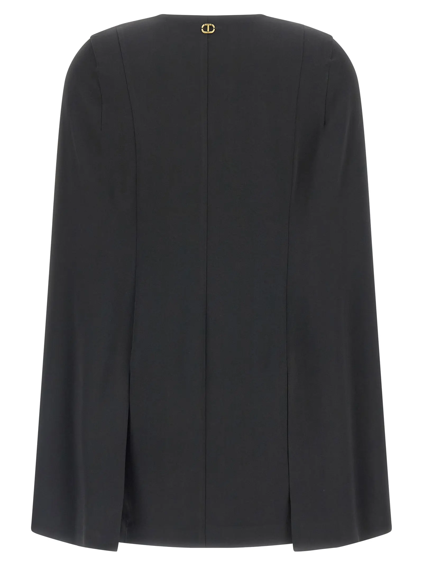 Міні-сукня з V-подібним вирізом. Застібка-блискавка збоку. Без рукавів з деталлю у вигляді кейпу на плечах. Металевий логотип на спинці. Підкладка присутня. Склад тканини 70% ацетат, 30% поліестер.