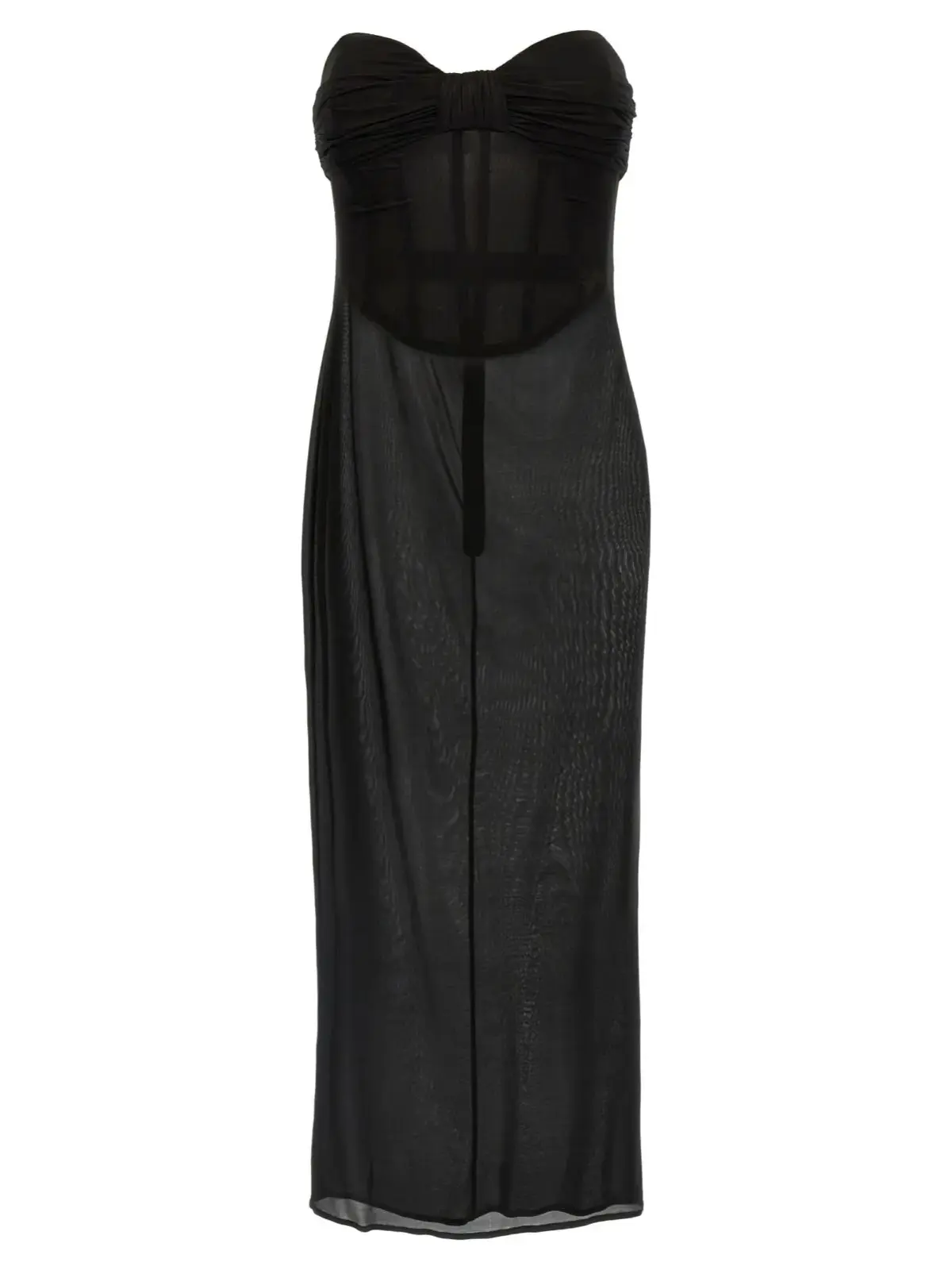 Сукня Magda Butrym 27 в чорному кольорі — це витвір мистецтва, який поєднує в собі елегантність і сучасність. Виготовлена з інноваційного матеріалу, що складається з 92% купро та 8% еластану, вона забезпечує чудову посадку та комфорт. Модель з відкритими плечима, з драпіруванням на грудях та інтегрованим бюстьє, підкреслює жіночність і статус. Задня застібка на блискавці додає зручності, а класичний midi крій робить цю сукню універсальним вибором для будь-якої події. Висока якість виготовлення та стильний дизайн роблять цю сукню ідеальним доповненням до вашого гардеробу.