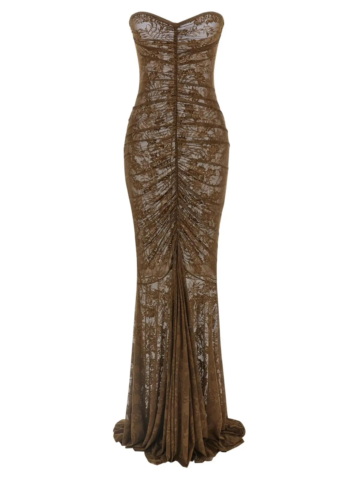 Вишукана сукня зелена в стилі русалки з напівпрозорого еластичного мережива, що ідеально облягає фігуру, відкриває плечі та підкреслює витонченість силуету завдяки довгому шлейфу. Поєднує інноваційні матеріали з бездоганним дизайном, даруючи неповторний статус і вишуканий стиль для особливих подій.