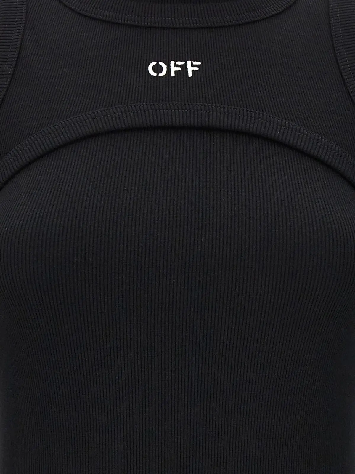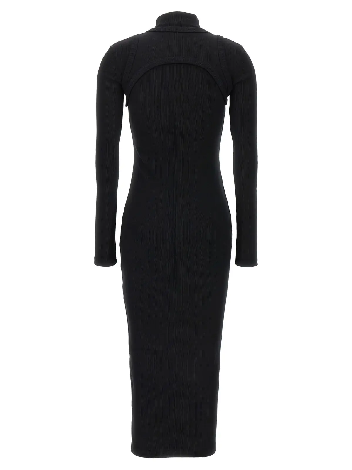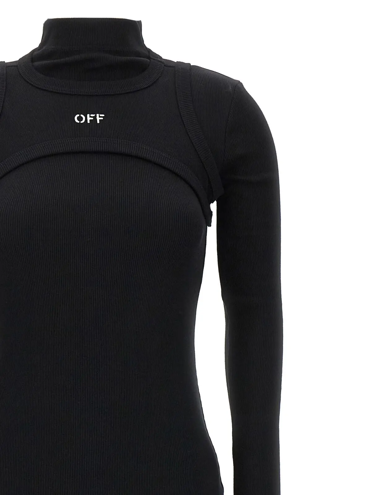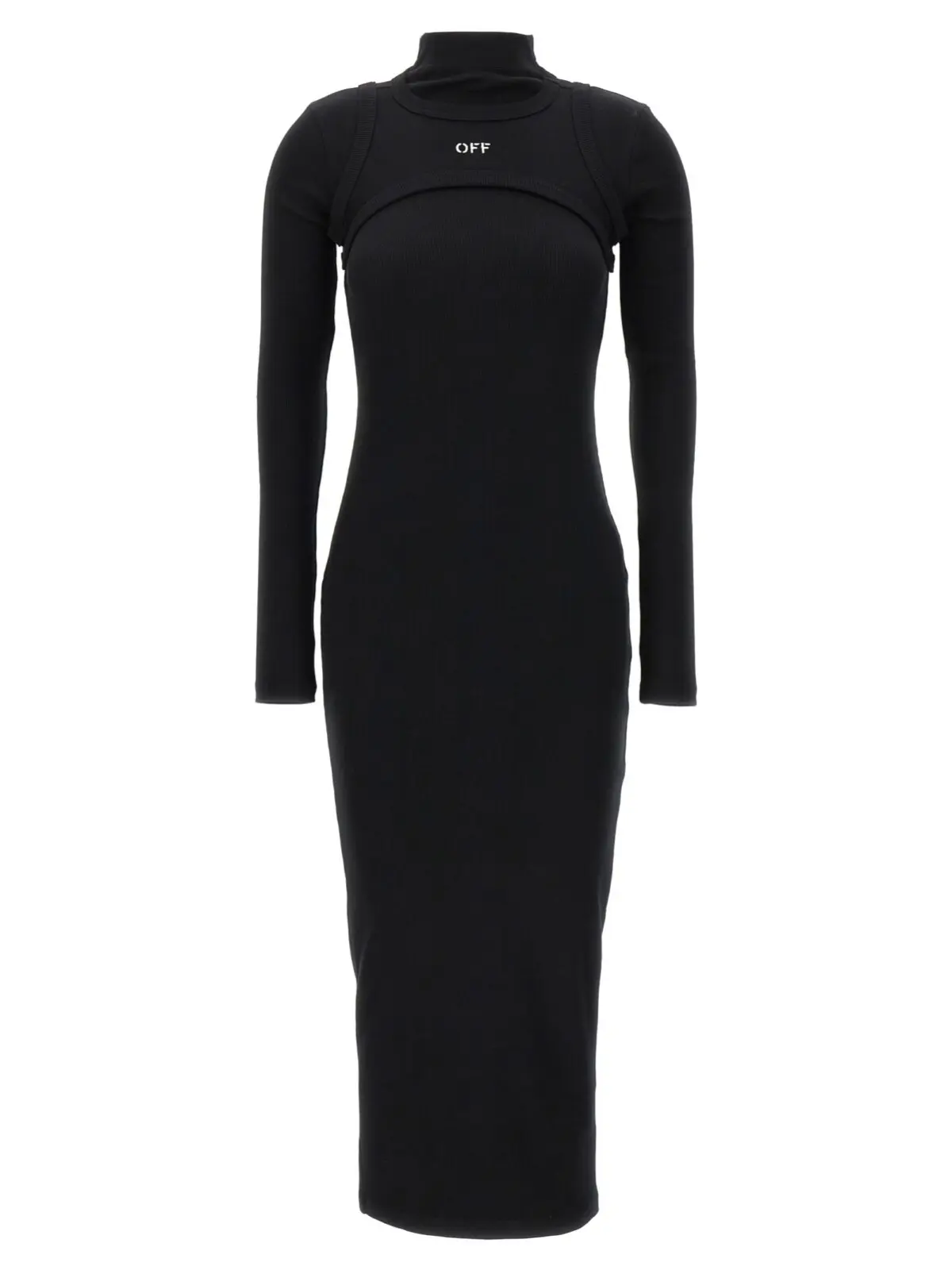 Жіноча чорна сукня Off-White ‘Off stamp’ виконана зі стрейч-бавовни, має довгу модель з довгими рукавами та круглим вирізом. Верхня частина сукні нагадує корсет і прикрашена вишитим логотипом. Склад тканини: 98% бавовна, 2% еластан.