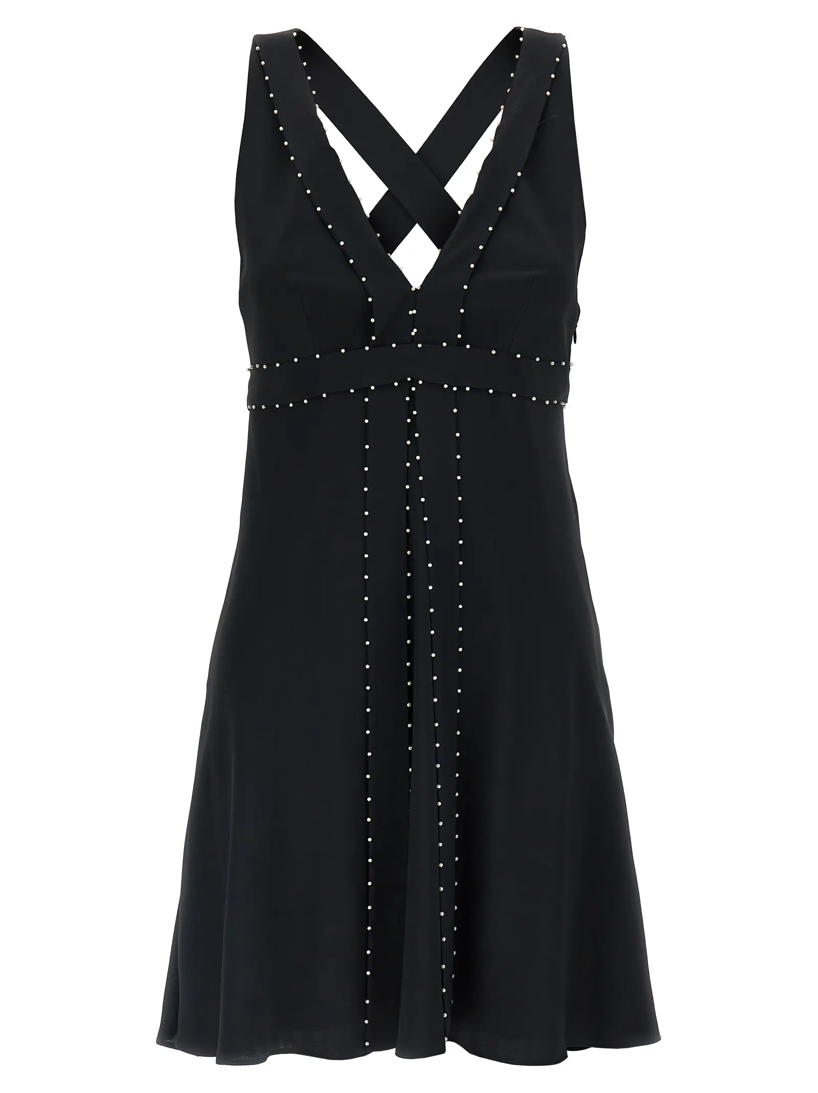 Чорна міні сукня зі шовкової суміші з вишуканими міні аплікаціями з перлин підкреслює витонченість і сучасний стиль. Глибокий V-подібний виріз і широкі перекреслені бретелі на спині створюють неповторний силует, а безрукавний фасон і бокова застібка на блискавку забезпечують комфорт та функціональність. В комплекті з елегантною підсукнею, ця сукня є ідеальним вибором для впевнених у собі жінок, що цінують якість і статус.