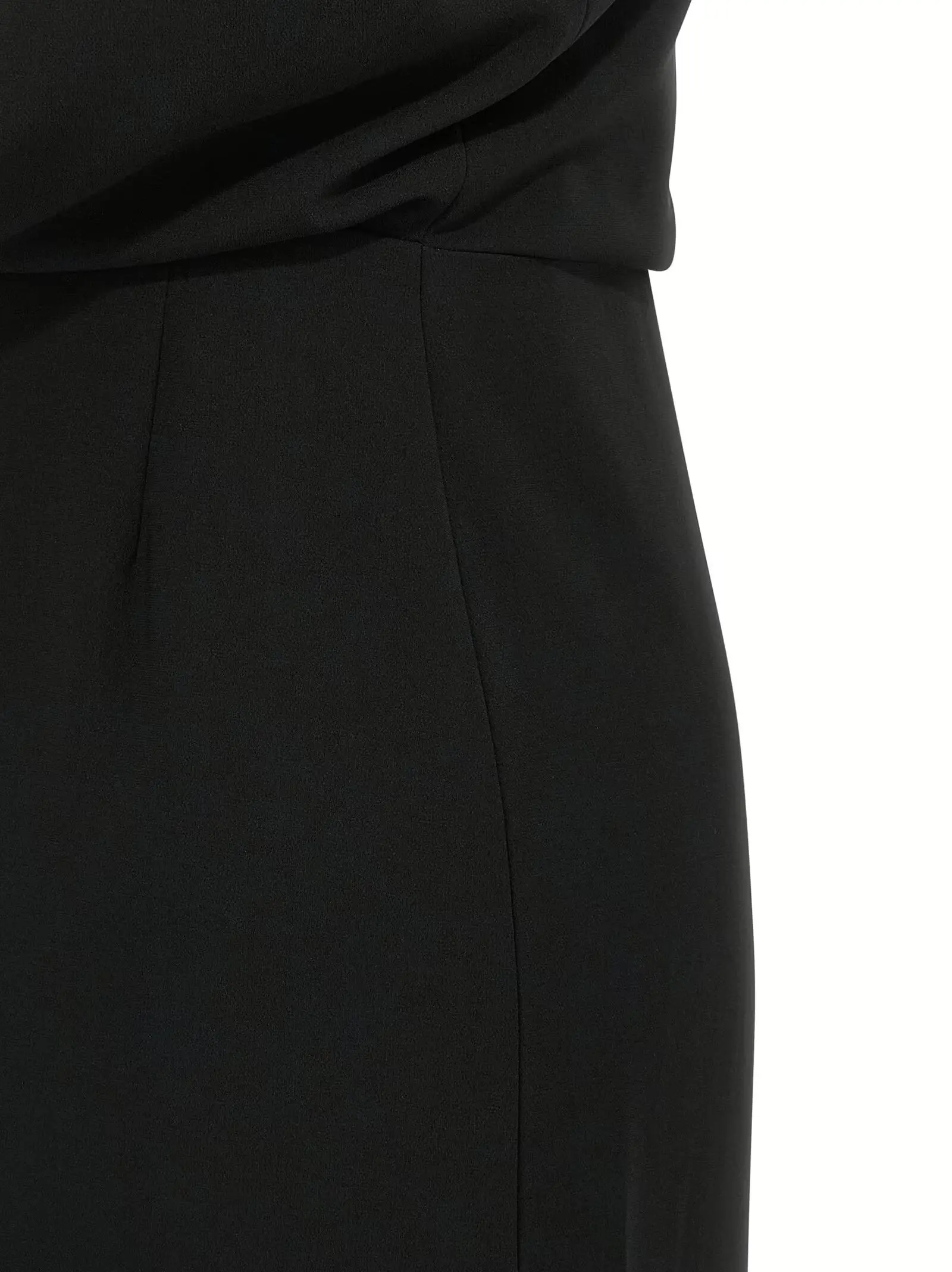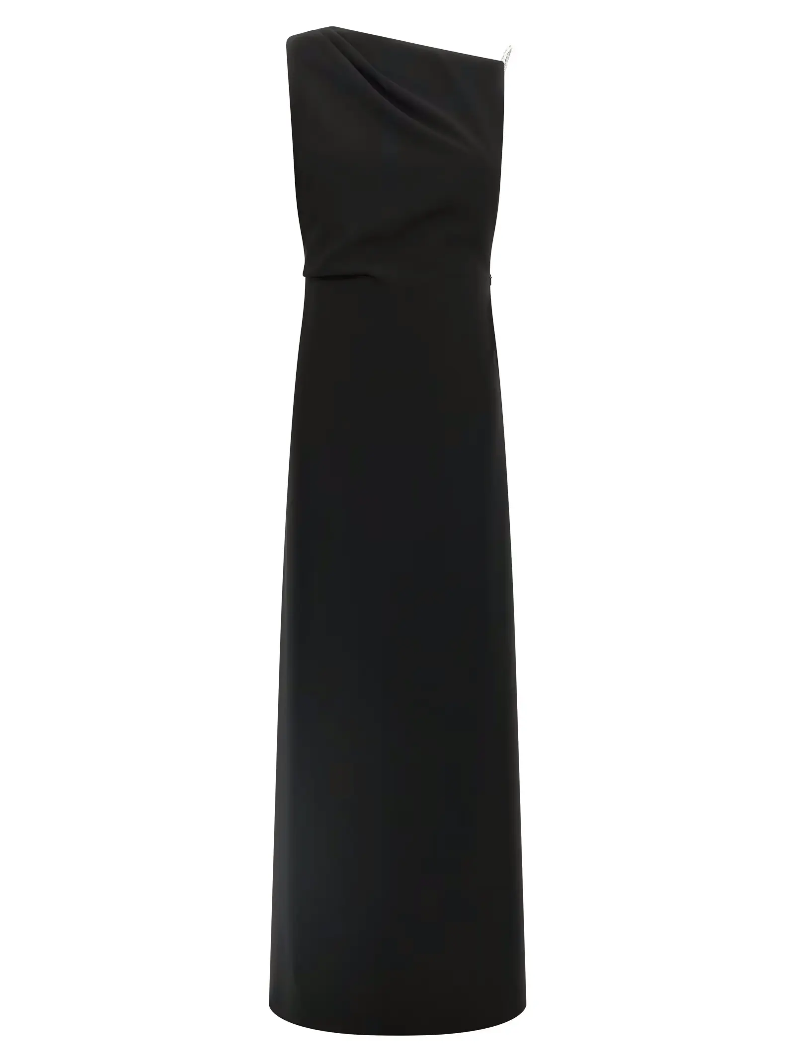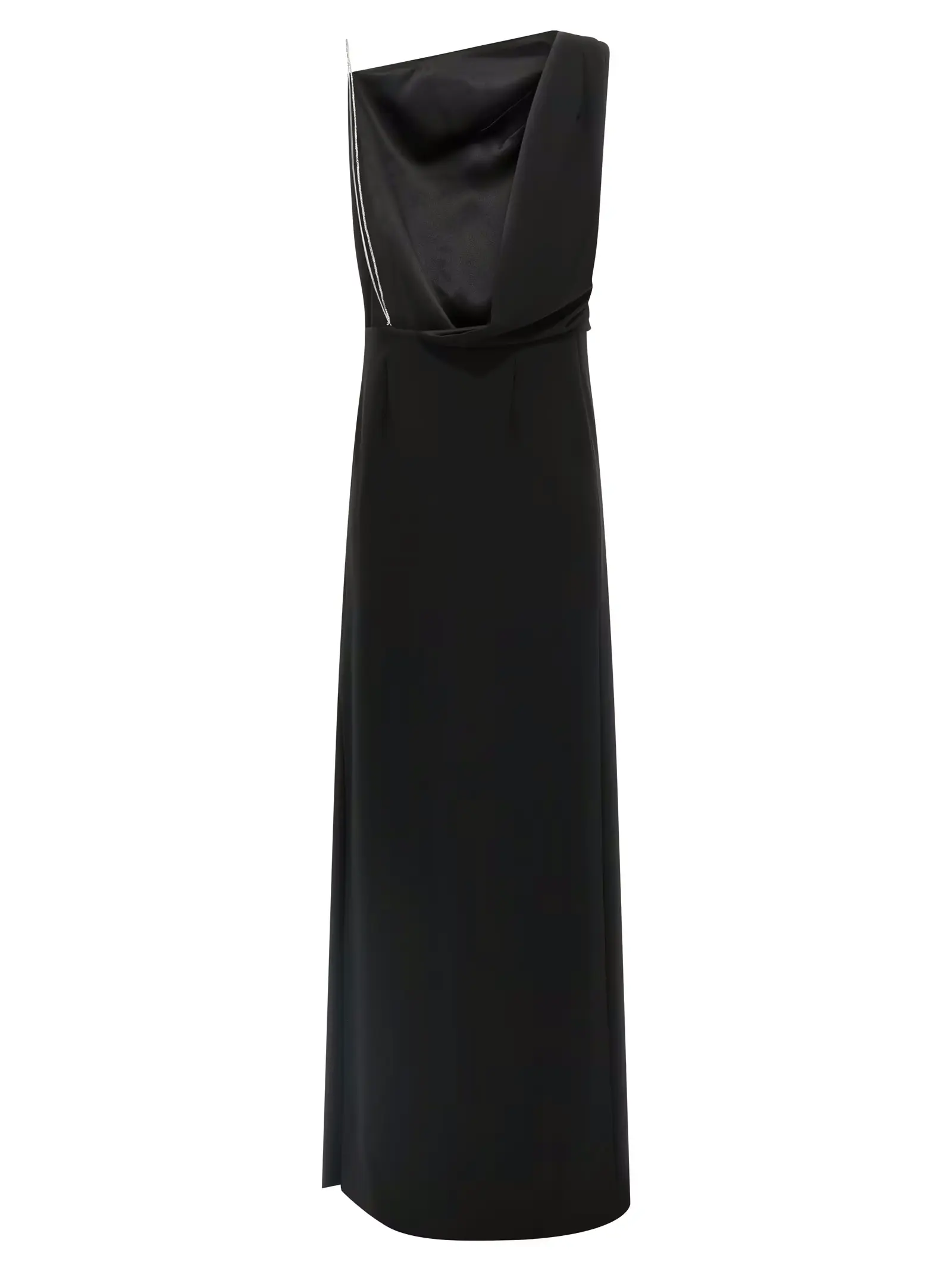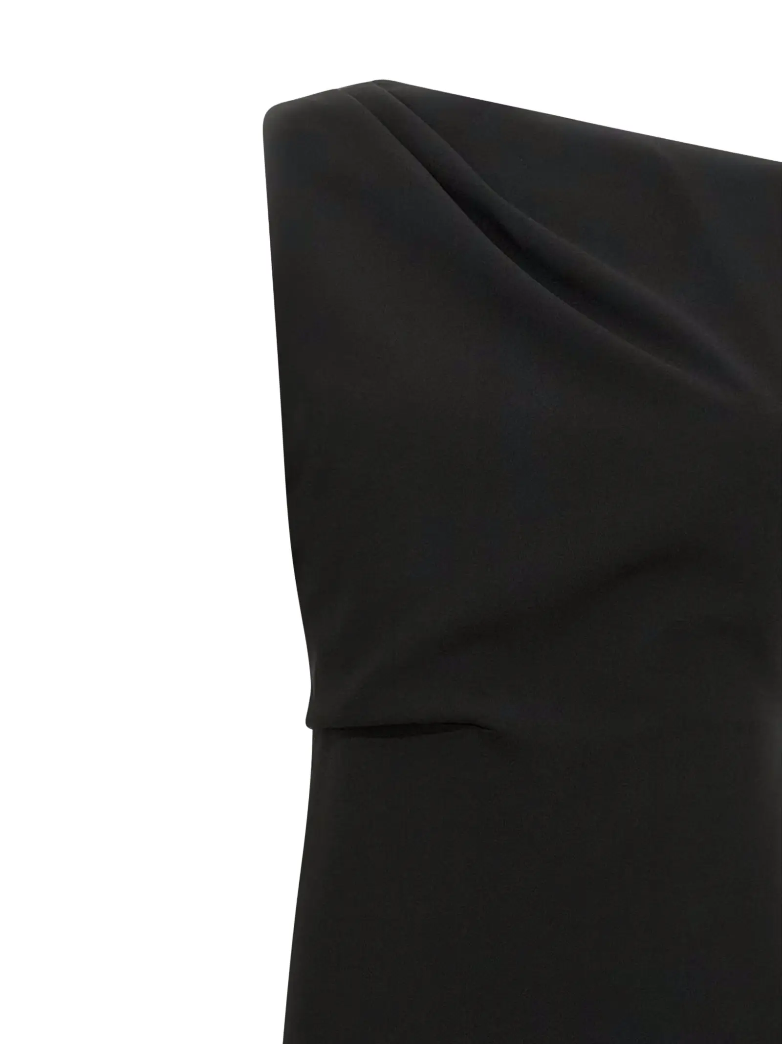 Чорна сукня Pentola від Max Mara виготовлена з інноваційної суміші триацетату та поліестеру, що забезпечує легкість і довговічність. Вишуканий драпірований корсет на правому плечі, асиметричний виріз на спині та розріз додають образу витонченості, а знімний декоративний плечовий ремінь підкреслює індивідуальність і стиль.