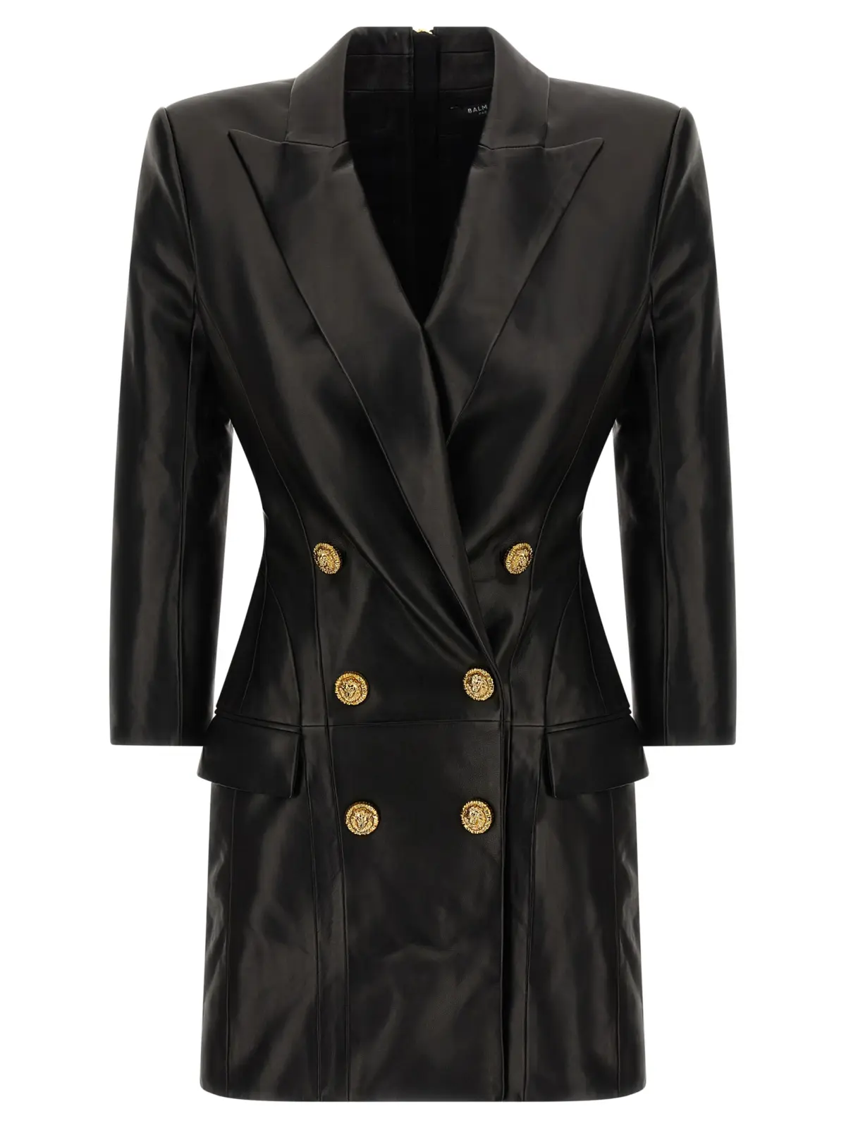 Ця вишукана сукня-піджак зі 100% овечої шкіри поєднує в собі бездоганний дизайн та інноваційність, вирізняючись подвійною застібкою, піковими лацканами та практичними кишенями з клапанами. Елегантні підплечники ідеально підкреслюють силует, надаючи вбранню статусності та універсальності для будь-яких стильних подій.