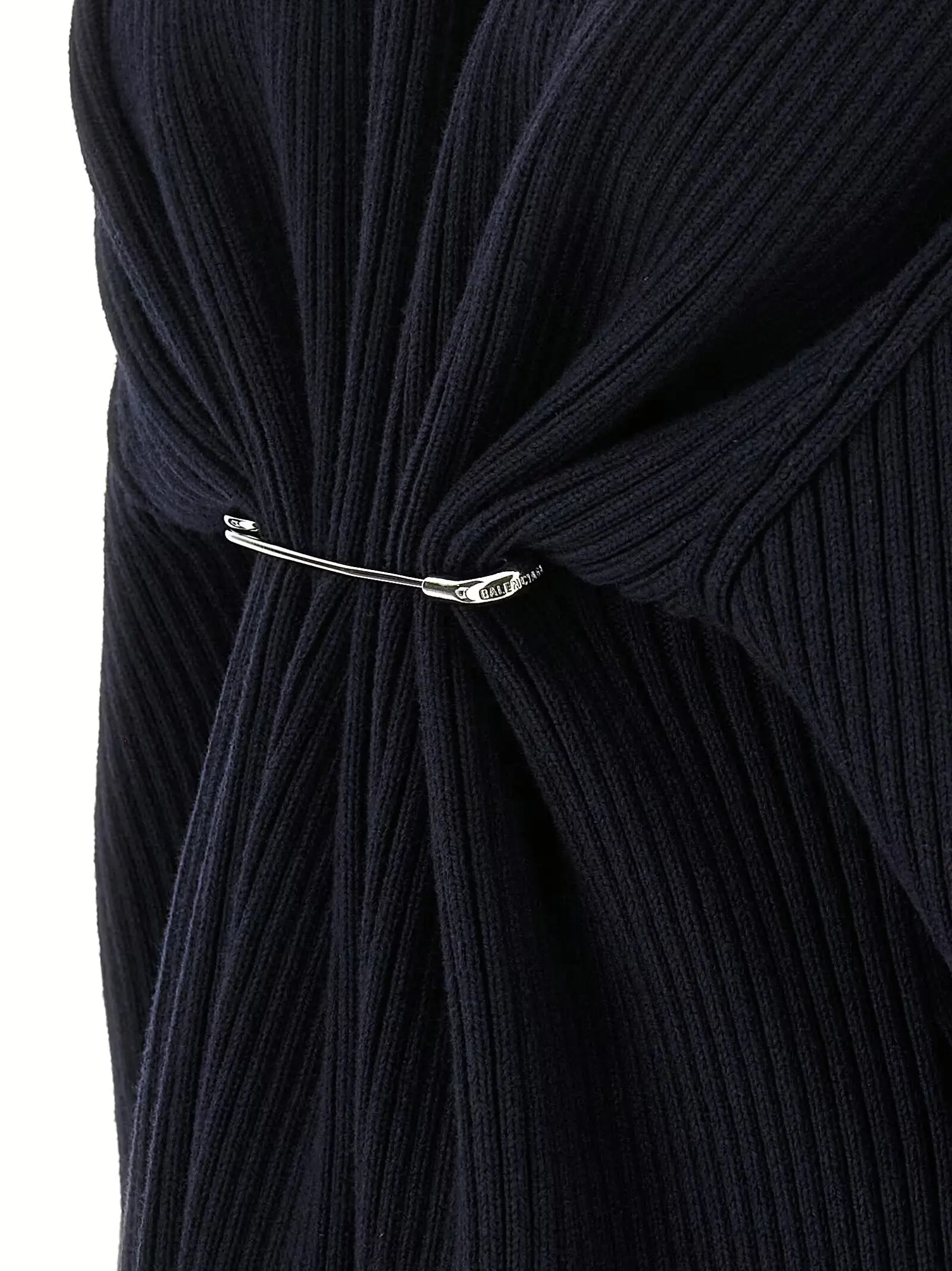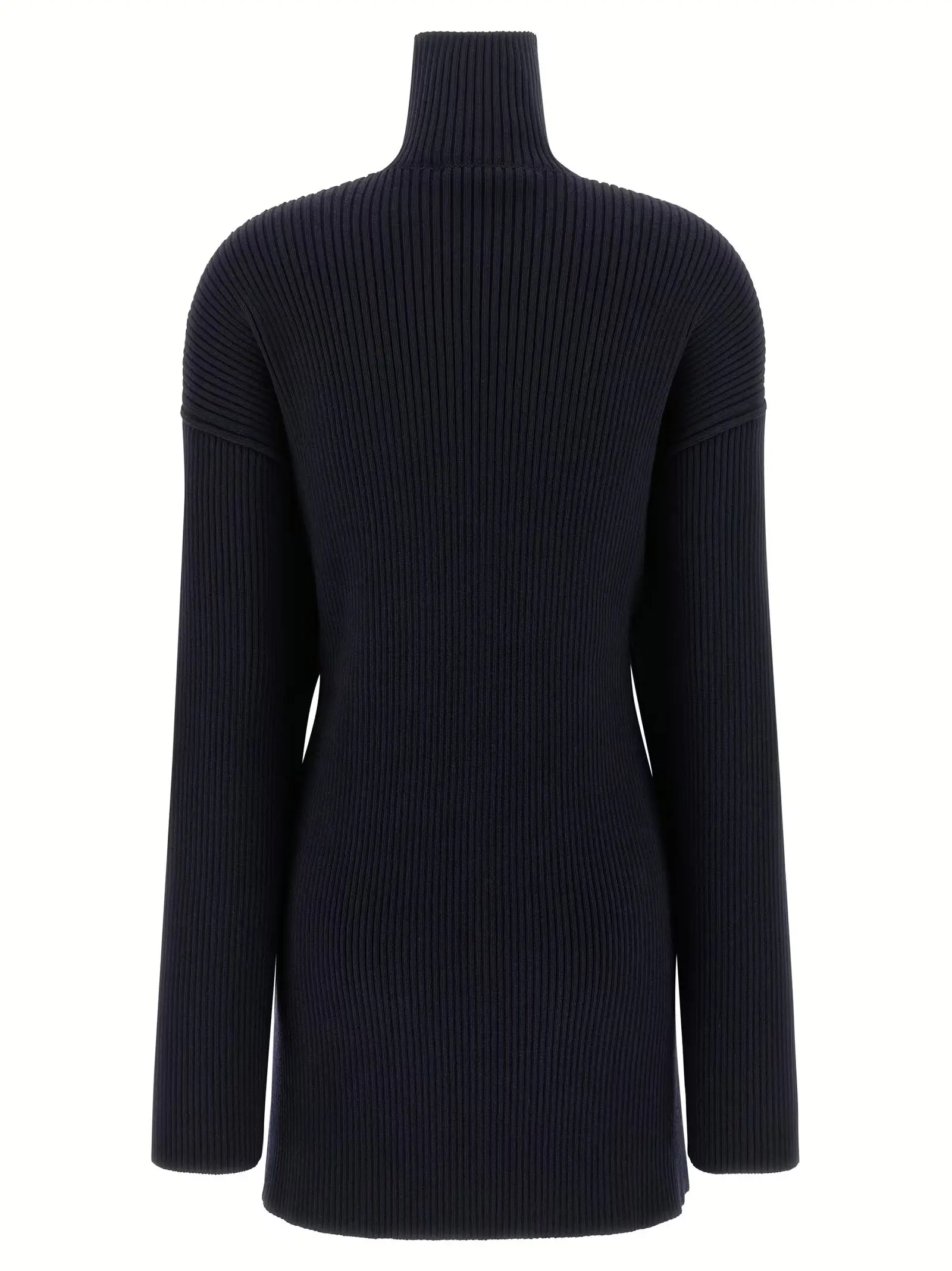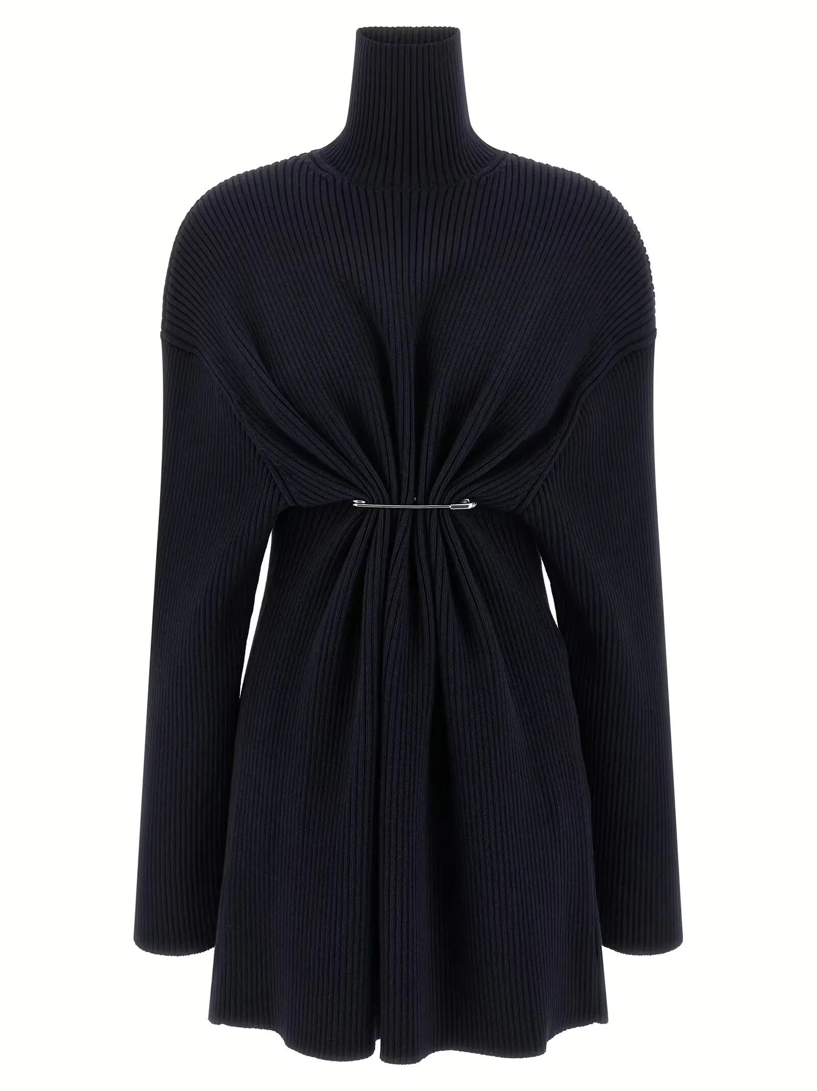 Вишукана сукня з м’якої та теплої вовни, виконана у вишуканому синьому відтінку з рельєфною фактурою, поєднує елегантний високий комір і стильний декоративний елемент на передній частині. Ідеальна для створення впевненого образу, що підкреслює статус і неповторний стиль, ця модель гармонійно поєднує комфорт і сучасний дизайн.