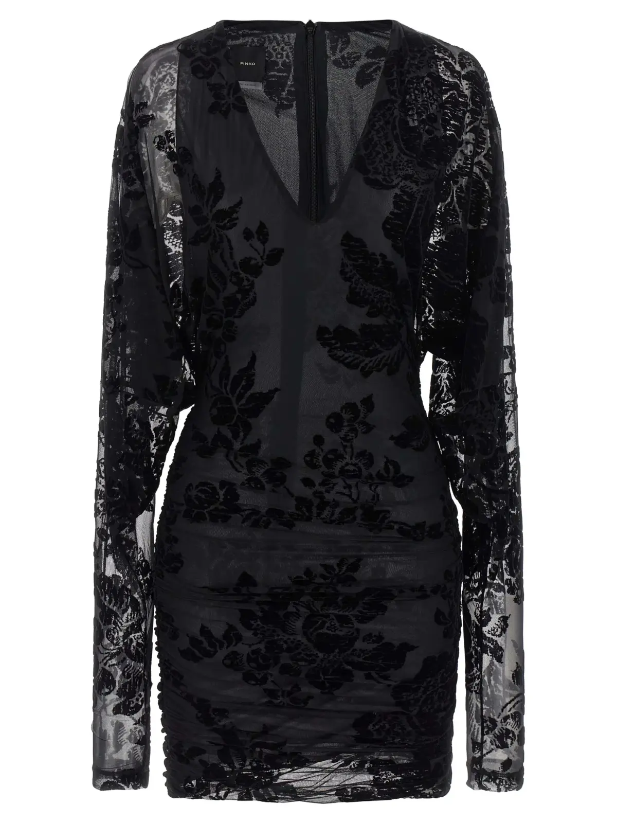 Вишукана чорна сукня Pinko Roulette виготовлена з високоякісного еластичного тюлю з візерунком, натхненним гобеленами, та ефектом деворе, що додає виробу унікальності та легкості. Елегантний V-подібний виріз, довгі об’ємні рукави та витончені завитки спереду й ззаду підкреслюють жіночність і стиль, а зручна застібка на блискавку забезпечує ідеальну посадку. Цей витвір моди поєднує інноваційність, комфорт і універсальність, створюючи неповторний статусний образ.