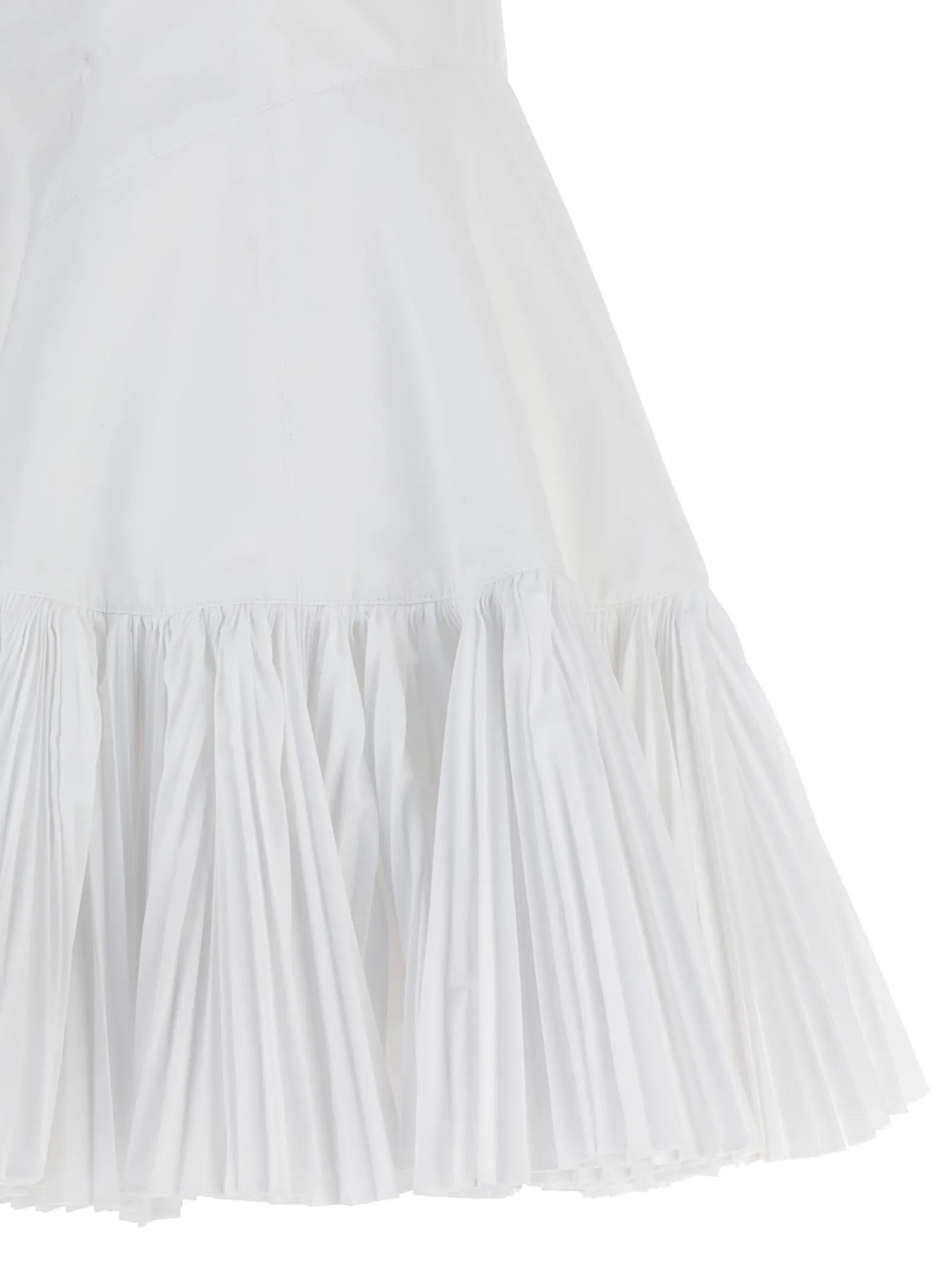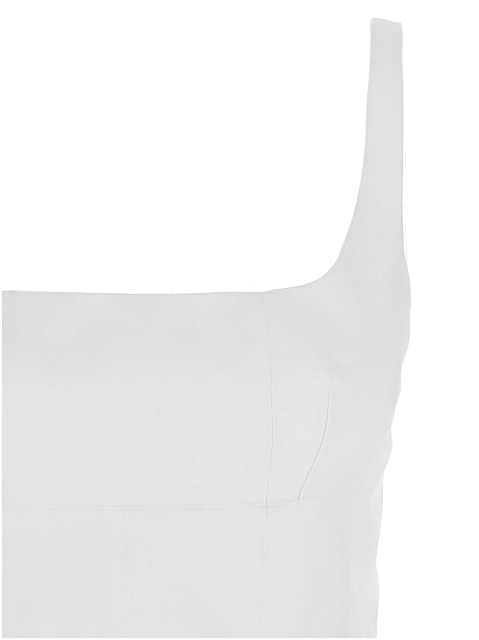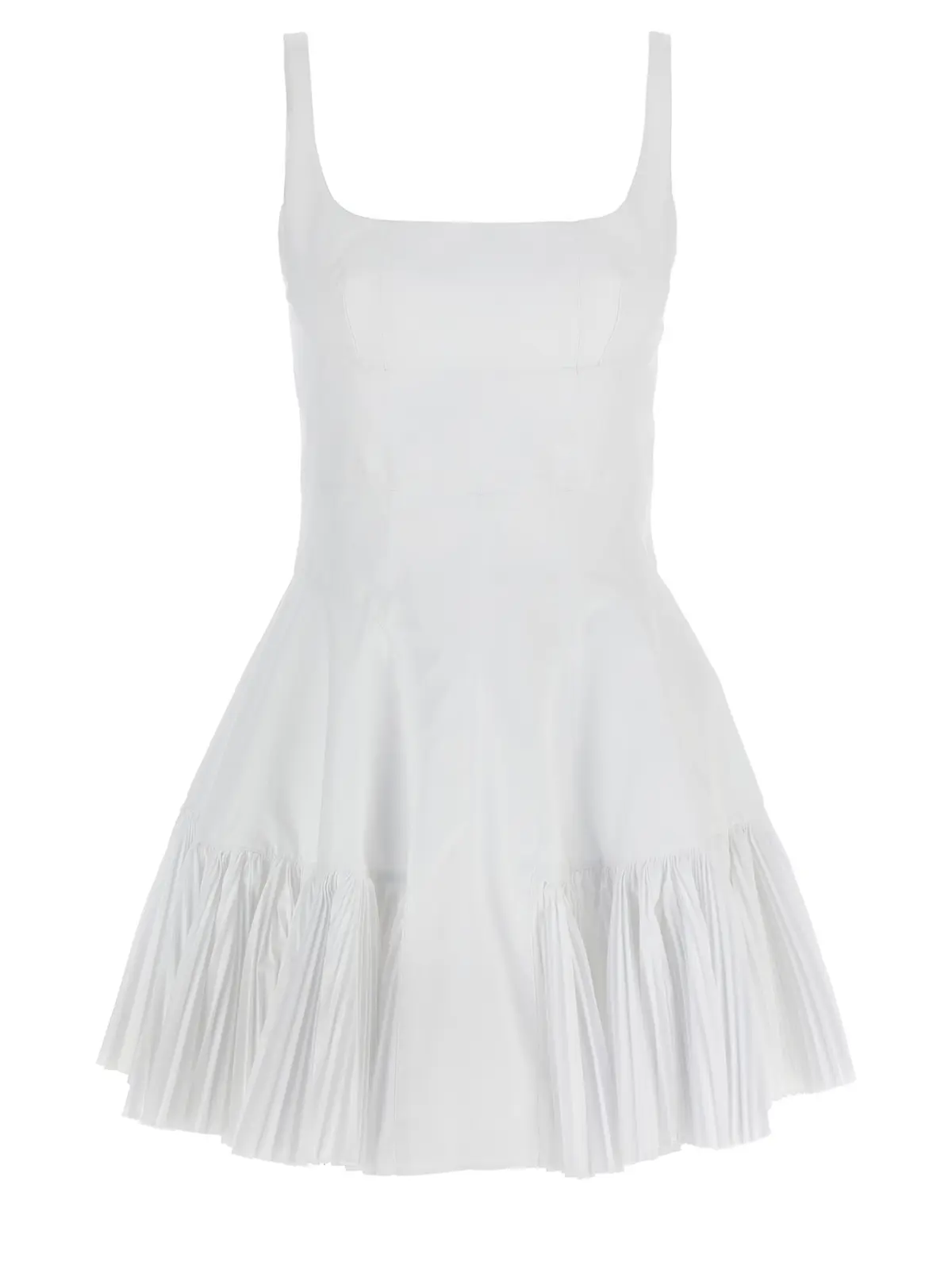 Ця сукня з бавовняної суміші поєднує в собі вишуканість і сучасний стиль, виріз квадратної форми та плісировану нижню частину додають їй легкості й динамічності, а безрукавний крій і застібка на блискавку ззаду забезпечують комфорт і функціональність, підкреслюючи статус і бездоганний смак.