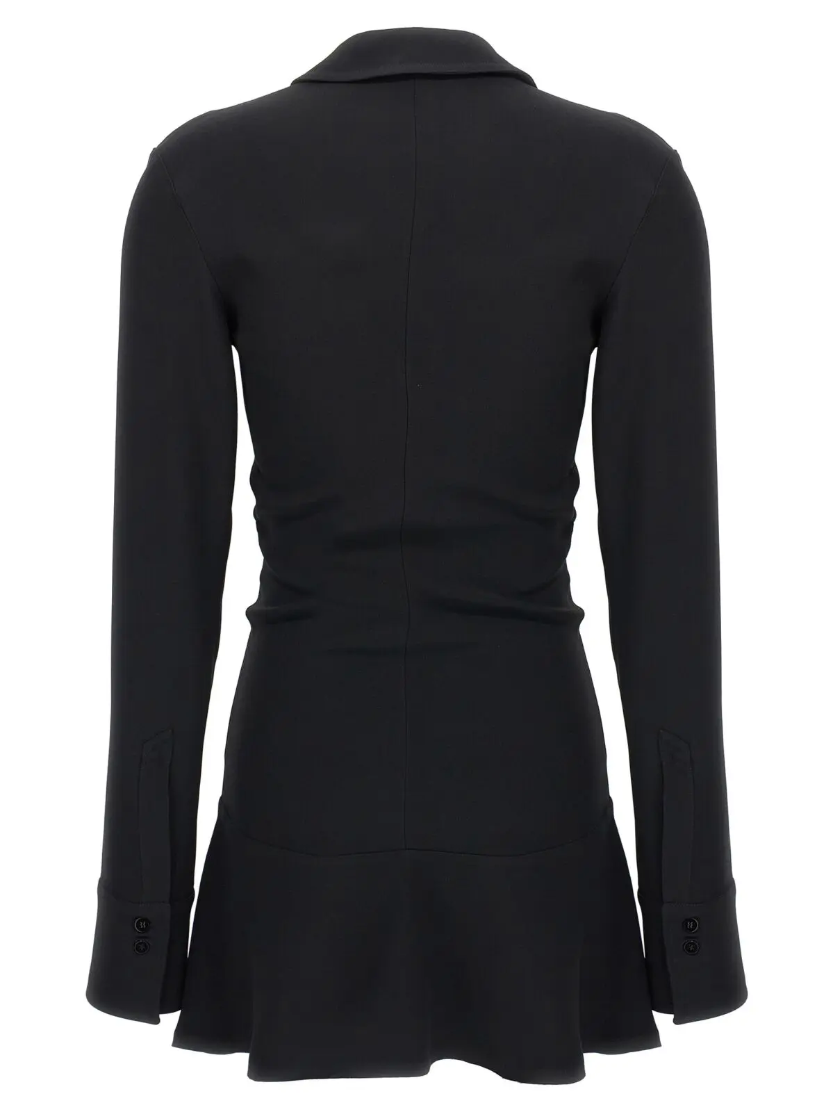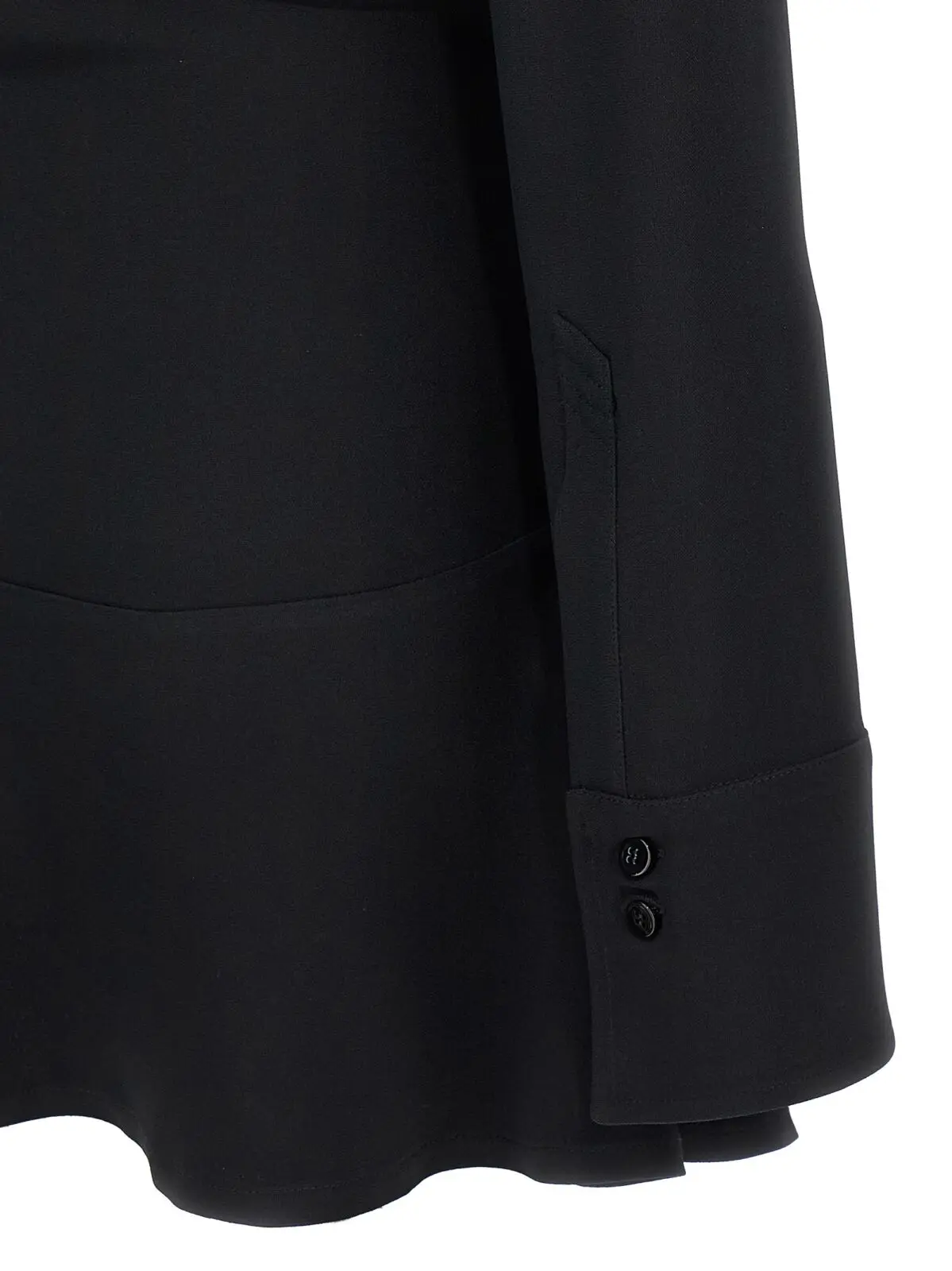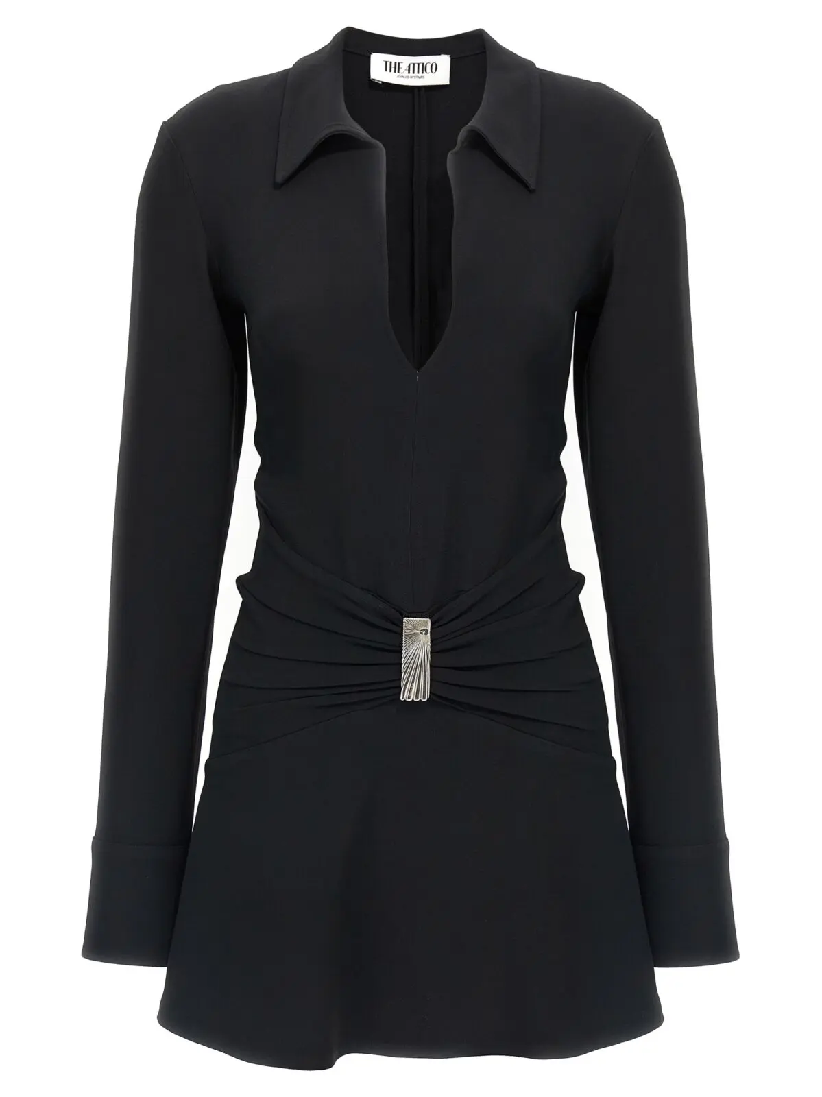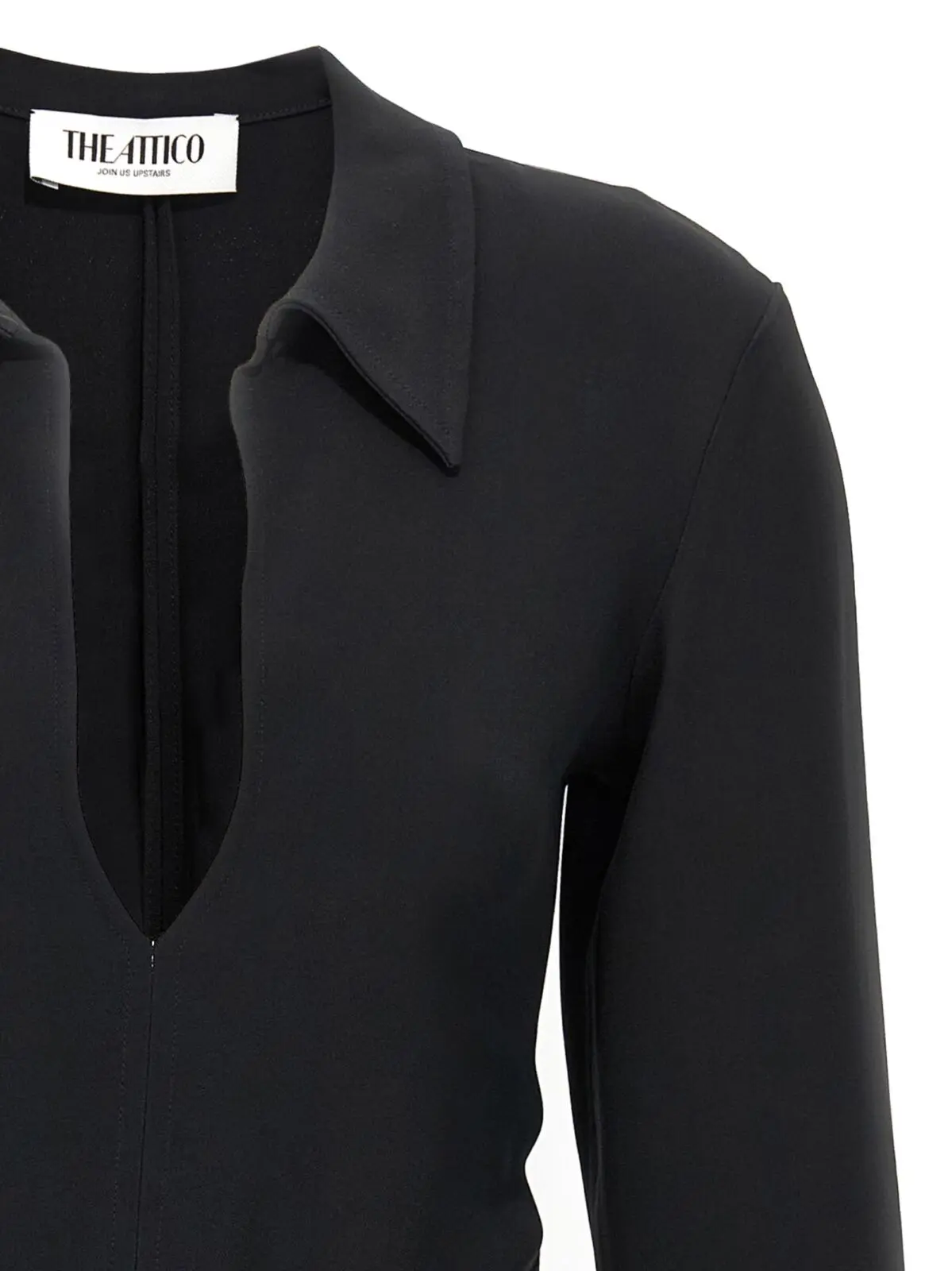 Ця чорна сукня-поло виконана з високоякісного кеді, має вишуканий V-подібний виріз і комір, акцентована зборками на талії для ідеального силуету, оснащена бічною застібкою на блискавку та довгими манжетами, поєднує елегантність, інноваційність і універсальність для стильного статусу в будь-якій ситуації.