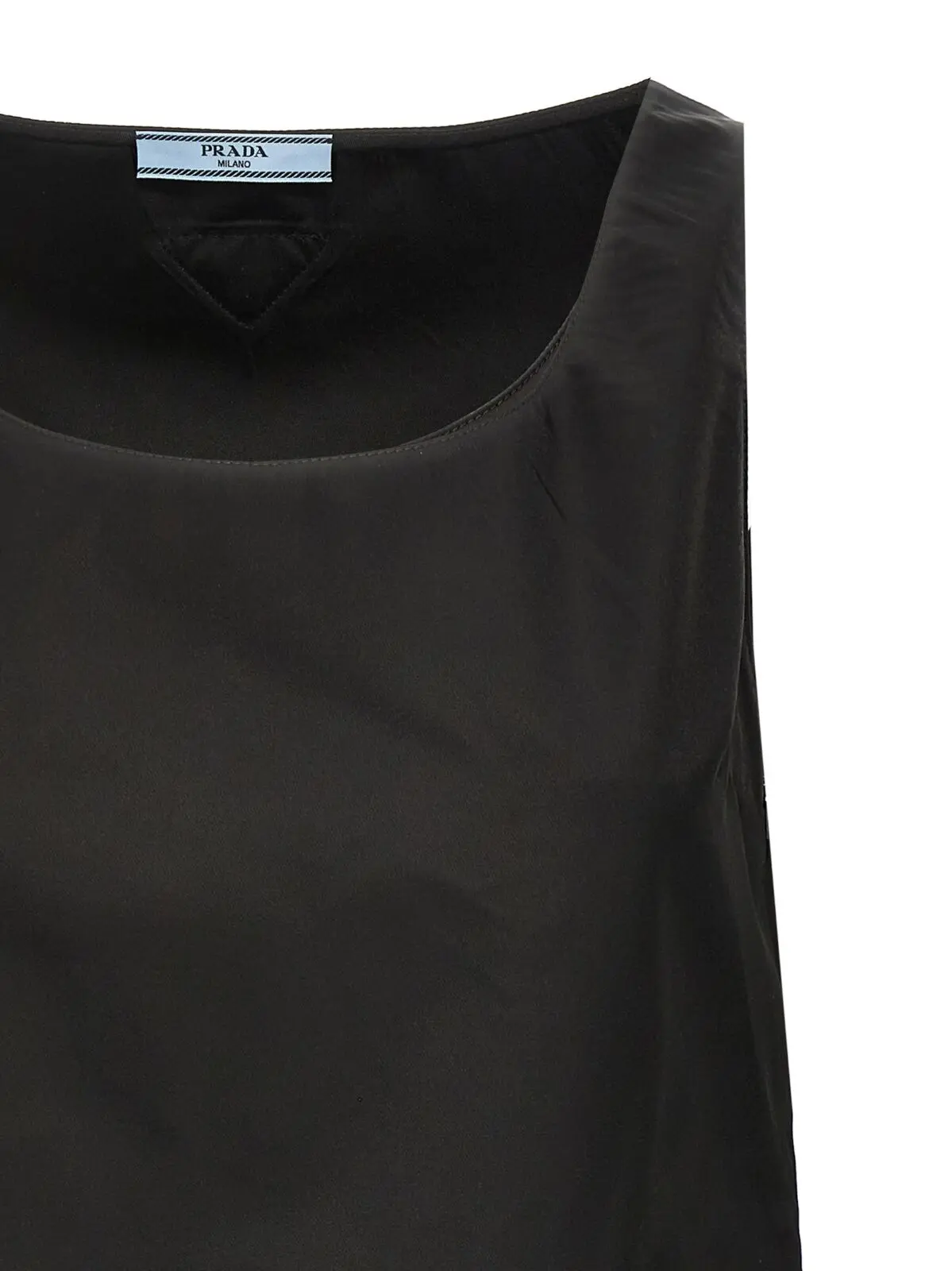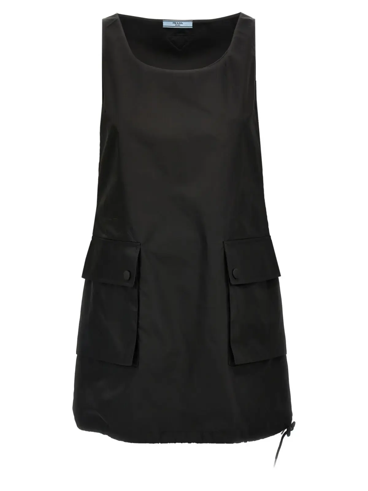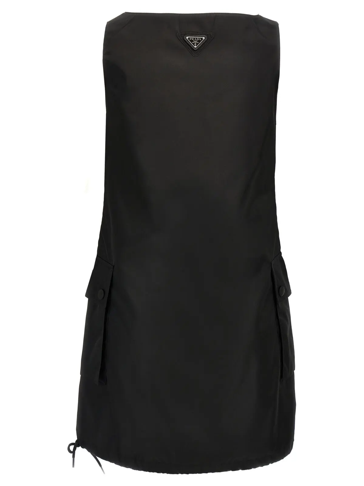 Чорна міні сукня з колекції Prada виконана з інноваційного матеріалу Re-Nylon – регенерованої нитки з переробленого пластику, що підкреслює екологічну свідомість і сучасний стиль. Витончений дизайн із круглим вирізом, без рукавів, застібкою на блискавку, функціональними кишенями та регульованим низом створює ідеальну гармонію комфорту й елегантності, надаючи образу статусу та неповторної жіночності.