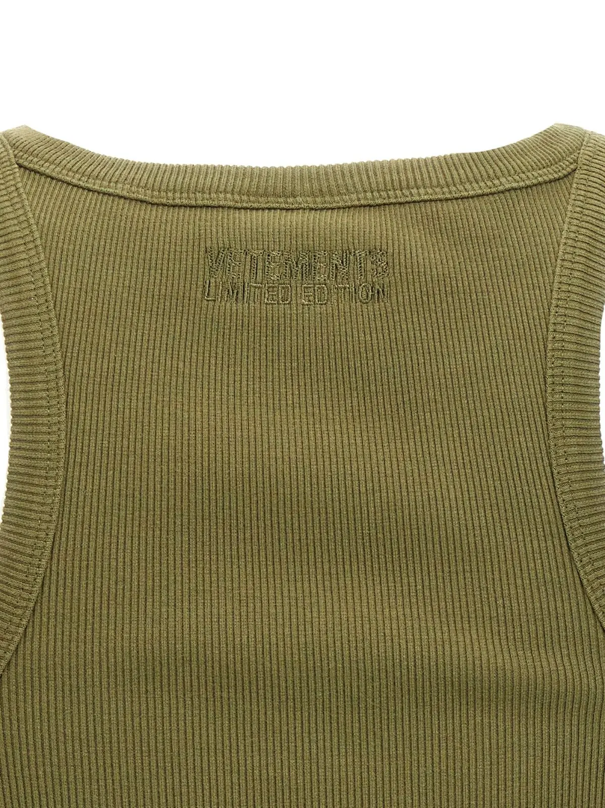 Сукня Racing Tank Top від Vetements – зелена жіноча сукня з ребристої бавовни з вишивкою логотипу зверху, круглим вирізом, безрукавна. Виготовлена з 99% бавовни, 1% еластану.