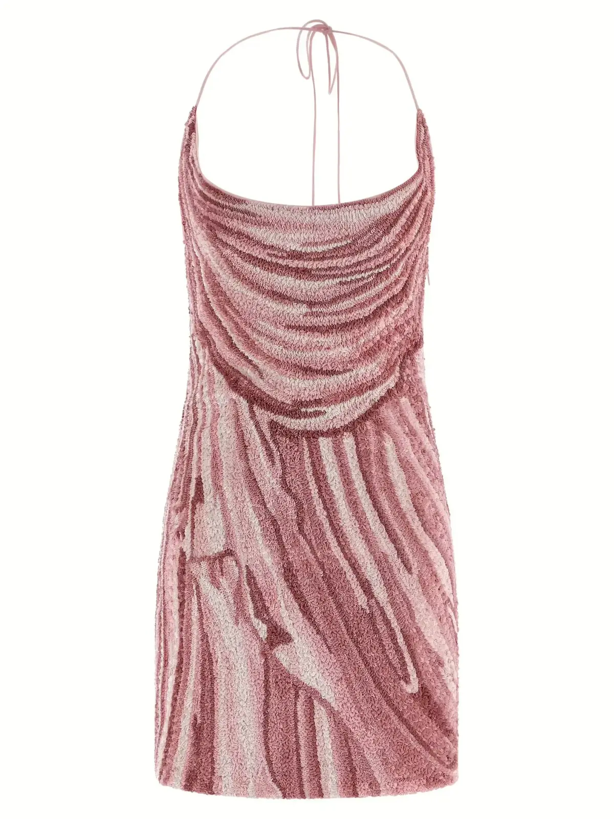 Рожева мінісукня з шовку, прикрашена суцільною паєтковою вишивкою, вирізом американського стилю з регульованою зав’язкою на шиї та боковою застібкою на блискавку. Поєднує у собі вишуканість, інноваційність і універсальність, підкреслюючи статус і бездоганний стиль.