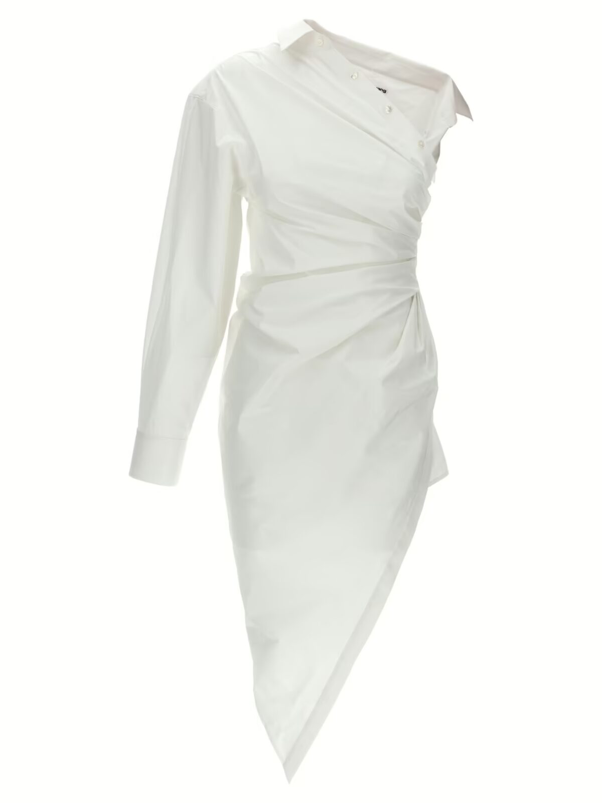 Сукня-сорочка Alexander Wang в білому кольорі є втіленням елегантності і сучасного дизайну, що підкреслює статус і витончений стиль своєї власниці. Виготовлена з високоякісної бавовни з невеликим додаванням еластану, ця модель забезпечує комфорт та свободу рухів, а асиметричний крій в поєднанні з однобоким дизайном надає образу динамічності. Довгі рукави з манжетами додатково акцентують увагу на елегантності, а бічна застібка надає практичності та стильності. Сукня вражає своєю універсальністю, підходячи як для ділових зустрічей, так і для вечірніх виходів, а також відзначається інноваційним підходом до класичного стилю. Кожна деталь цієї сукні говорить про розкіш і ексклюзивність, що робить її незамінним елементом гардеробу для жінок, які цінують якість і сучасні тенденції моди.