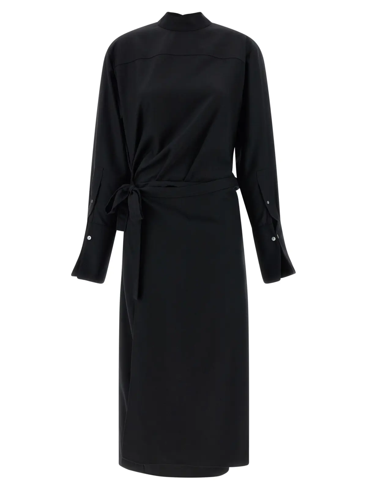 Сукня з вовняного фланелю. Підкладка з шовку. Силует хемізьє. Високий комір. Застібка на гудзики ззаду. Довгі рукави з широкими манжетами. Опущені плечі. Спідниця кльош з боковими шнурівками. Матеріал 100% вовна.