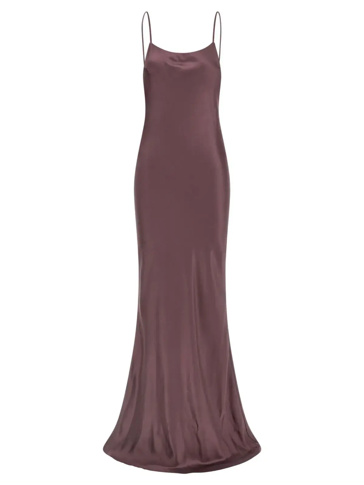 Ця сукня виконана з натурального віскозного сатину, що ніжно облягає фігуру, поєднуючи елегантність і комфорт. Витончений дизайн із квадратним вирізом спереду, тонкими бретелями та шлейфом створює неповторний образ, що підкреслює статус і бездоганний стиль.
