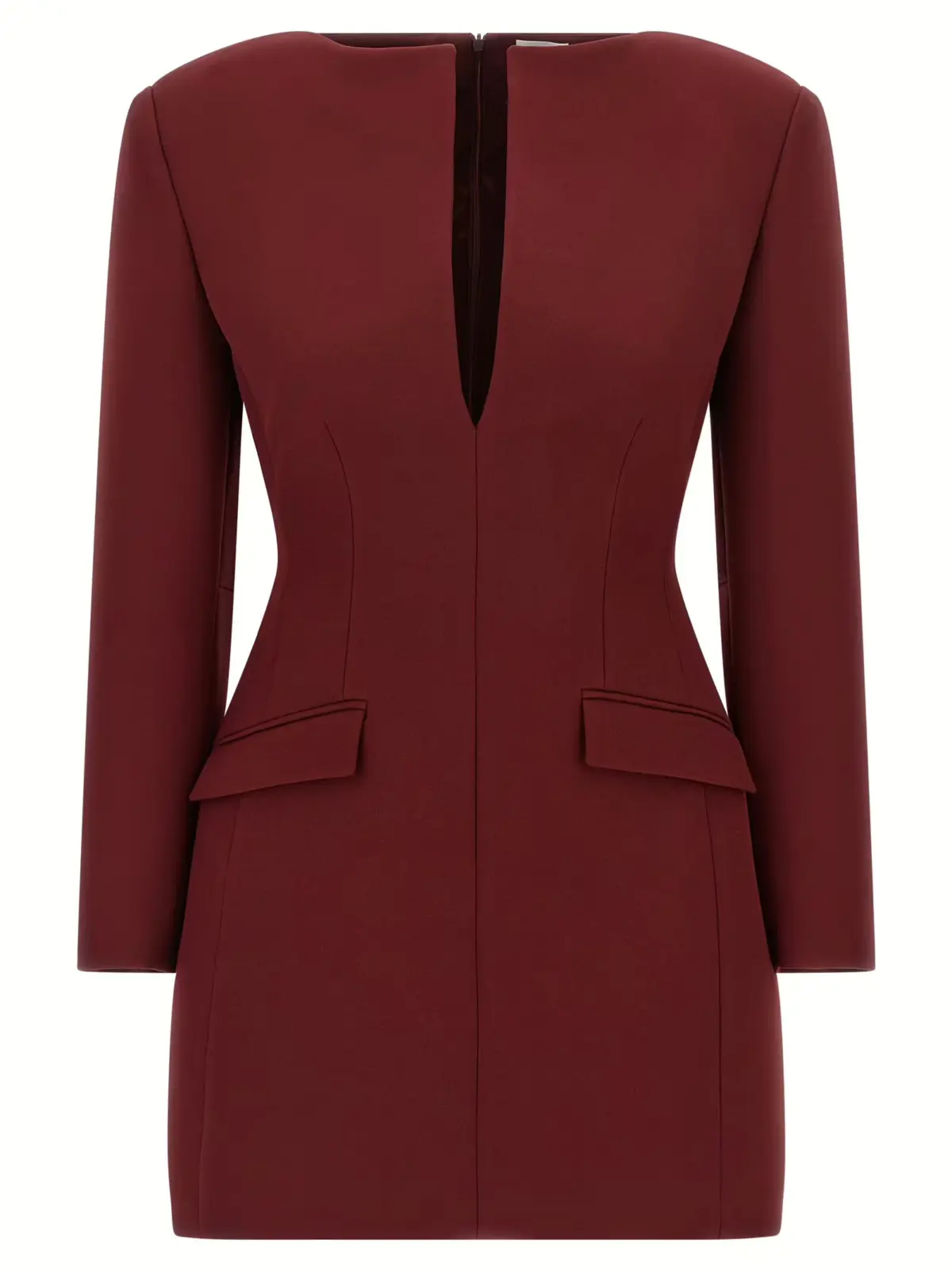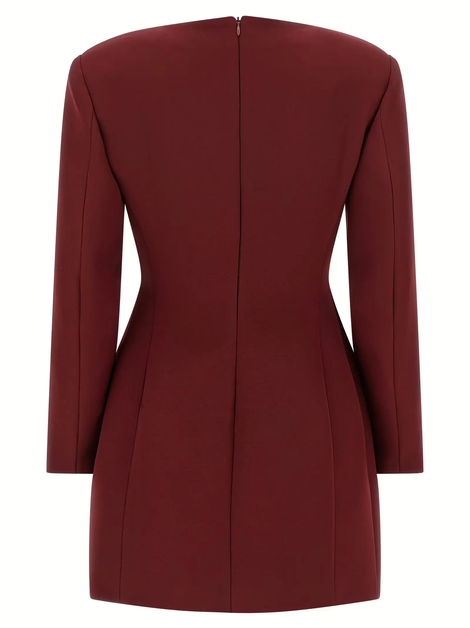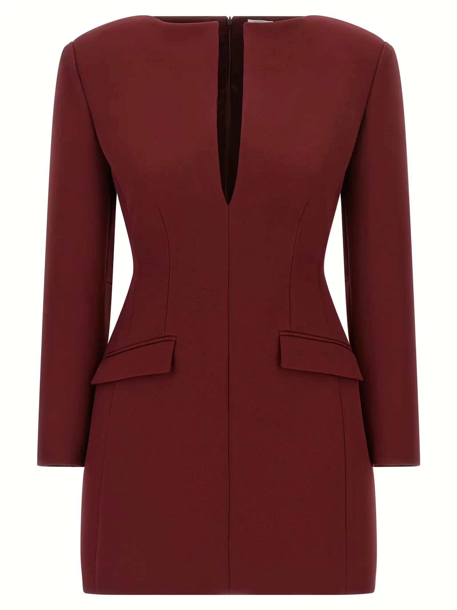 Вишукана сукня бордового відтінку з технічного крепу, що ідеально підкреслює силует пісочного годинника, поєднує елегантність і сучасний стиль. Модель оснащена круглим вирізом із розрізом спереду, клапанними кишенями, плечовими підплічниками та довгими рукавами, забезпечуючи бездоганну посадку й комфорт. Внутрішня підкладка з ацетату додає легкості, а застібка на блискавку ззаду акцентує акуратність крою. Цей виріб виражає статус і впевненість, стаючи універсальним вибором для вишуканих образів.