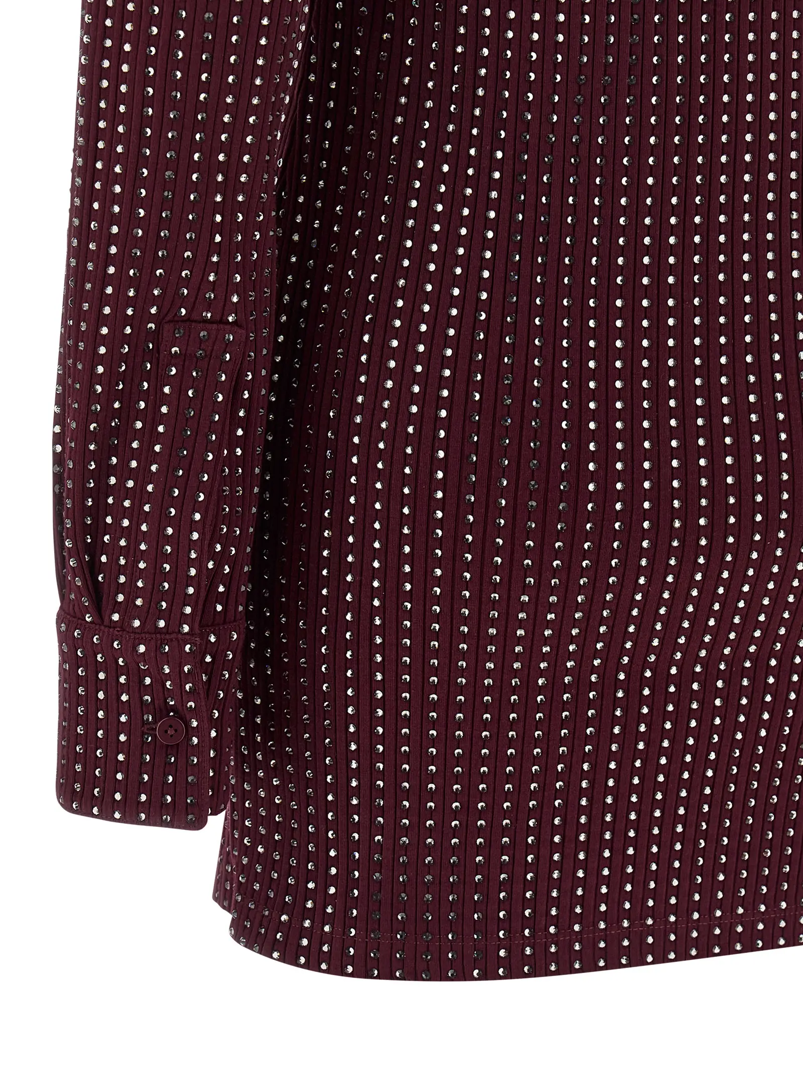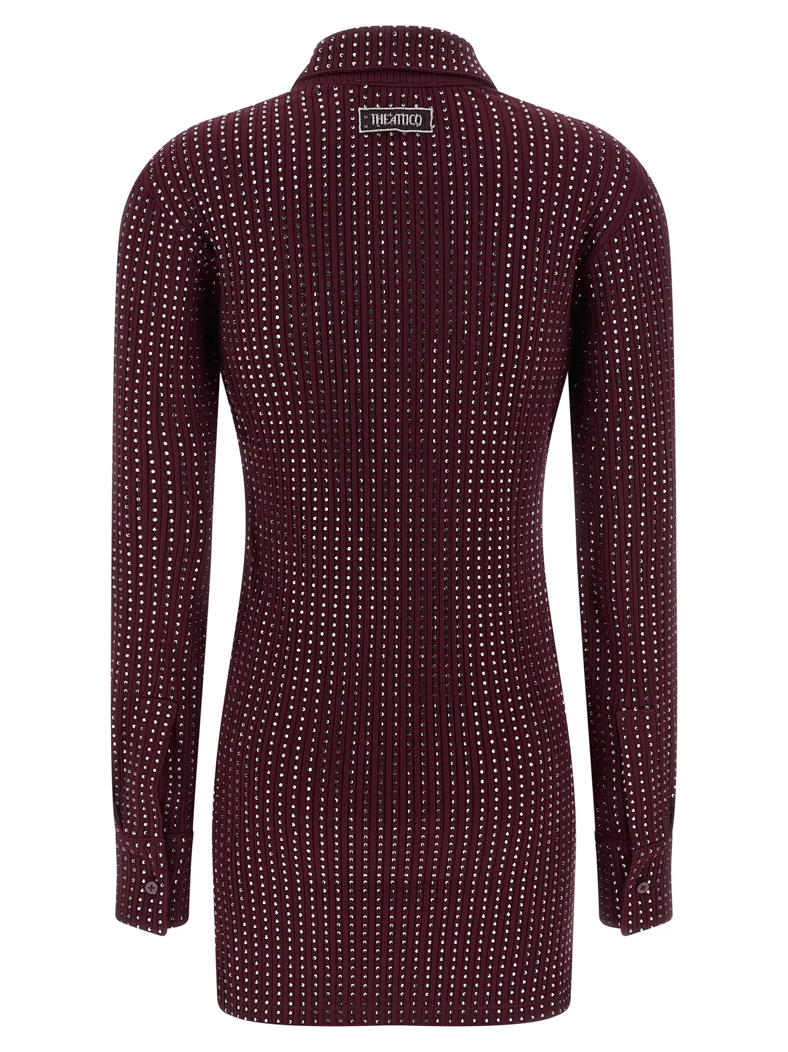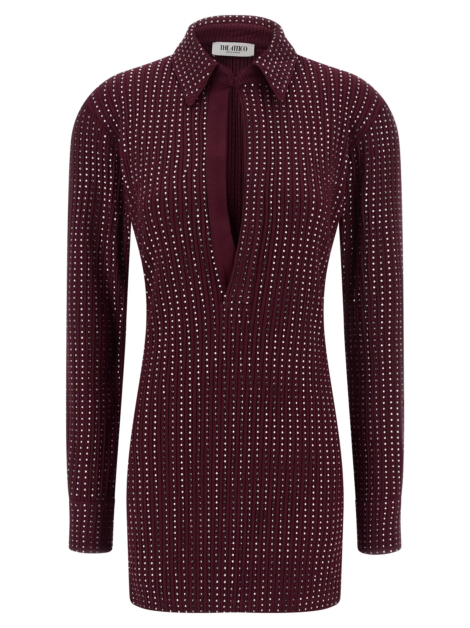 Вишукана бордова сукня з м’якої 100% бавовни з ребристою текстурою, оздоблена вишуканими стразами по всій поверхні. Модель у стилі хеміз’є з довгими манжетами та елегантним вирізом у вигляді краплі спереду підкреслює вишуканість і статус, поєднуючи комфорт і сучасний стиль для будь-яких урочистих подій.