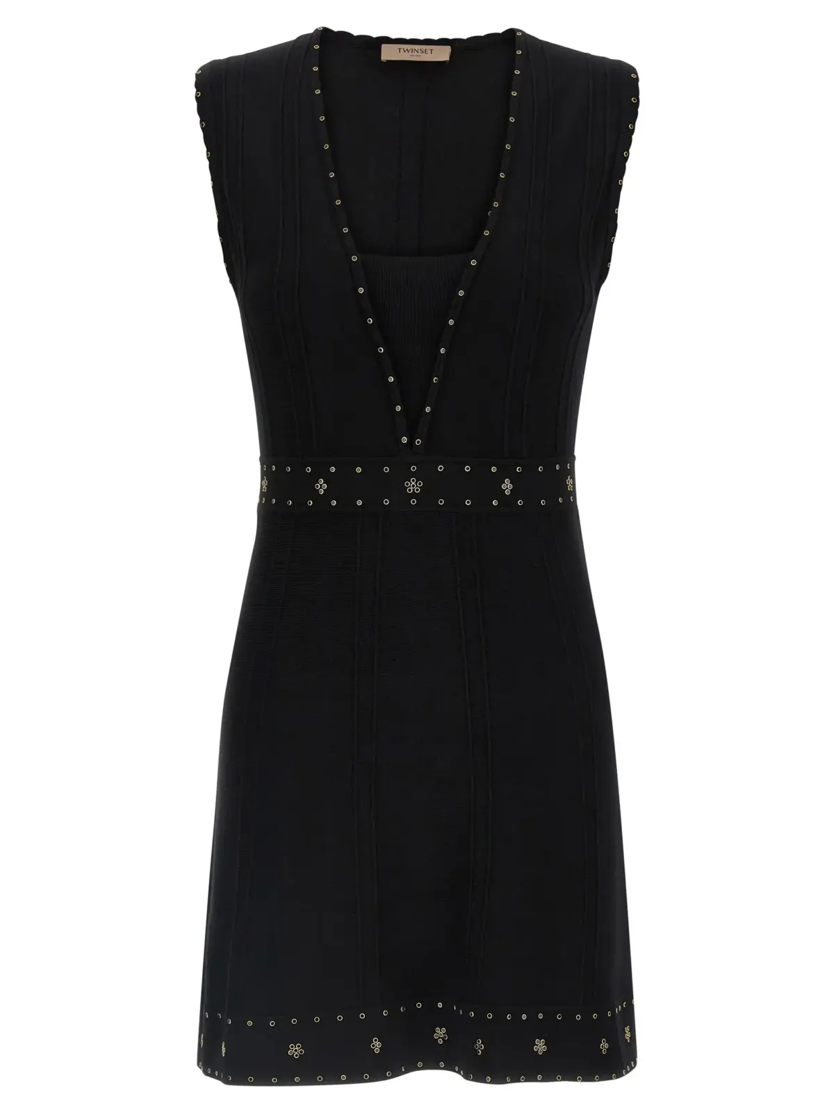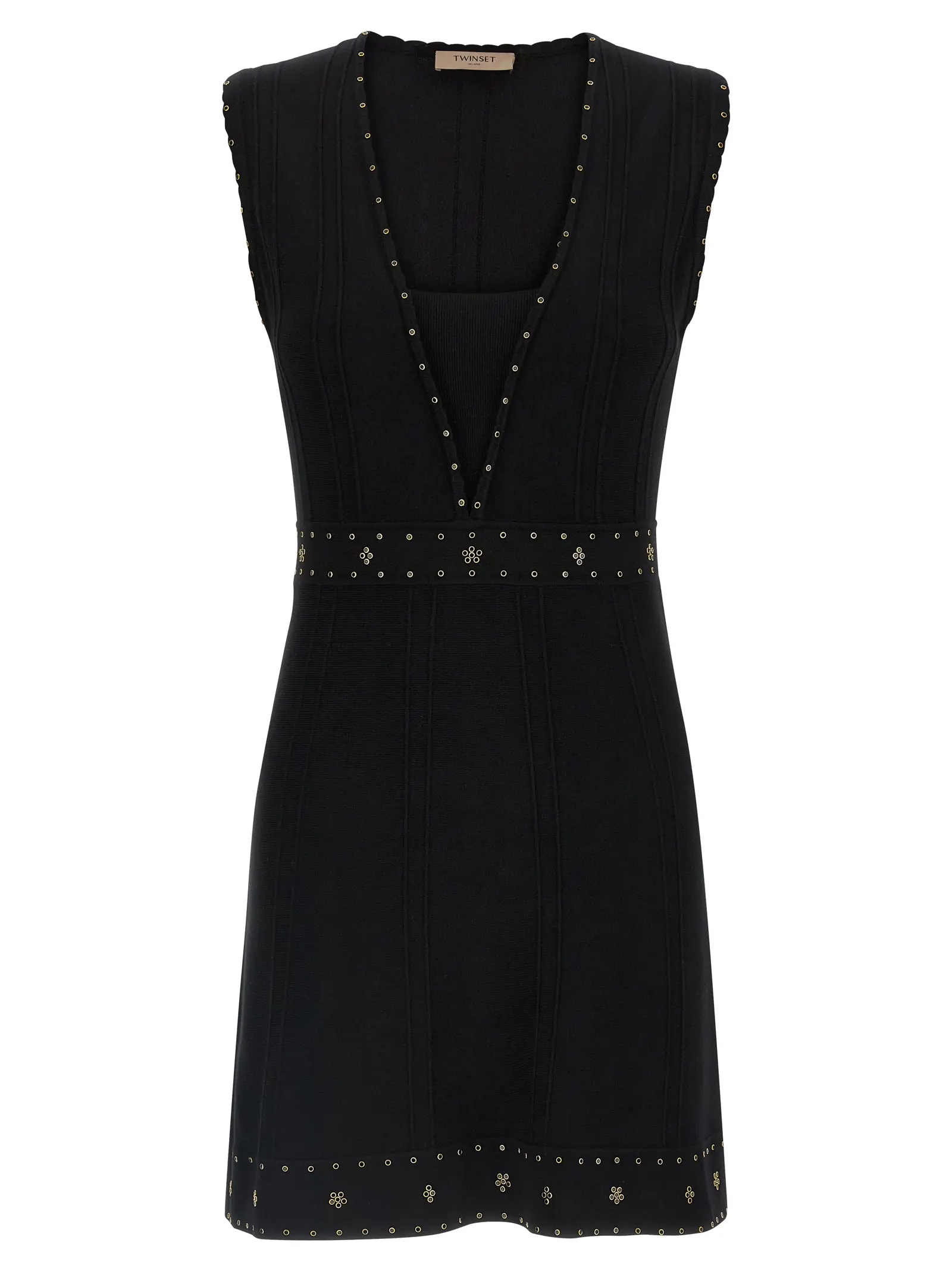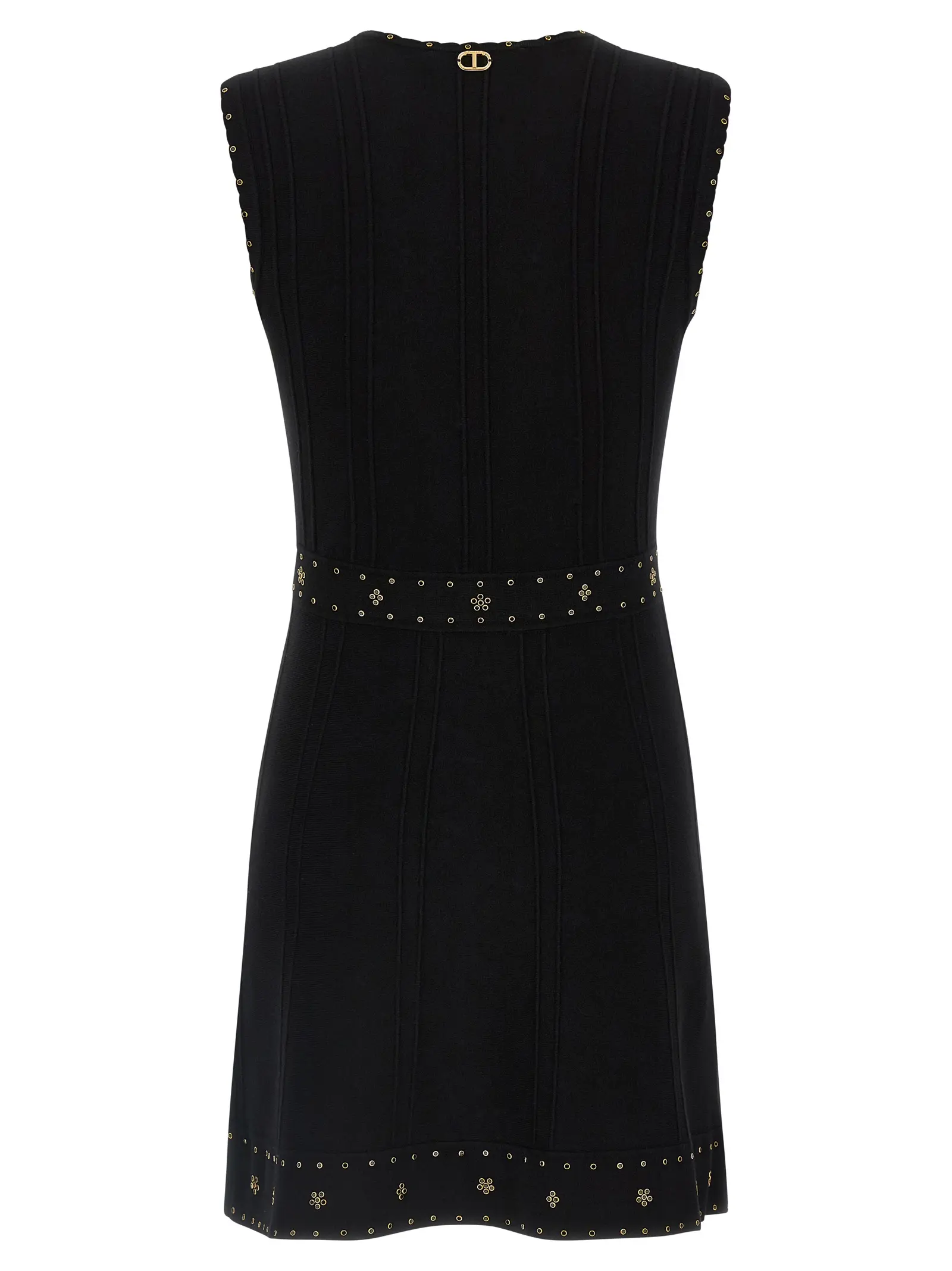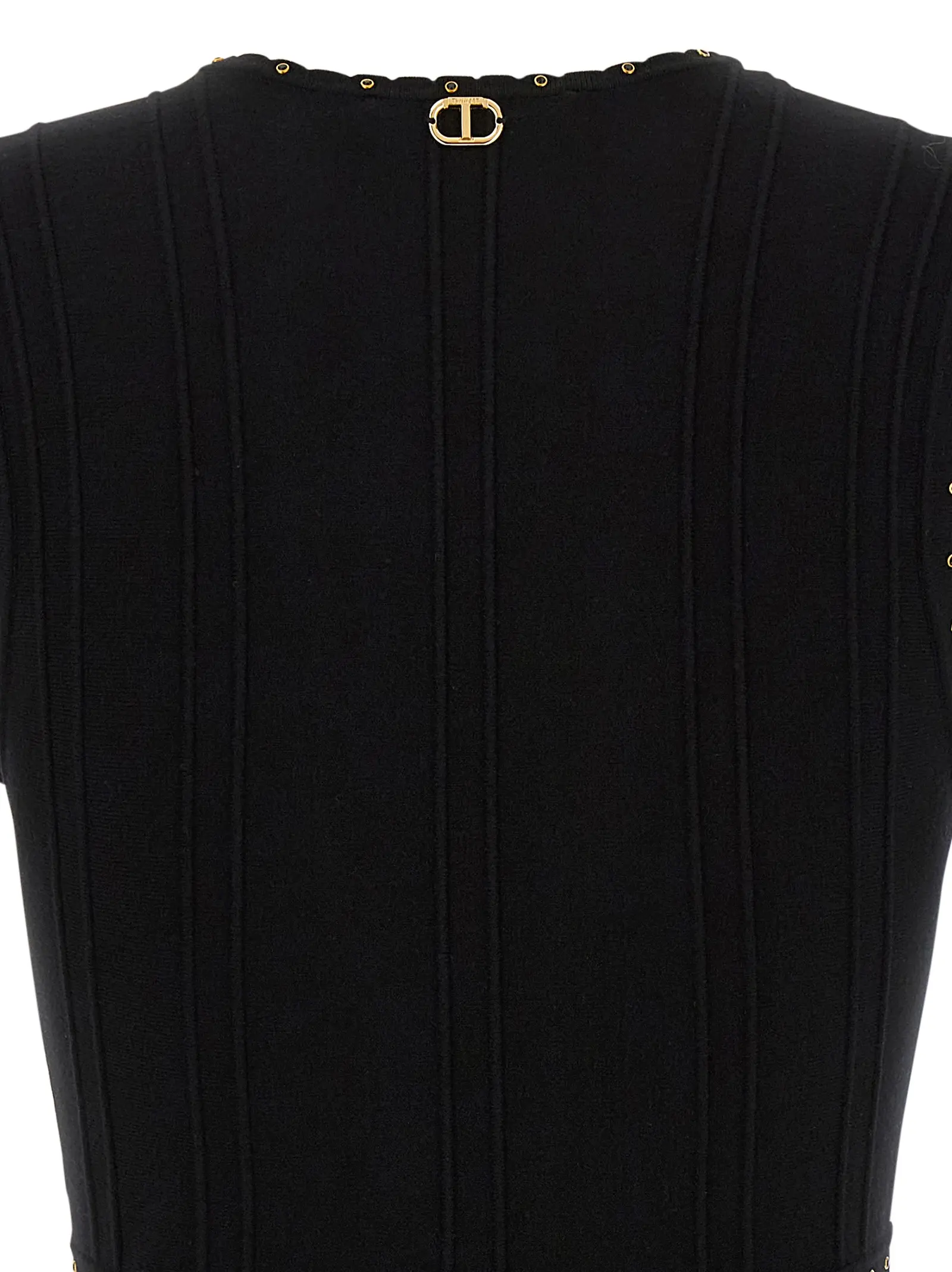 Чорна мінісукня з еластичної віскози з оригінальним поєднанням гладкого та ребристого фактурного візерунка, прикрашена вишуканими стразами, має квадратний виріз, без рукавів та розкльошений силует. Вишуканий металевий логотип на спині підкреслює статусність і неперевершений стиль цієї моделі, що поєднує комфорт і інноваційність.