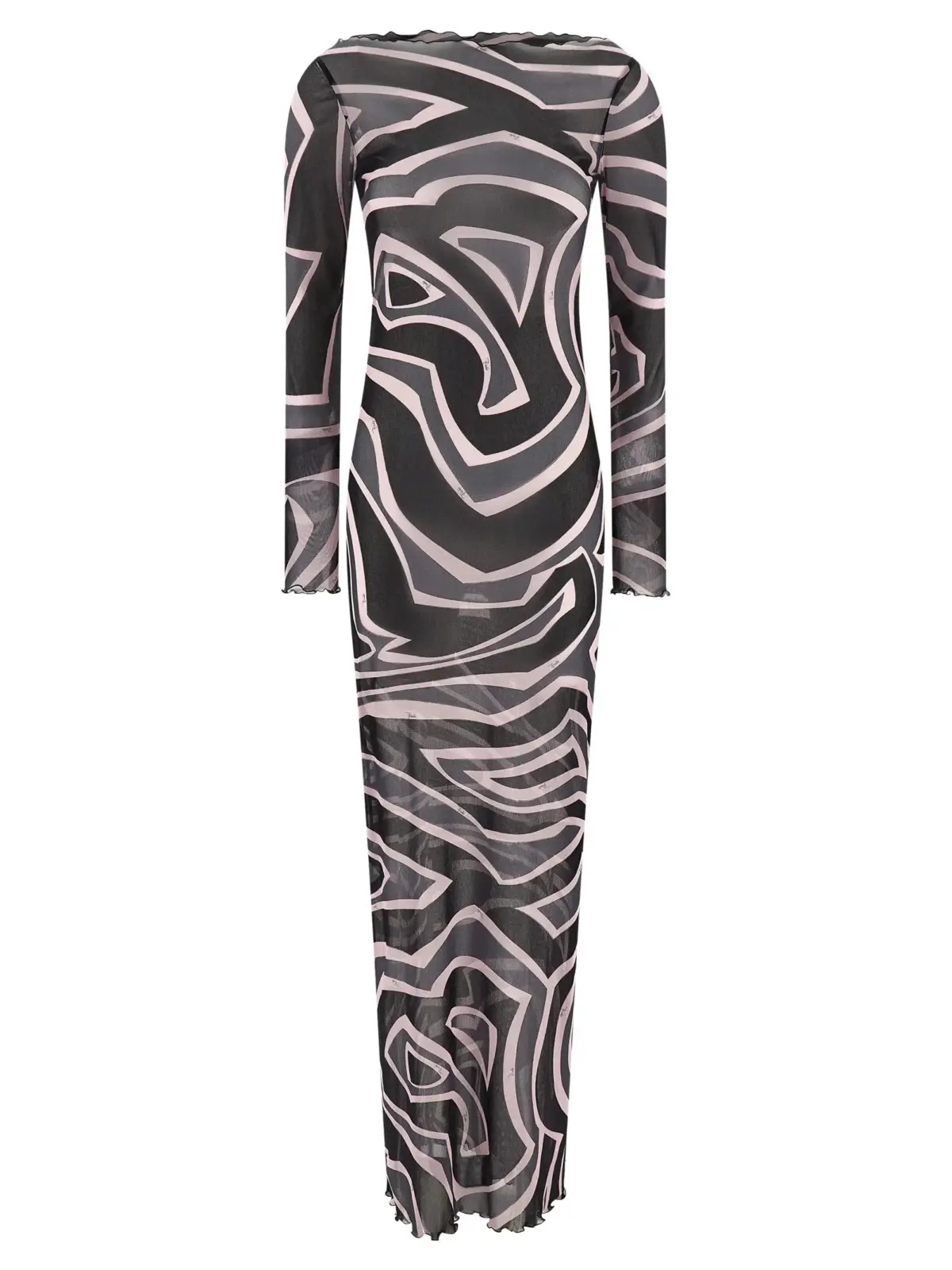 Витончене плаття з напівпрозорого еластичного тюлю з мармуровим принтом, що підкреслює індивідуальність кожної моделі завдяки унікальному розташуванню візерунка. Оригінальний дизайн з човниковим вирізом і довгими рукавами поєднує легкість, комфорт і вишуканий стиль, створюючи неповторний образ преміального рівня.