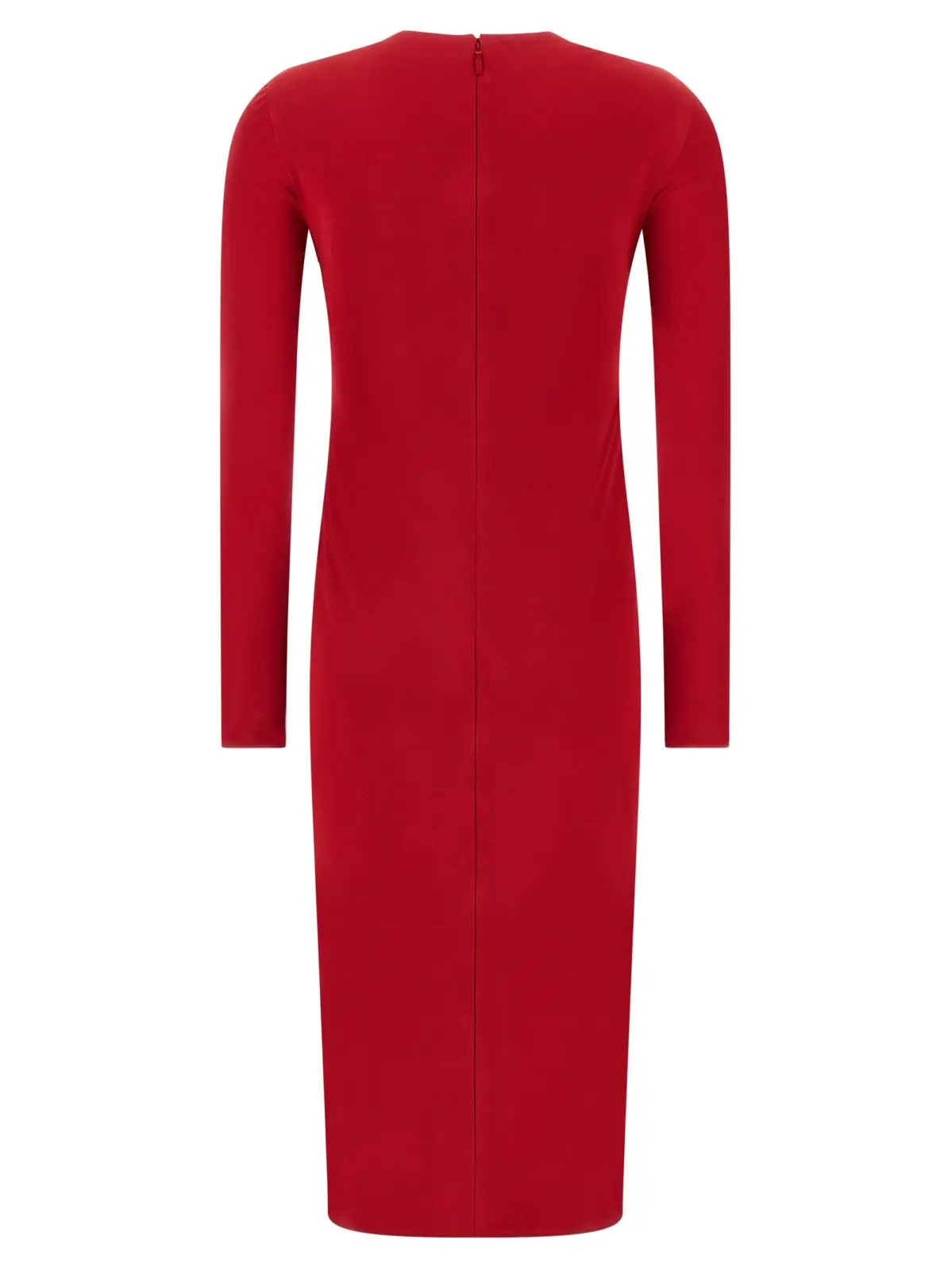 Сукня Versace Safety Pin вражає своєю елегантністю та сучасним дизайном. Виготовлена з еластичного віскозного джерсі, вона забезпечує комфорт та ідеальну посадку. Червоний колір підкреслює жіночність, а металевий елемент у формі шпильки надає особливого акценту. Довгі рукави та закриття на застібку ззаду додають витонченості. Ця сукня є ідеальним вибором для урочистих подій, підкреслюючи статус та стиль своєї власниці. Інноваційний підхід у дизайні та висока якість матеріалів втілюють сучасні модні тренди, а універсальність моделі дозволяє створювати безліч образів.
