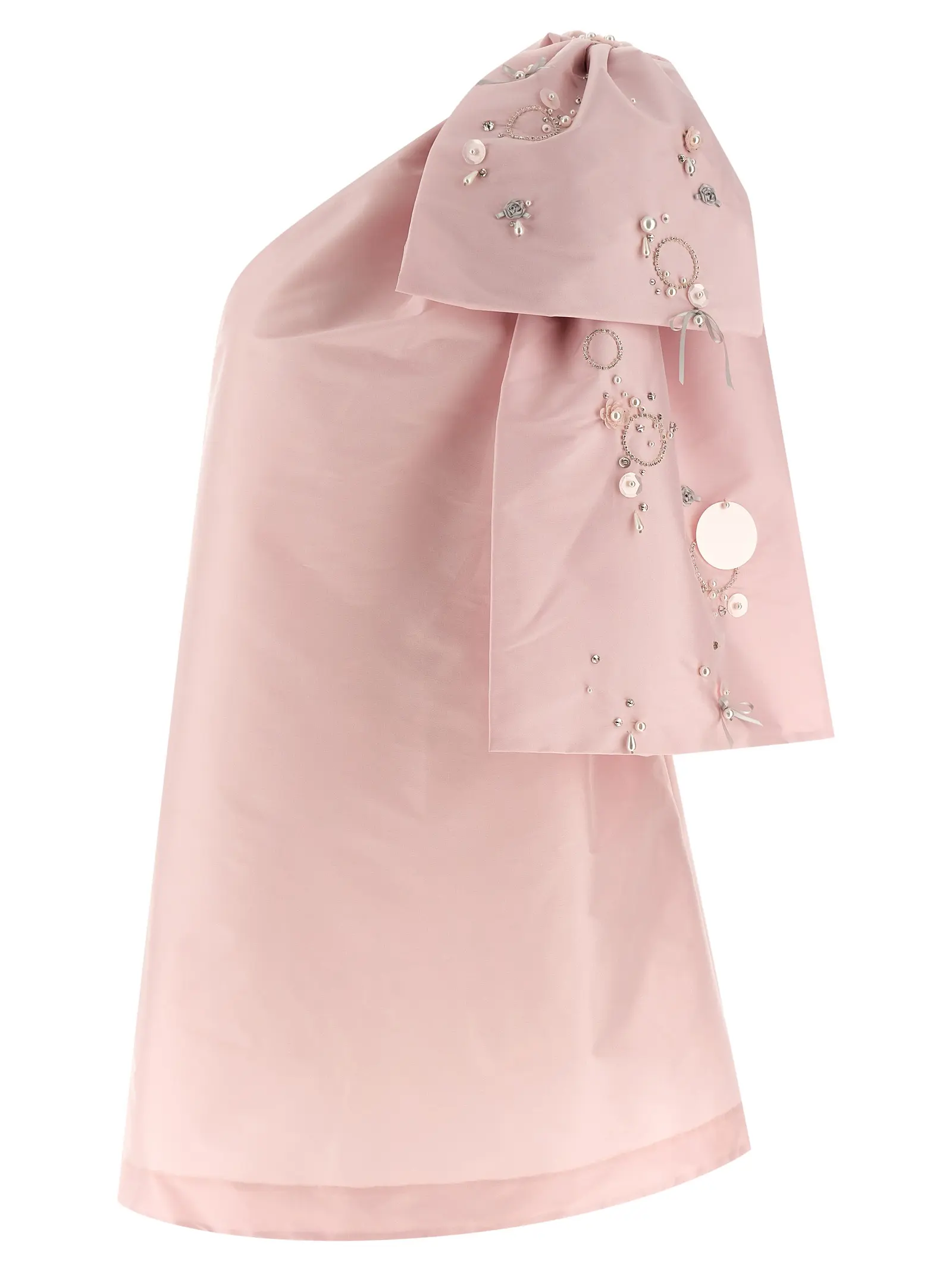Сукня з однім відкритим плечем. Виготовлена з тафти. Довга бантова деталь. Прикрашена вишивкою з камінням. Без рукавів. Має кишені. Підкладка з віскози. Склад тканини містить поліестер, поліамід та еластан.