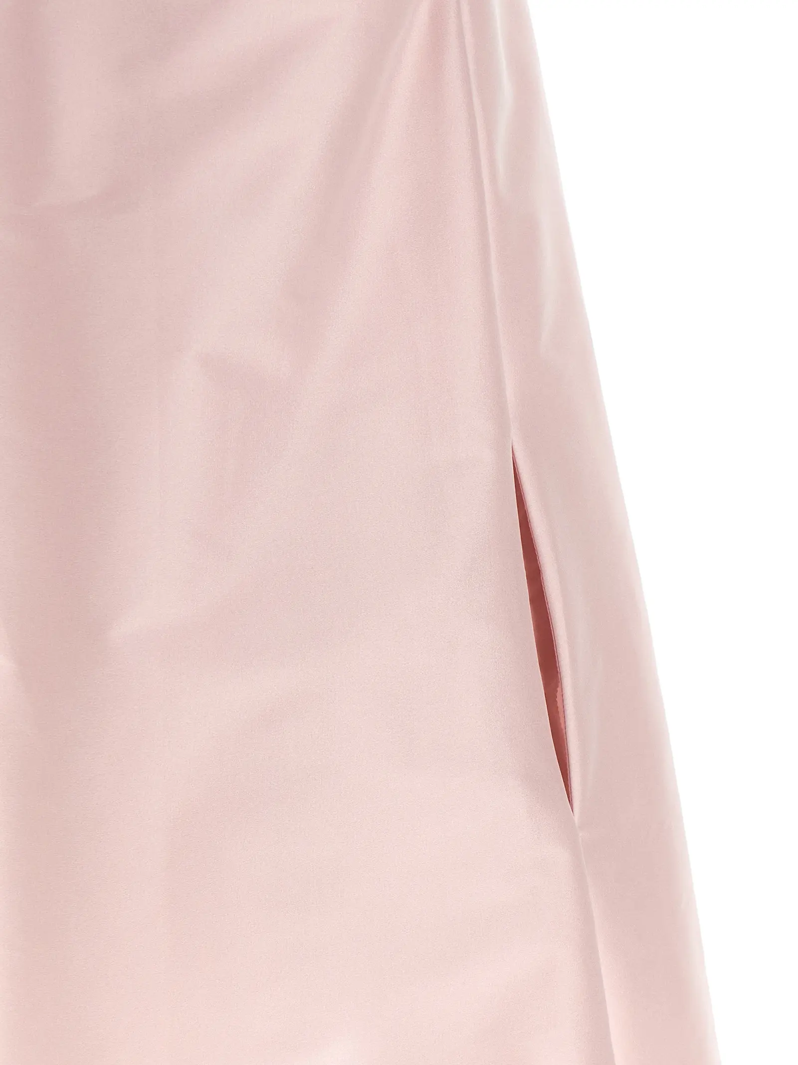 Елегантна сукня з тафти в ніжно-рожевому відтінку зі стильним відкритим плечем, довгою бантовою деталлю та вишуканою вишивкою з камінням. Модель без рукавів, з практичними кишенями і комфортною підкладкою з віскози, поєднує інноваційність матеріалів і вишуканий дизайн, створюючи неповторний образ статусу та витонченого стилю.