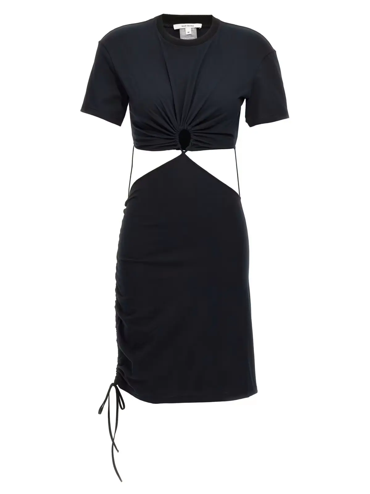Сукня T-shirt Nensi Dojaka – це чорна жіноча сукня з вирізами з переду і ззаду, виготовлена з 100% бавовни. Вона має круглий виріз, короткі рукава і завязки знизу, які можна зібрати на бічному шві.