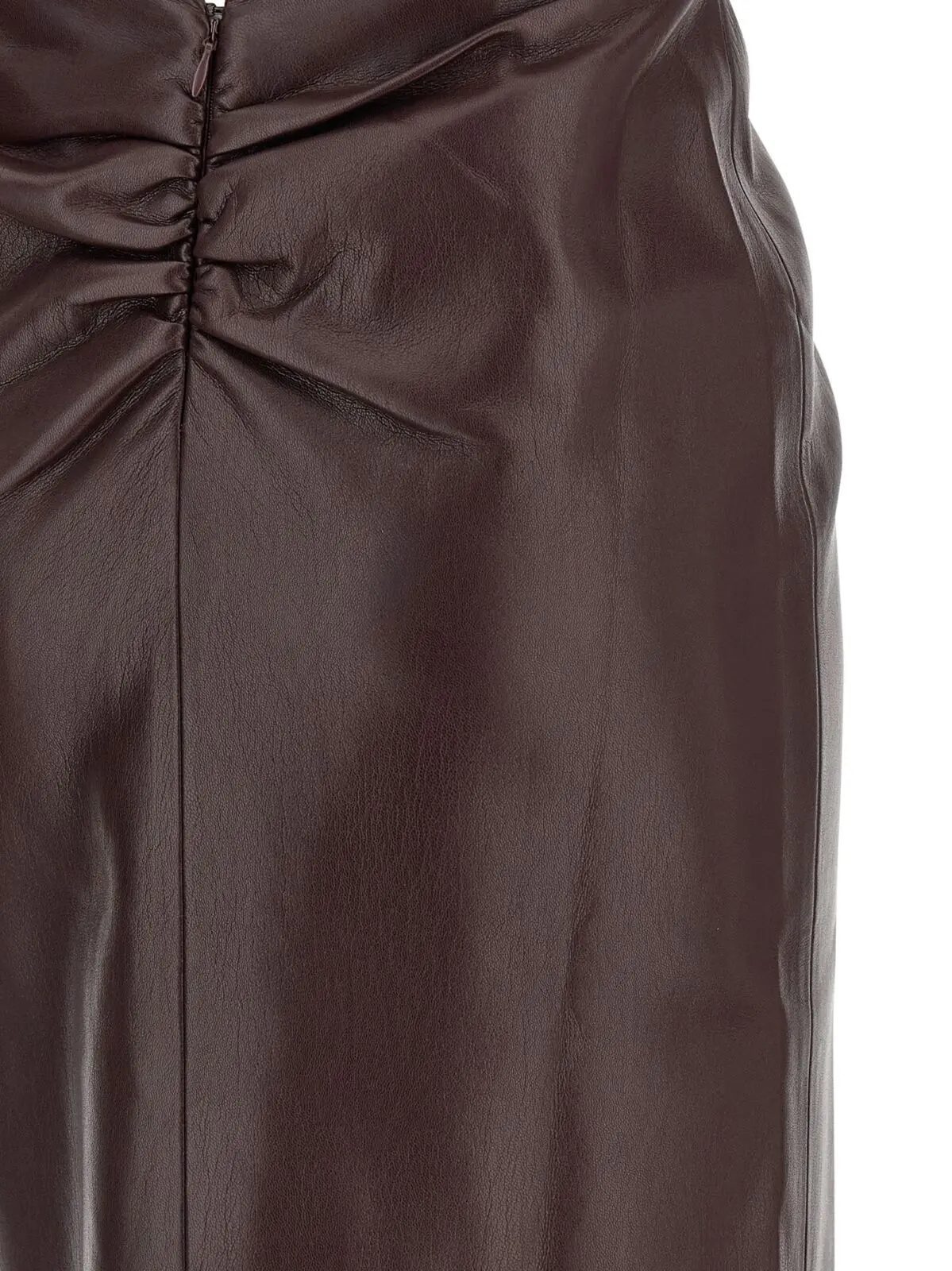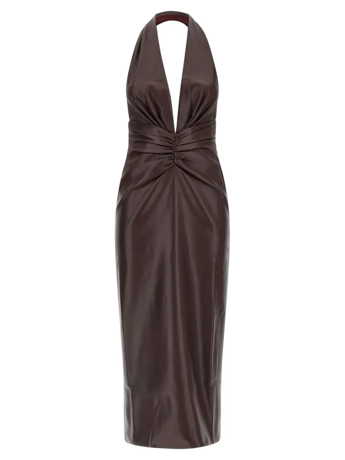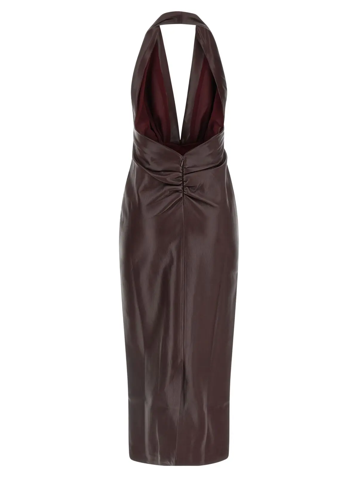 Ця бордова сукня міді з ефектом наппа поєднує інноваційний дизайн із вишуканою функціональністю: глибокий V-подібний виріз, відкриту спину та елегантний розріз позаду доповнено якісною підкладкою. Виготовлена з високоякісного поліестеру та поліуретану, вона підкреслює статус і неповторний стиль сучасної жінки.