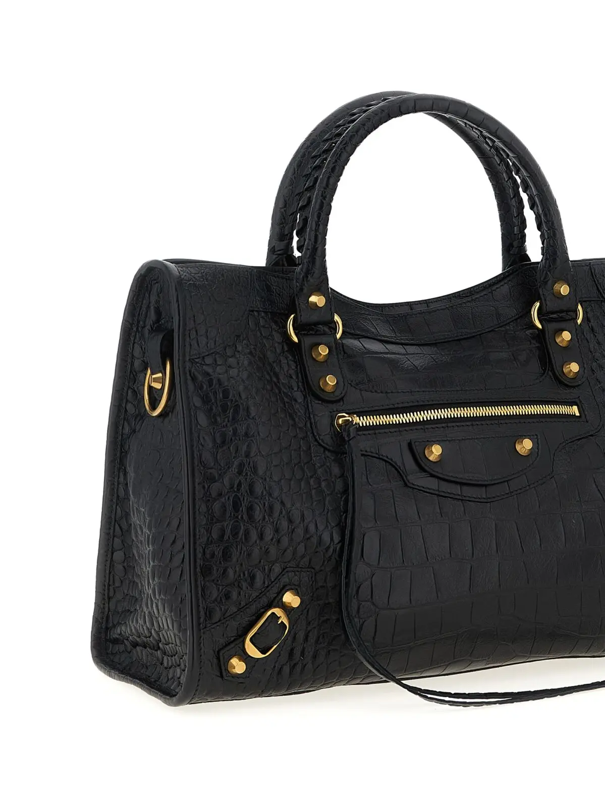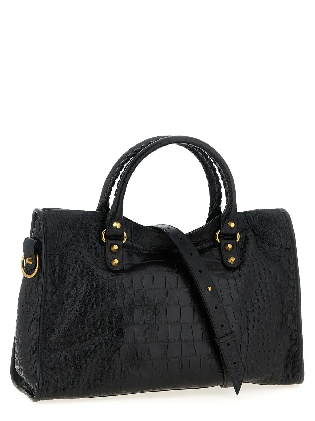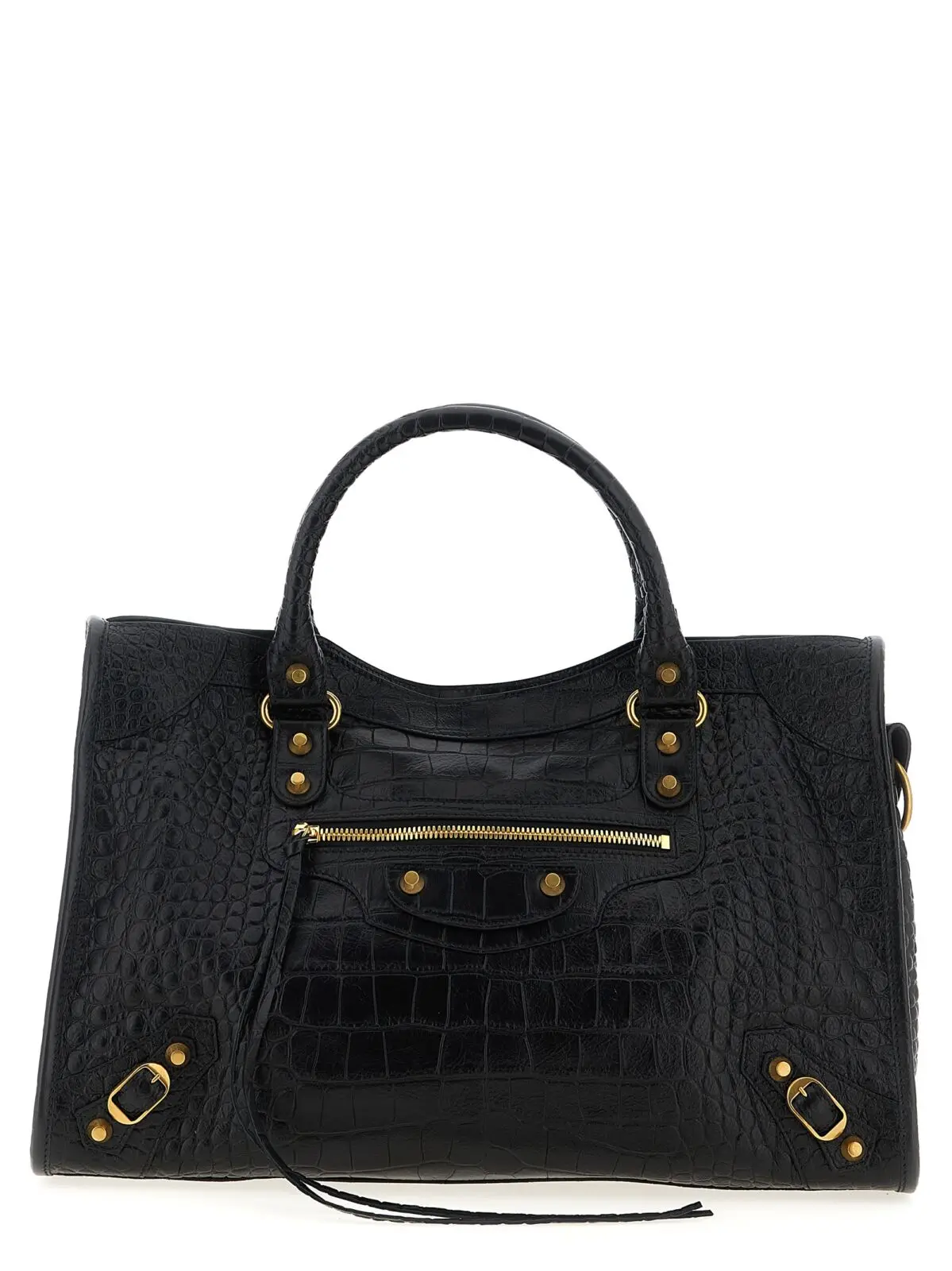 Ця сумка Balenciaga Le City Bag M виконана з високоякісної шкіри теляти з крокодиловим тисненням, що поєднує вишуканий дизайн із практичністю. Вона має подвійні ручки, верхню застібку на блискавку, металеві деталі з латунним покриттям та знімний регульований ремінь, забезпечуючи універсальність і стильний статус у будь-якій ситуації.