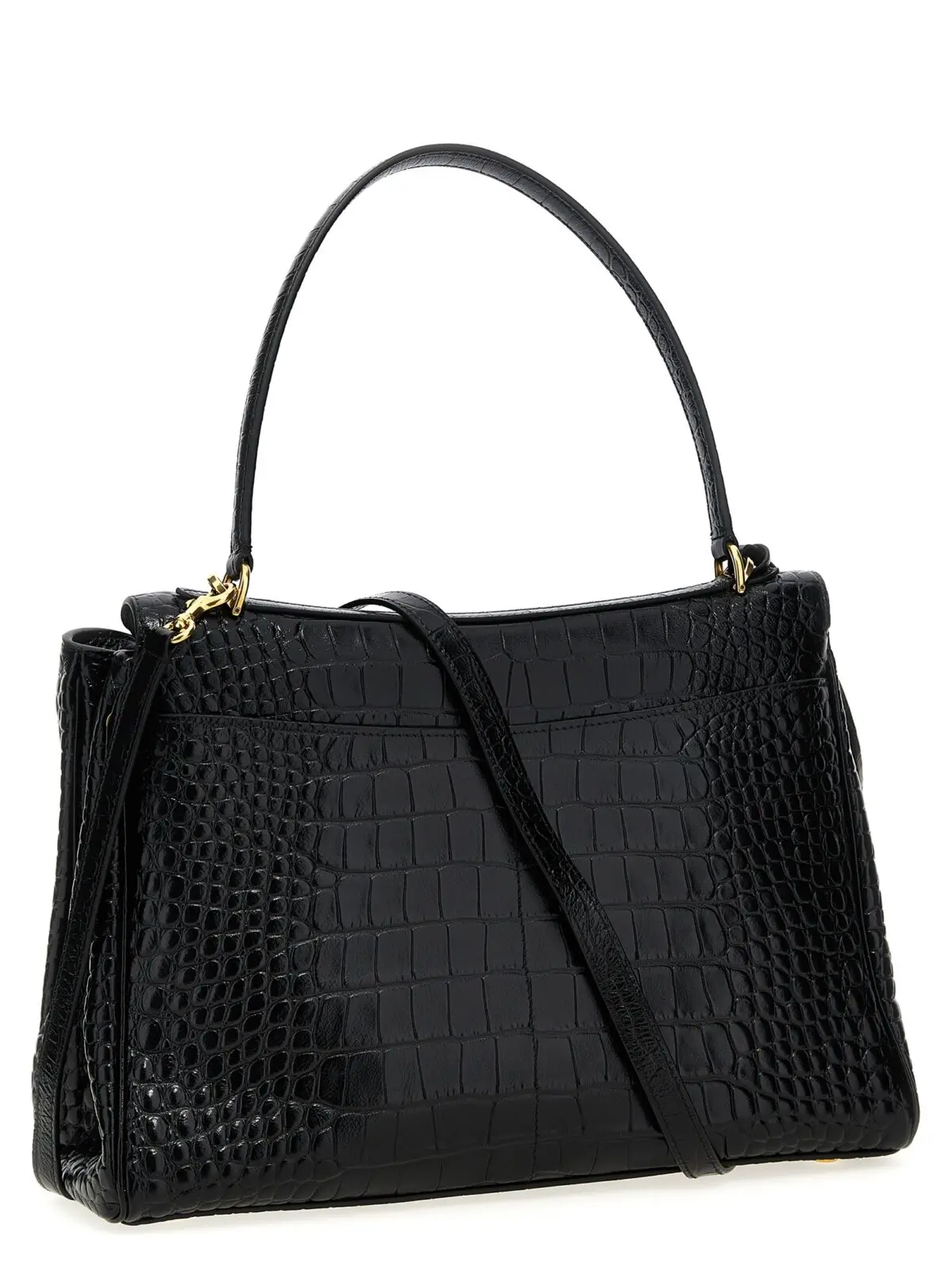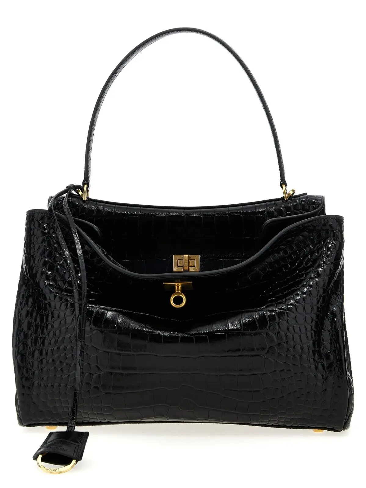 Вишукана сумка Balenciaga Rodeo M виготовлена з натуральної телячої шкіри з тисненням під крокодила, поєднує інноваційний дизайн із функціональністю завдяки металевому замку з поворотним механізмом, знімному плечовому ременю та зручній фіксованій ручці. Цей аксесуар підкреслює статус і бездоганний стиль, є універсальним вибором для впевнених у собі жінок.