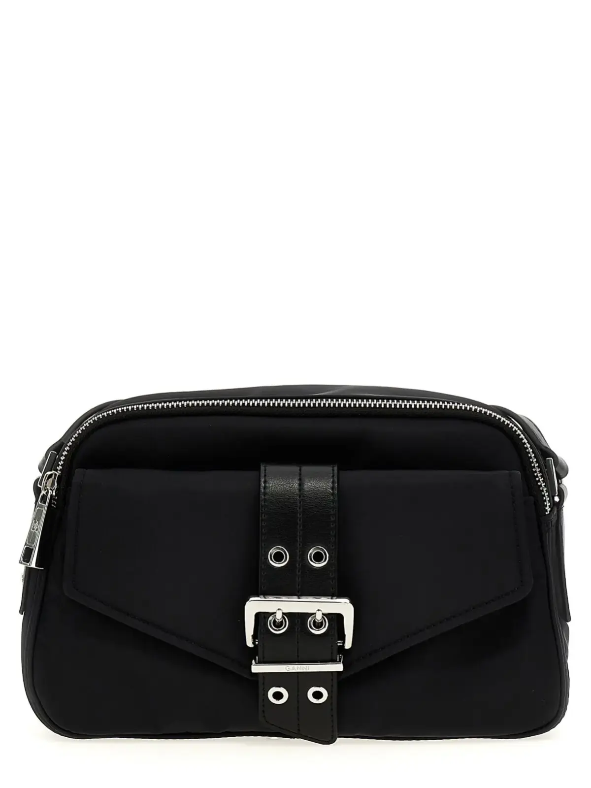 Сумка через плече Ganni Bucky в елегантному чорному кольорі поєднує стиль і функціональність. Виконана з переробленого нейлону, вона втілює сучасні екологічні тренди. Дизайн з елементами шкіри та металевими деталями надає їй вишуканого вигляду. Практичний застібка на блискавці, передня кишеня під flap та регульований ремінь роблять цю сумку універсальним аксесуаром для будь-якої нагоди, підкреслюючи ваш статус і стиль.