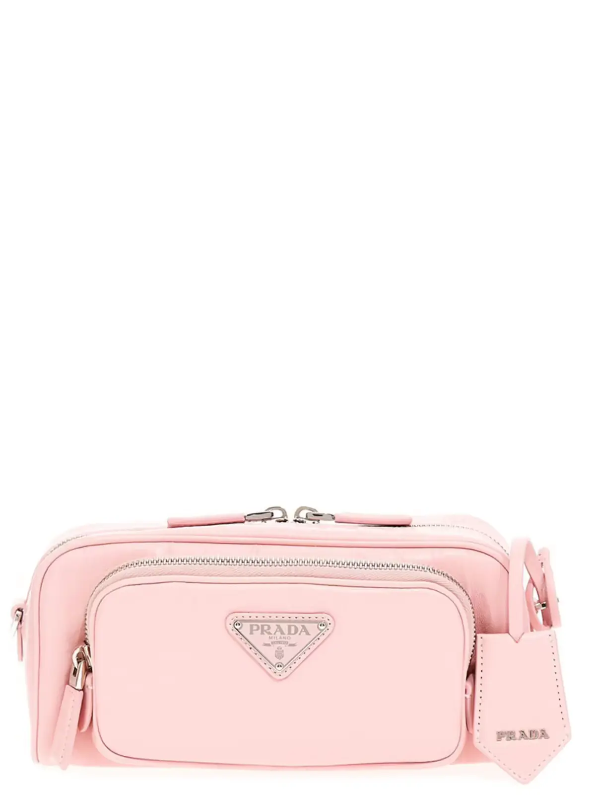 Жіноча рожева сумка через плече від Prada, виконана з антикварної напи, прикрашена трикутним металевим логотипом з емаллю. Модель має зовнішню кишеню на блискавці, регульований та знімний плечовий ремінь, а також шкіряний бирок з логотипом. Закривається на блискавку, що забезпечує безпеку ваших речей.
