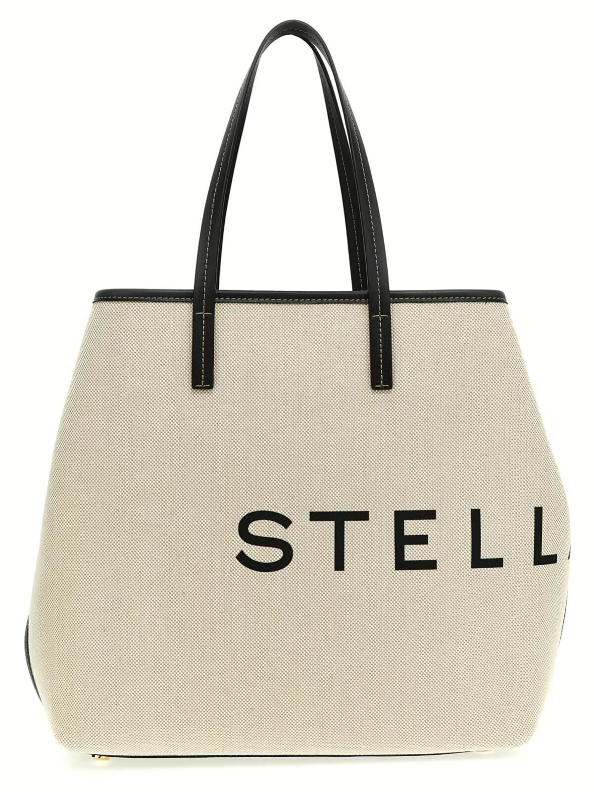Нова бежева жіноча сумка для шопінгу від Stella McCartney з логотипним принтом і деталями з еко-шкіри. Вона має подвійну ручку, відстібний внутрішній клатч і виготовлена з 56% бавовни та 44% поліестеру.