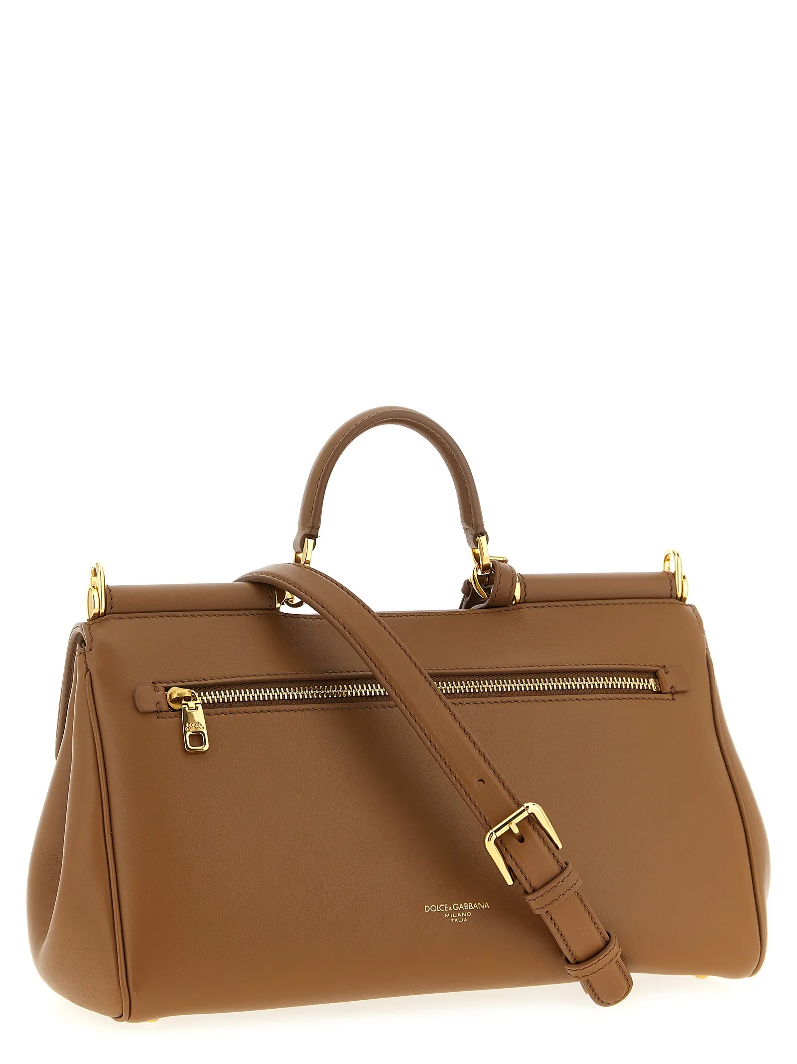 Елегантна сумка My Sicily з колекції Dolce Gabbana виготовлена з преміальної телячої шкіри з делікатною текстурою, оснащена міцною кришкою з унікальним застібанням і металевою табличкою з витонченим гравіюванням. Функціональний дизайн передбачає жорстке дно з металевими ніжками, задню кишеню на блискавці та регульований знімний ремінь, що підкреслює статус і витончений стиль власниці, поєднуючи інновації з універсальністю для будь-яких образів.