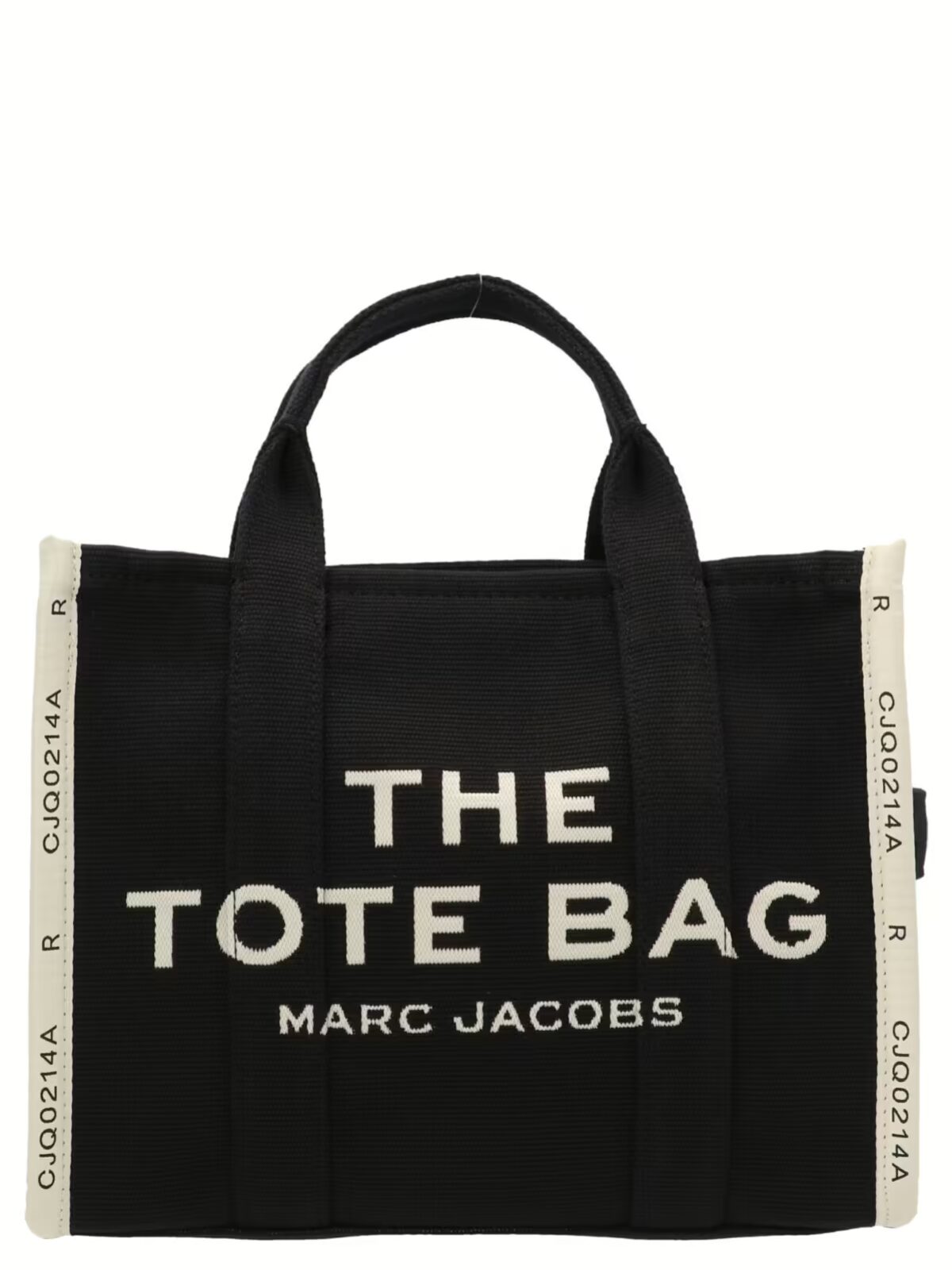 Сумка Jacquard Medium Tote від Marc Jacobs – це чорно-біла жіноча сумка з бавовняного полотна з верхнім блискавковим застібкою, вишитим логотипом на передній частині, із регульованим плечовим ременем.