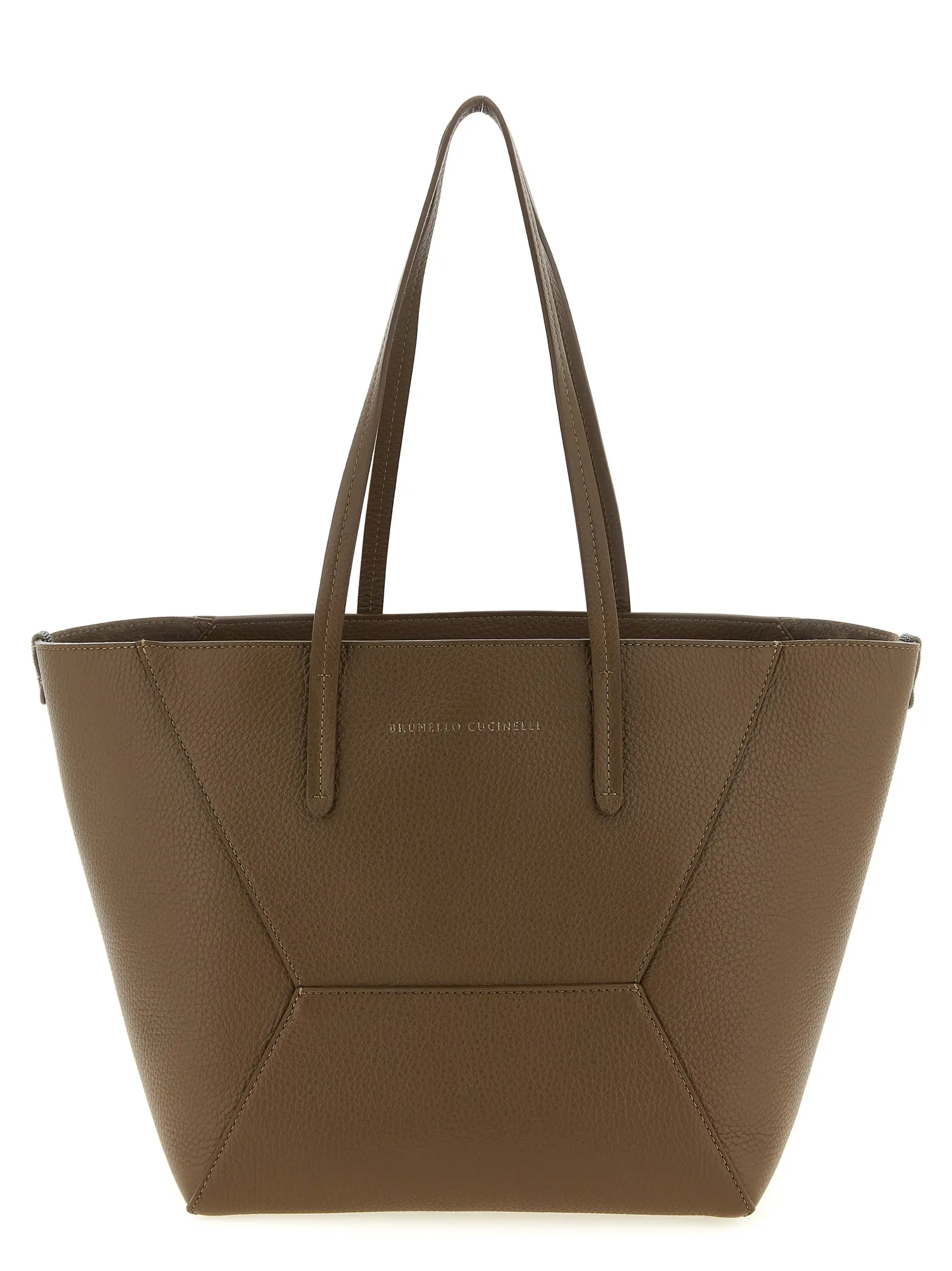 Панельна конструкція створює виразний об’єм, що миттєво зачаровує своєю вишуканою геометрією. Натуральна зерниста шкіра випромінює шляхетний спокій, доповнений філігранним декором Monile вздовж бічних швів. Внутрішній карабін делікатно регулює місткість, доки знімний клатч додає образу особливої функціональної глибини.