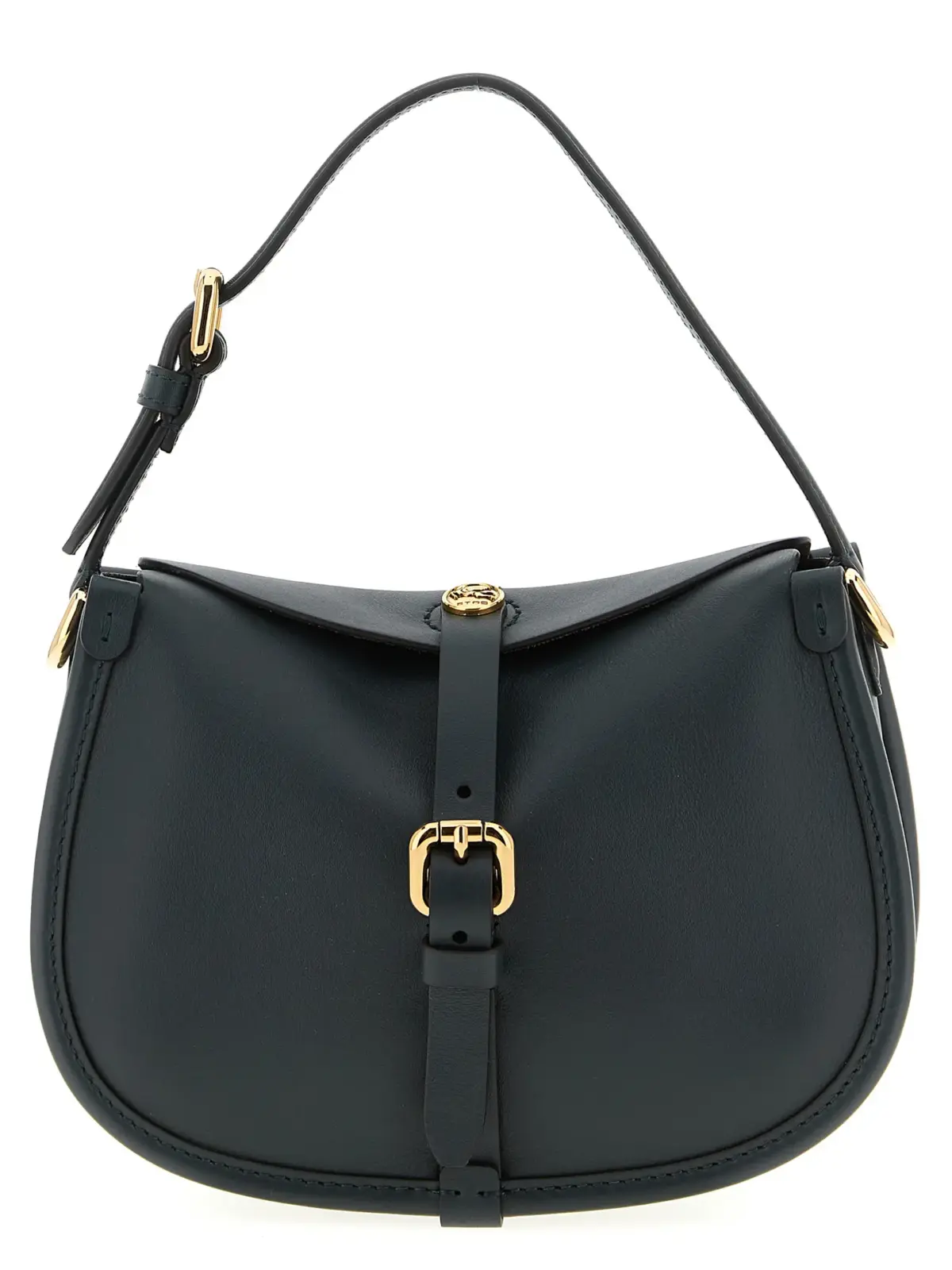 Витончена сумка крос-боді Etro Pony small виготовлена з високоякісної шкіри теляти, поєднує елегантний зелений відтінок з м’якою замшевою підкладкою, оснащена регульованим та знімним шкіряним ременем, магнітною застібкою з металевою кнопкою з гравіюванням бренду, що підкреслює її статус і універсальність у будь-якому образі.