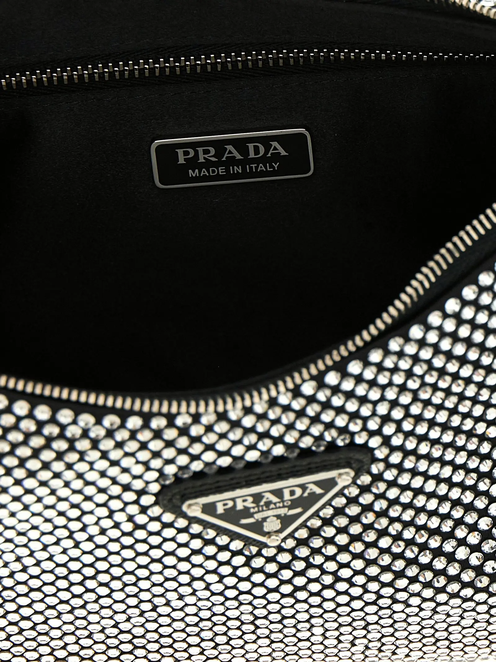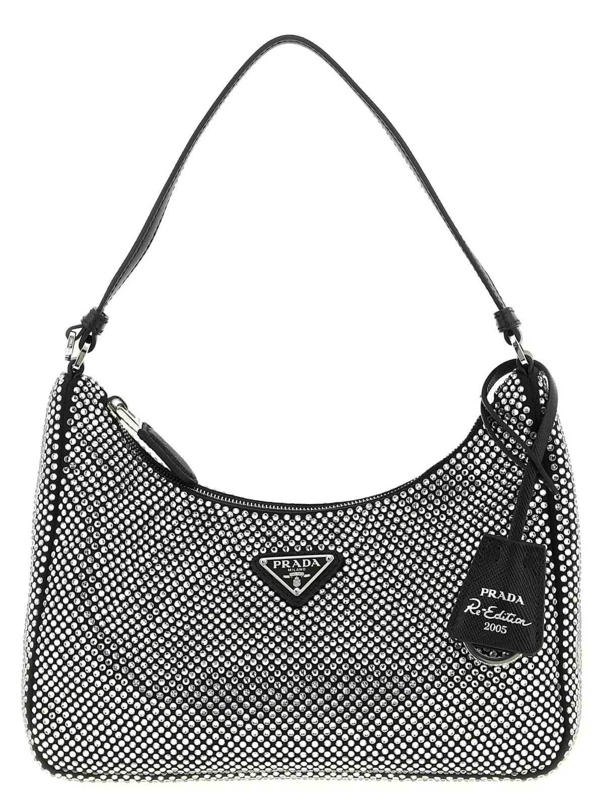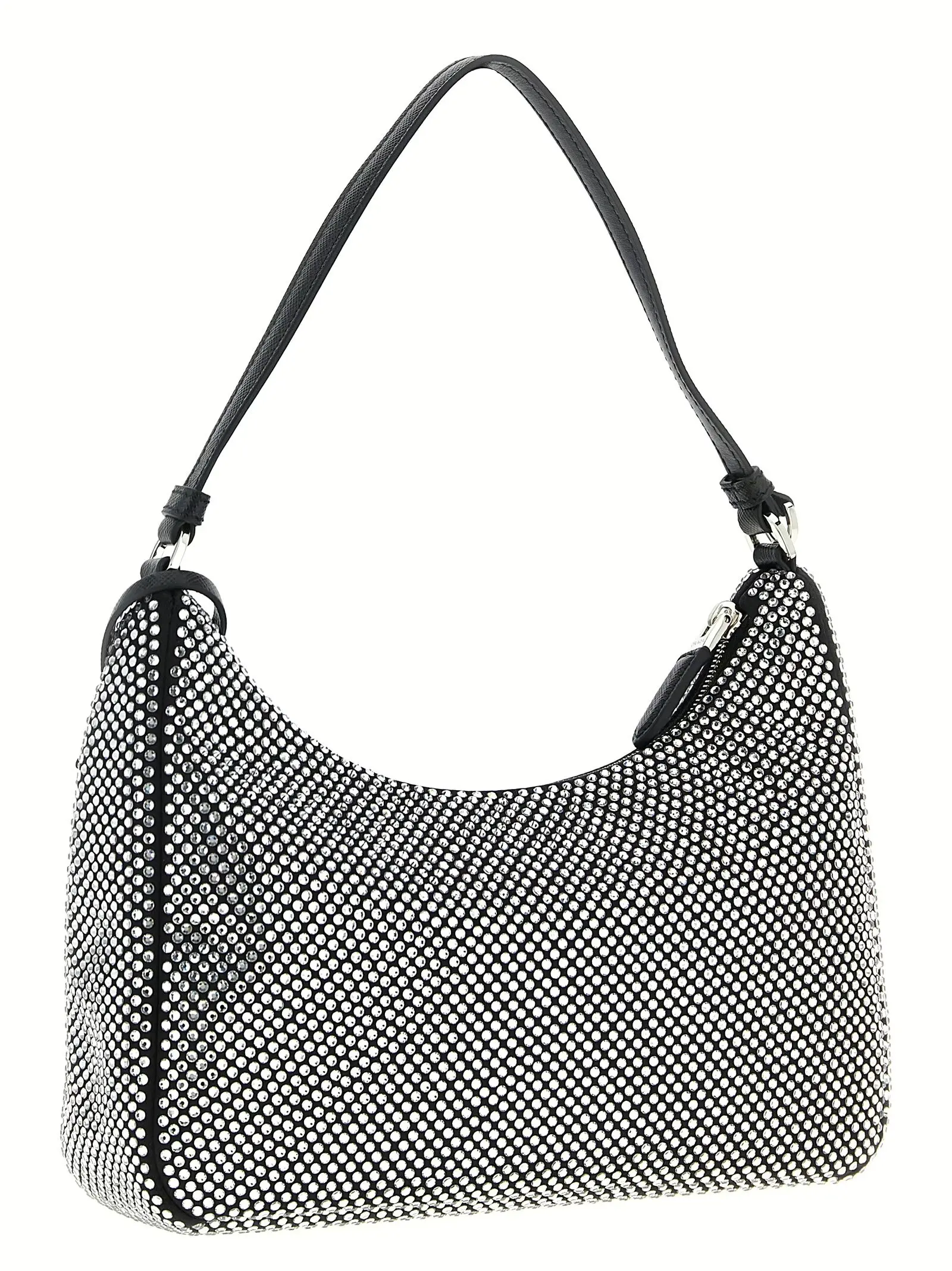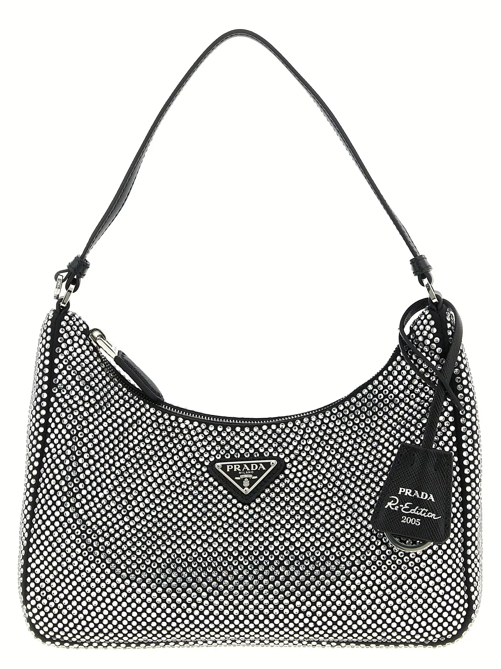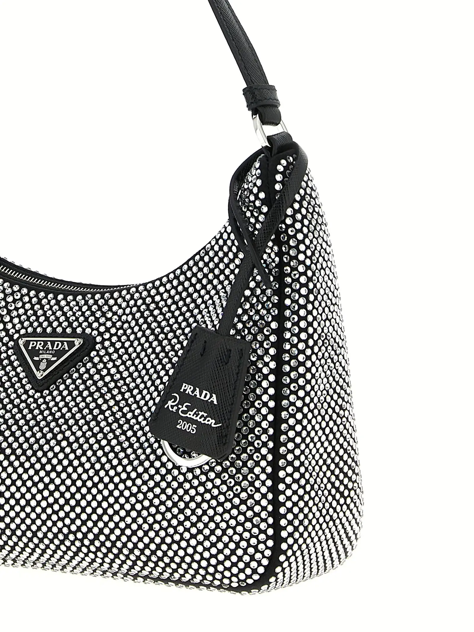 Вишукана сумка крос-боді Prada Re-Edition 2005 у чорному кольорі поєднує інноваційний дизайн із розкішними матеріалами: сатин, кристали та вставки з шкіри Сафіано. Вишуканий емальований металевий логотип та функціональні деталі підкреслюють бездоганний стиль і статус, роблячи аксесуар універсальним для будь-якого образу.