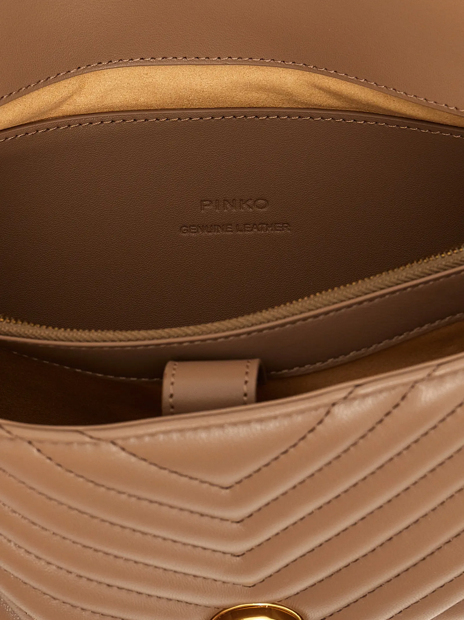 Вишукана сумка з натуральної шкіри з плісированою фактурою ніжного бежевого відтінку поєднує елегантний дизайн із функціональністю завдяки клапану з металевим логотипом та знімному ланцюжку й шкіряному плечовому ременю, підкреслюючи статус і неперевершений стиль сучасної жінки.