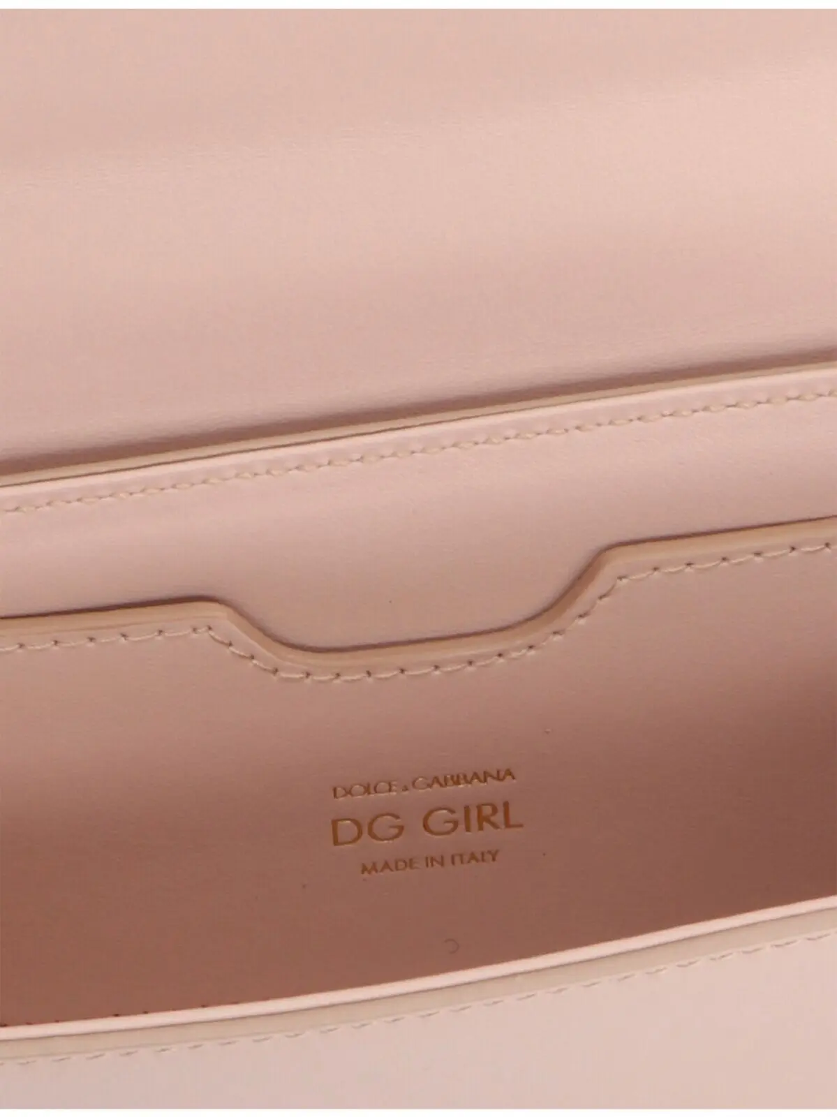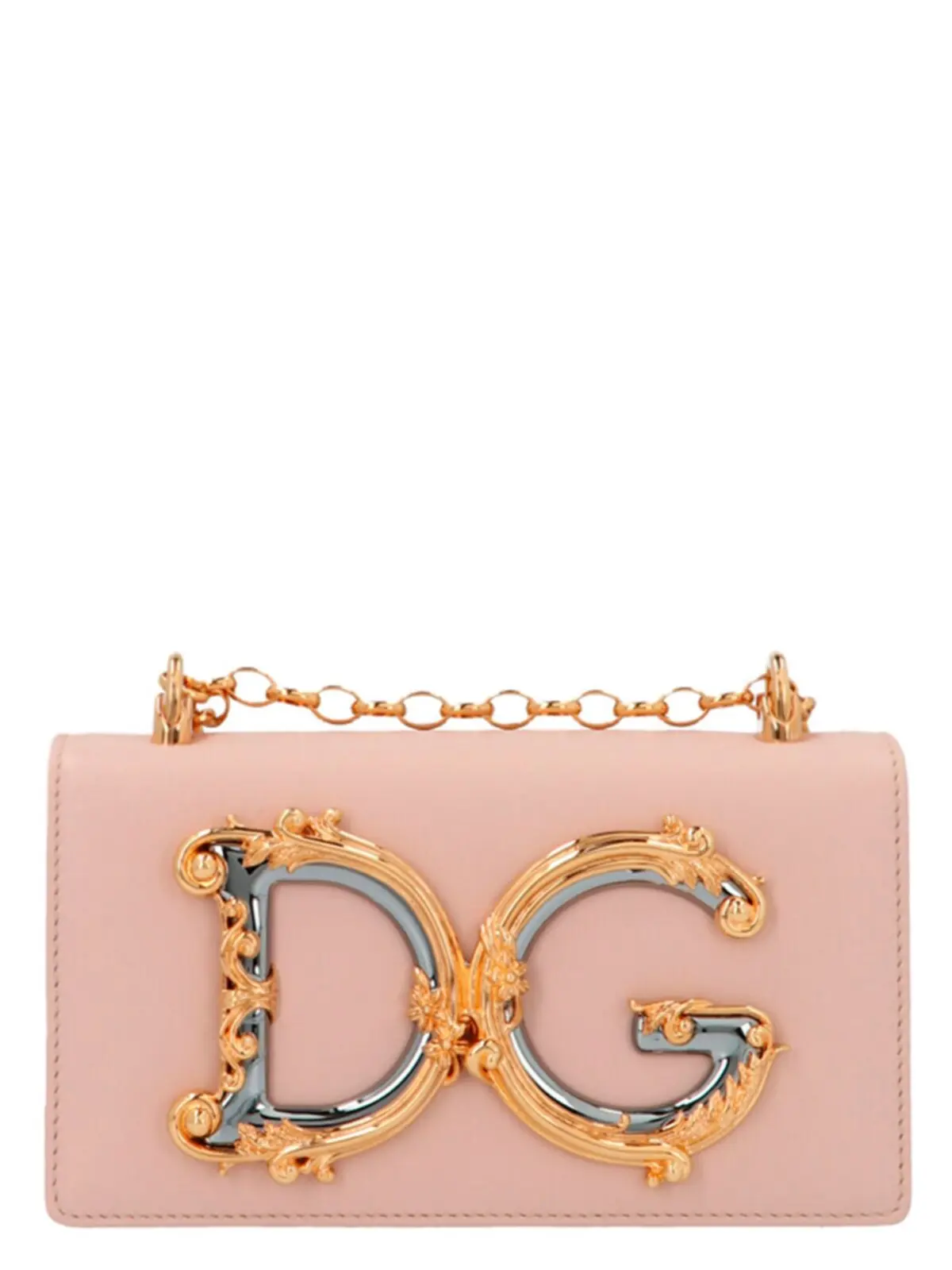 Жіноча міні-сумка DG Girl від Dolce & Gabbana виконана з рожевої телячої шкіри. Модель має золотисте лого та кріплення, клапан для закриття та ланцюжковий плечовий ремінь. Виготовлена з 100% ягнячої шкіри (Ovis Aries).