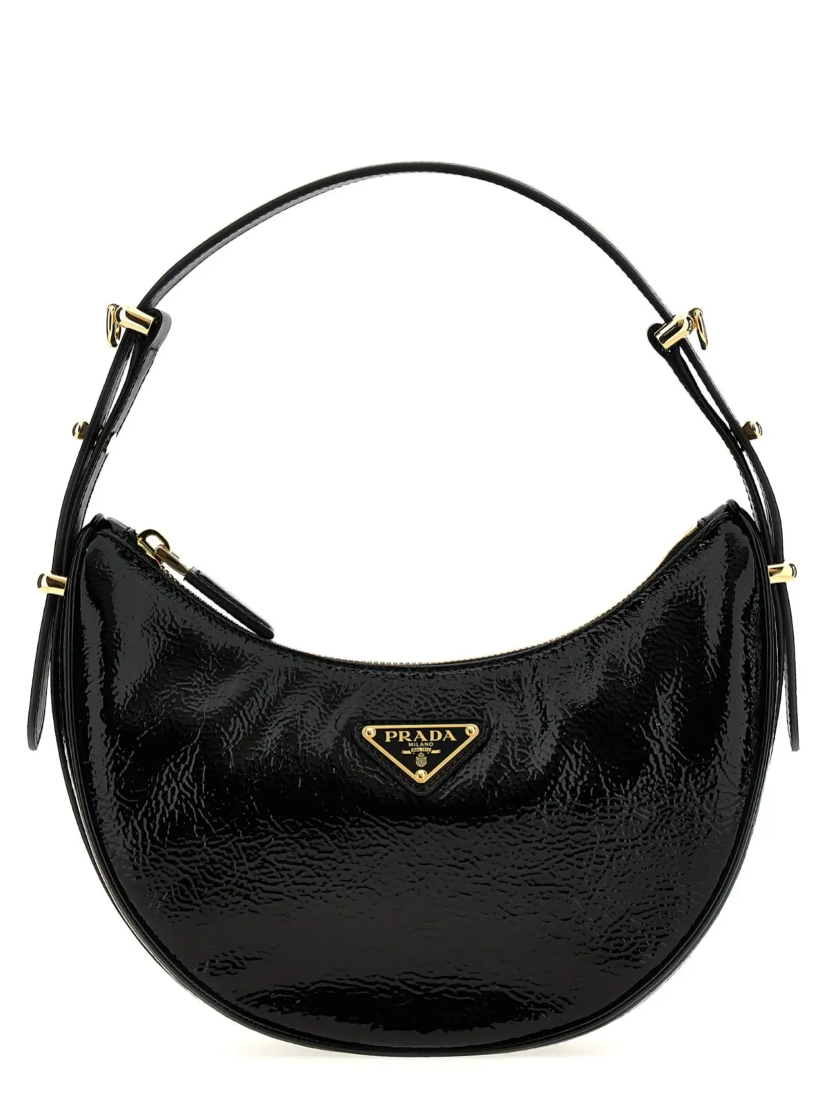 Сумка на плече Prada Arqué в елегантному чорному кольорі виготовлена з патентованої шкіри ягняти, що надає їй розкішного вигляду та приємного на дотик відчуття. Завдяки блискавці та емальованому металевому логотипу у формі трикутника, вона поєднує в собі стиль та функціональність. Регульовані та знімні ручки дозволяють адаптувати сумку до будь-якого образу, підкреслюючи статус та витонченість власниці. Інноваційність матеріалів робить цю сумку не лише естетично привабливою, але й практичною для повсякденного використання.