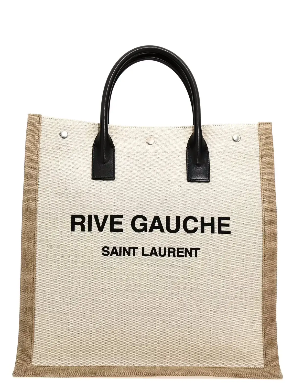 Чорно-біла чоловіча сумка для шопінгу Rive Gauche North/South від Saint Laurent. Виготовлена з полотна з додаванням шкіри, має принт логотипу на передній частині, подвійну шкіряну ручку та застібку на кнопку. Виготовлена з 50% бавовни та 50% льону.