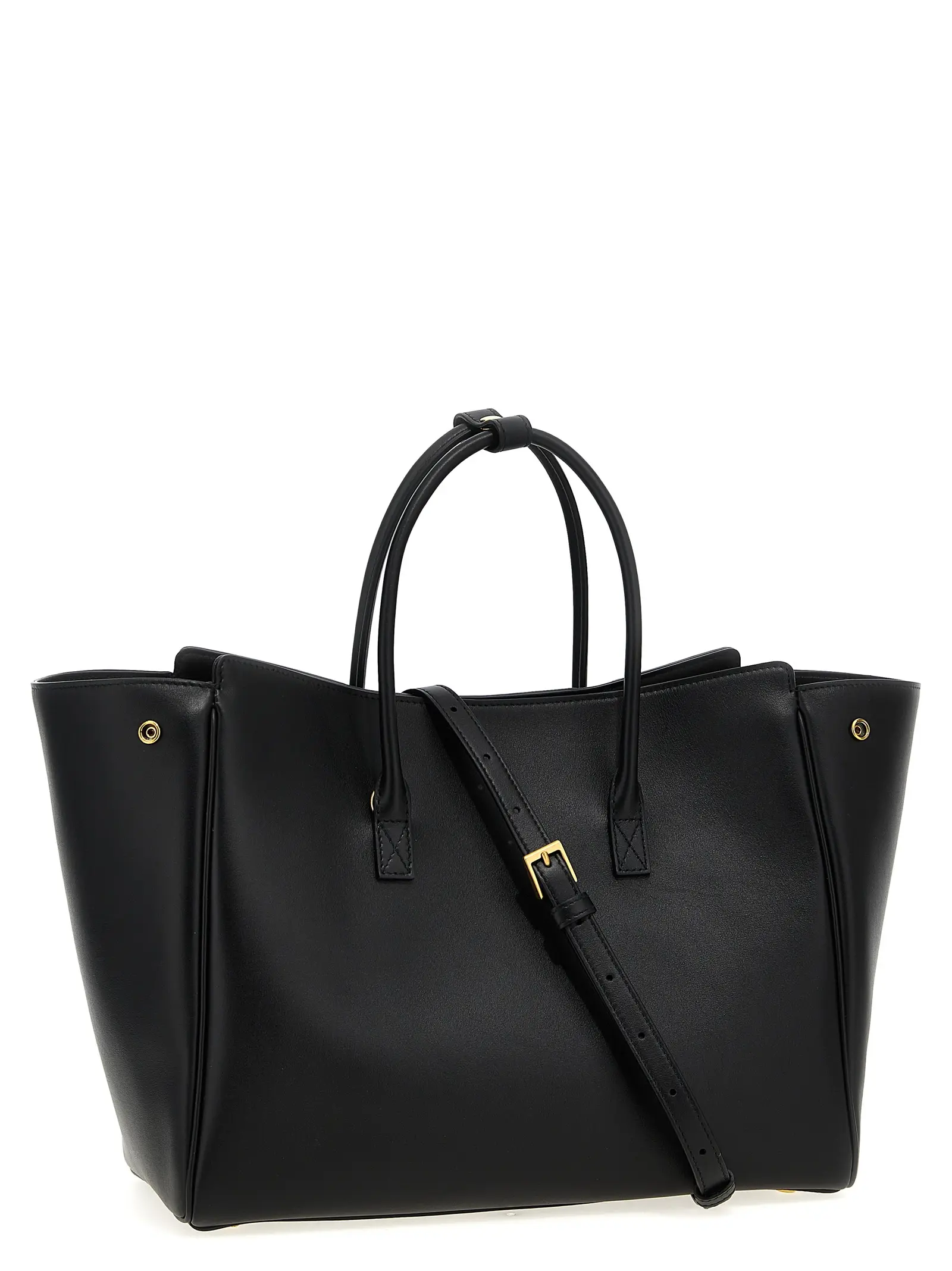 Вишукана сумка-шопер з гладкої телячої шкіри чорного кольору, оздоблена витонченим тисненням логотипу та металевими деталями з антикварним ефектом. Модель поєднує стиль і функціональність завдяки подвійним ручкам, магнітній застібці, регульованому знімному ремінцю та знімному брелоку, підкреслюючи статус і бездоганний смак власниці.