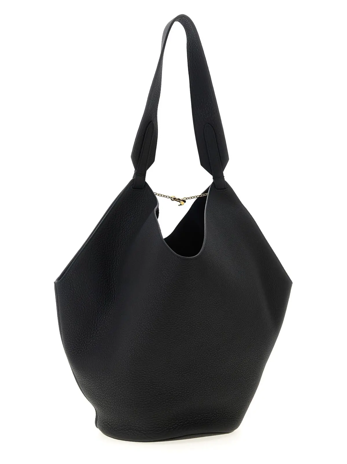 Чорна сумка-шопер Lotus Small виготовлена з натуральної телячої шкіри найвищої якості, оснащена фіксованою ручкою та вишуканою застібкою з позолоченого металу у вигляді крила. Її елегантний дизайн з тисненим логотипом сполучає інноваційність і універсальність, підкреслюючи бездоганний стиль і статус власниці.