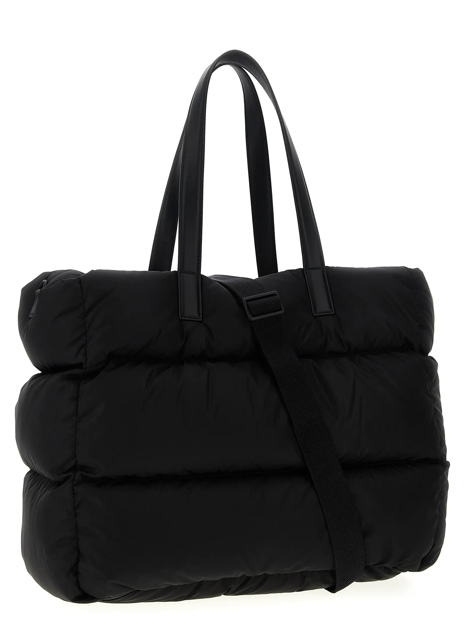 Чорна чоловіча сумка-шопер виконана з водовідштовхувального стьобаного нейлону, оснащена подвійними шкіряними ручками та регульованим знімним плечовим ременем для максимальної зручності. Витончений дизайн із тонованою логотипною нашивкою підкреслює вишуканий стиль і статус, поєднуючи інноваційність матеріалів та універсальність функціональності.